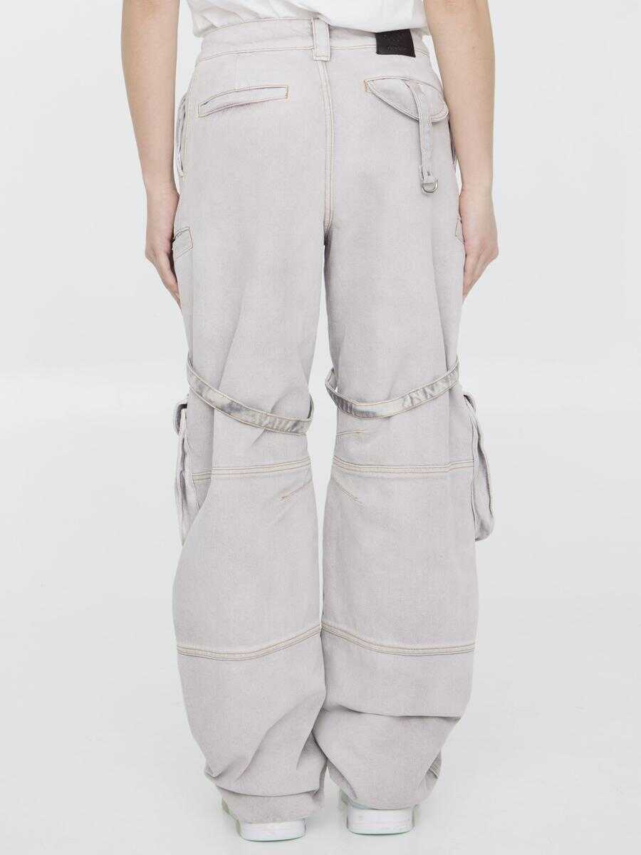 Laundry cargo jeans in délavé lilac cotton denim with contrast topstitching. It features button closure, cargo pockets with buckles and harness-style details. Baggy fit.