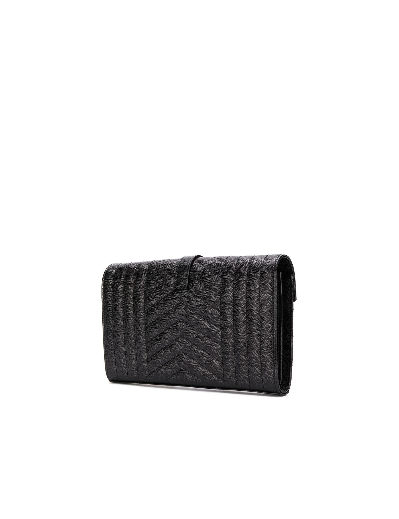 Pouch in black grain de poudre grained calfskin with vertical, chevron and matelassé quilting mix. It features gold-tone metal YSL monogram on the front, adjustable and detachable chain shoulder strap, front flap with magnetic closure, two main interior compartments separated by a zip pocket, one interior flat pocket and ten interior card slots.