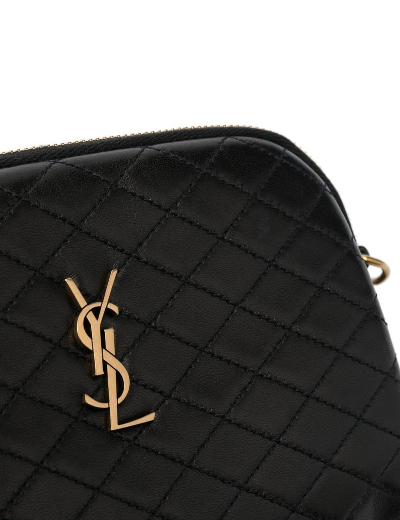 Gaby pouch in black quilted lambskin with gold-tone metal YSL monogram on the front. It features adjustable leather and chain shoulder strap, zip closure and a single interior compartment.