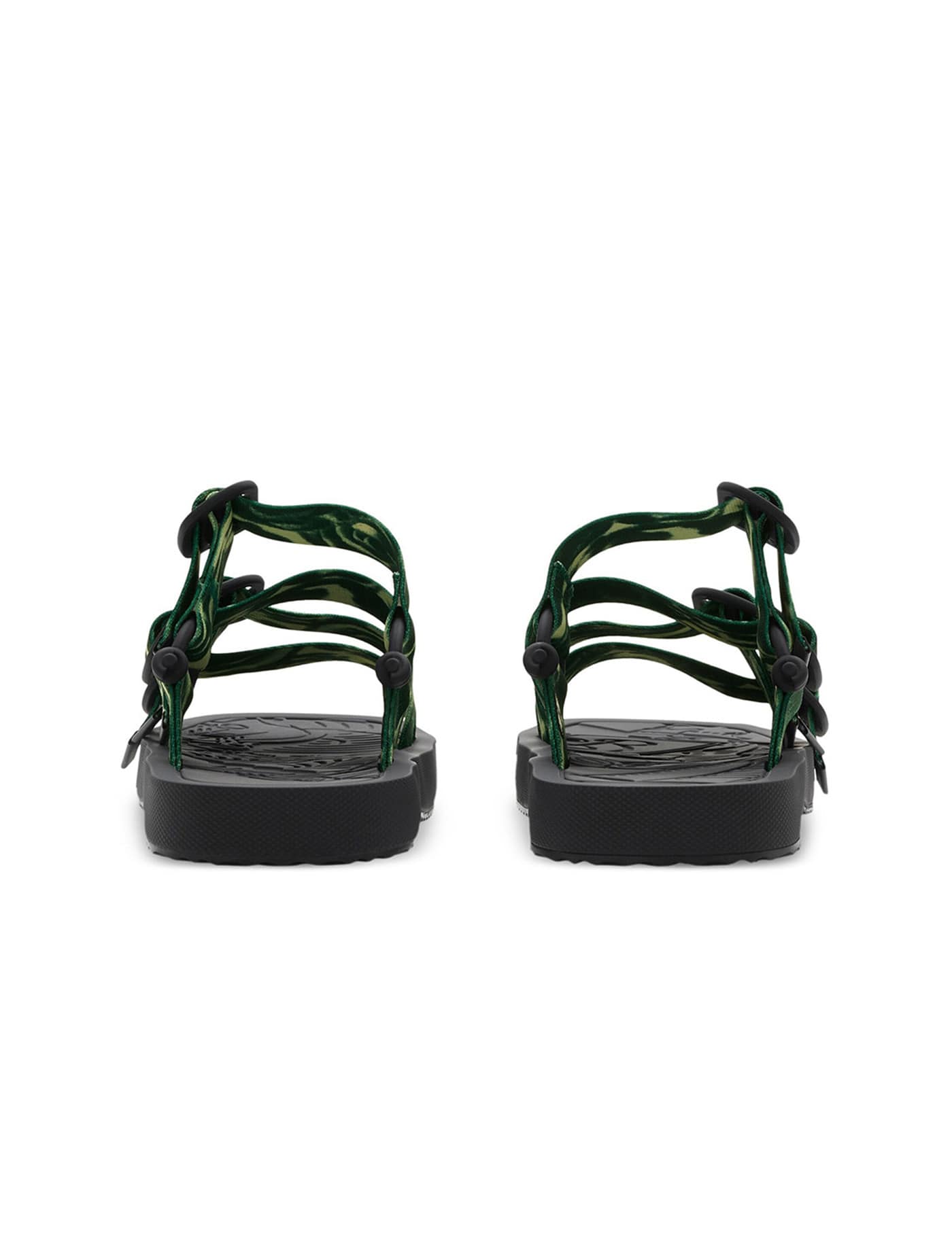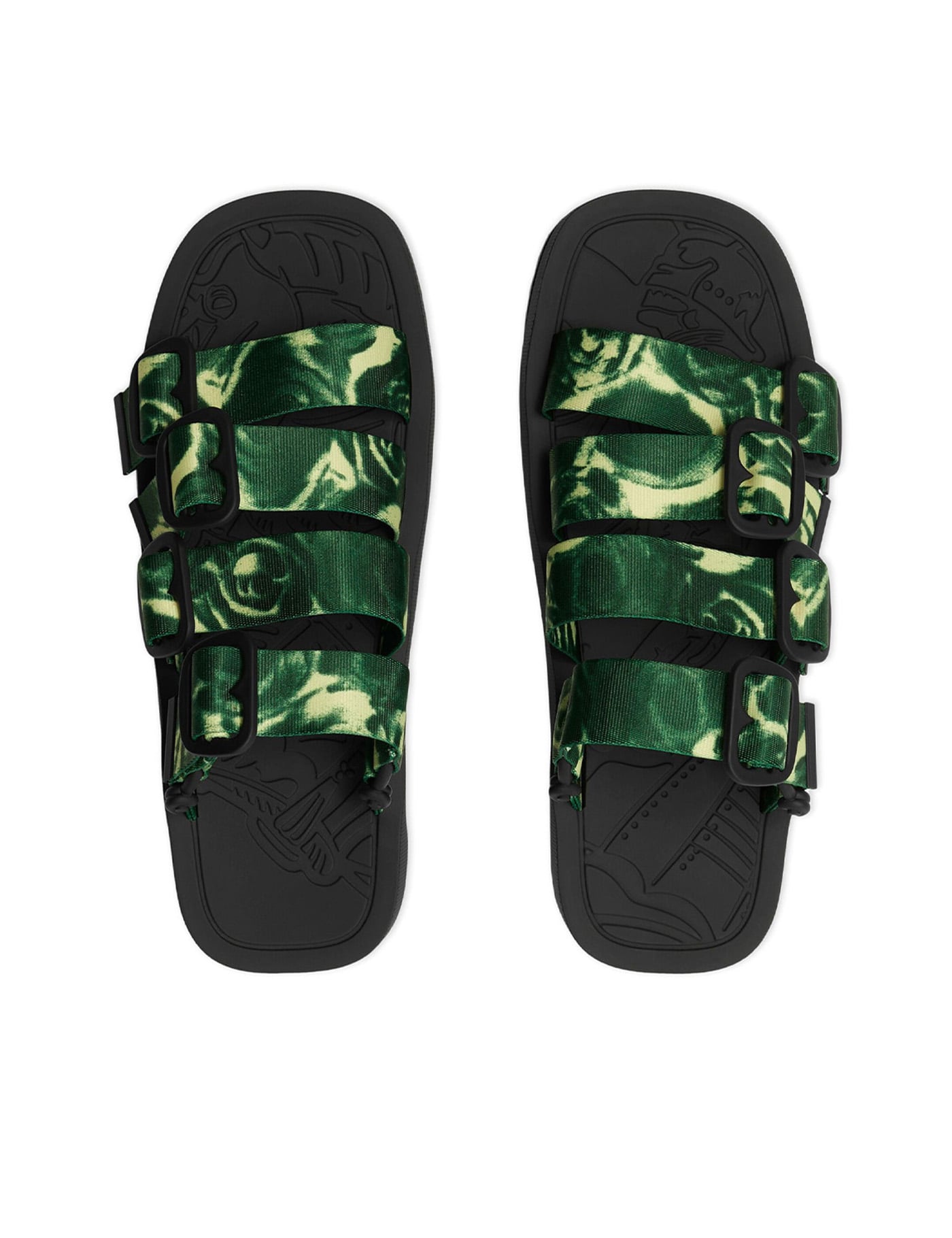 Burberry sandals with nylon ribbon straps enriched by a rose print and B-shaped buckles. The insole features the iconic Equestrian Knight Design, while the toe is square-shaped and the sole is made of rubber with a contrasting maxi logo lettering on the tread.