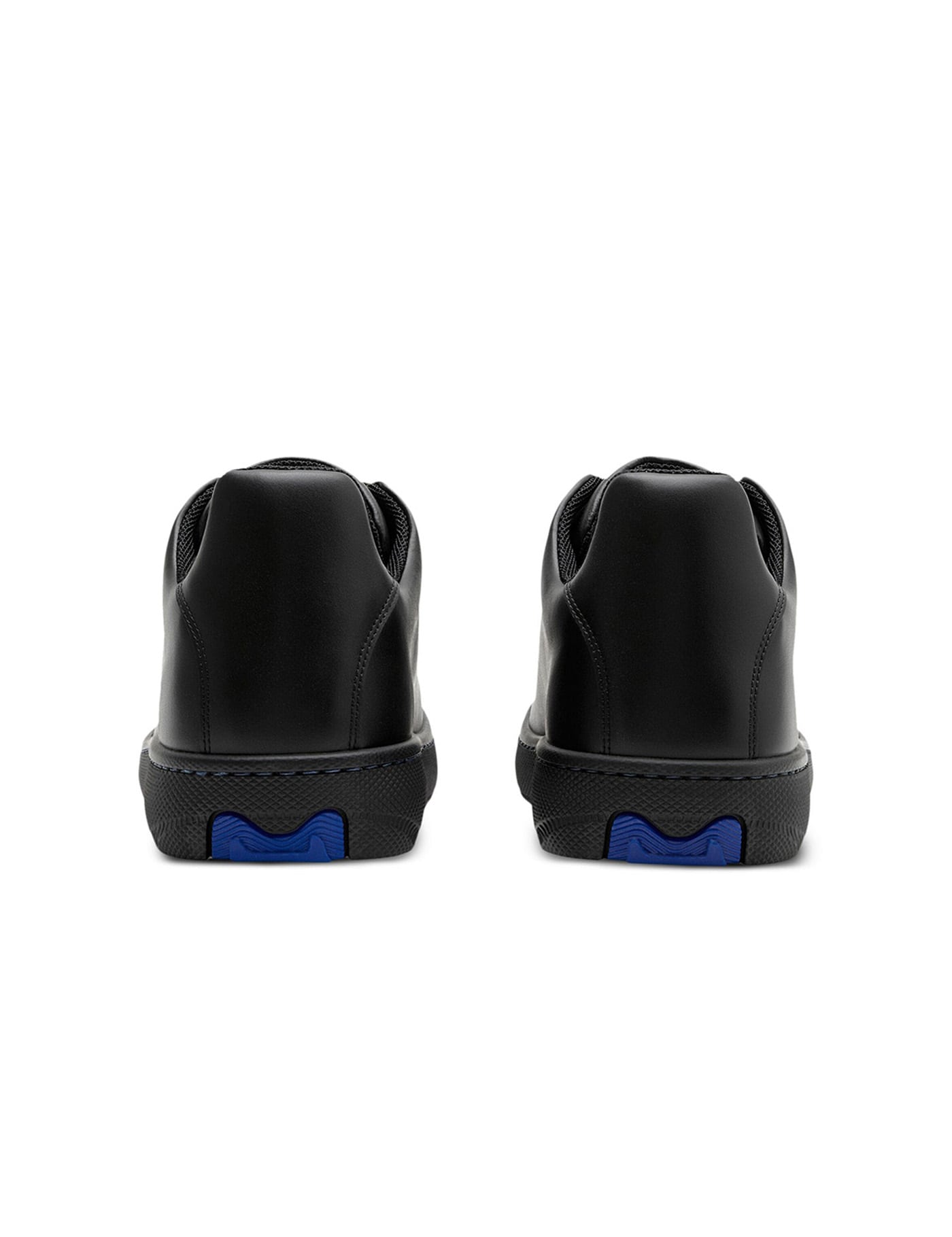 Burberry's Sneakers Box are made of smooth leather and embellished with an embossed Equestrian Knight Design on the side, as well as a barbed wire detail on the laces. They feature a square toe, a mesh-lined interior with a removable Check insole, and a molded rubber sole with a contrasting oversized logo.