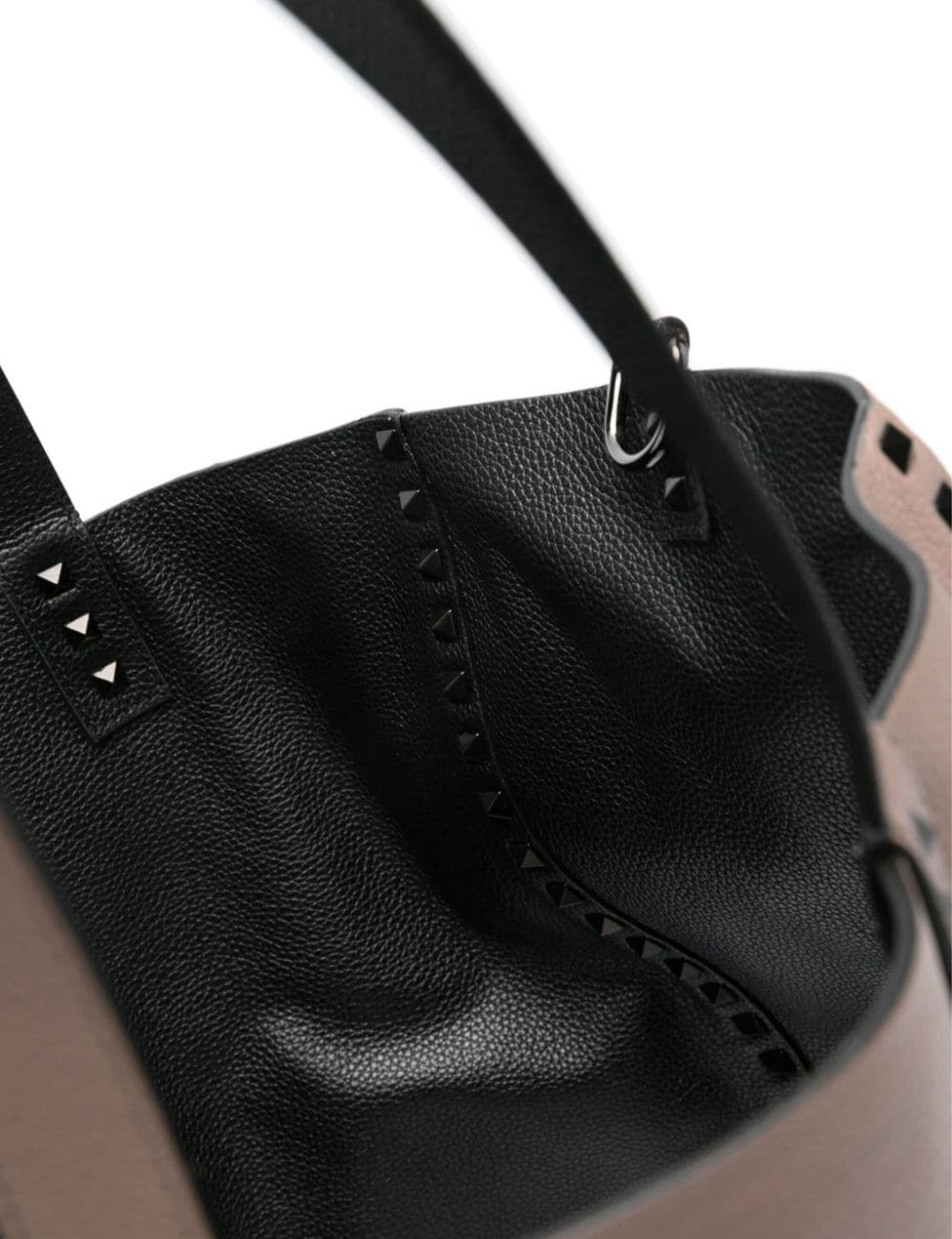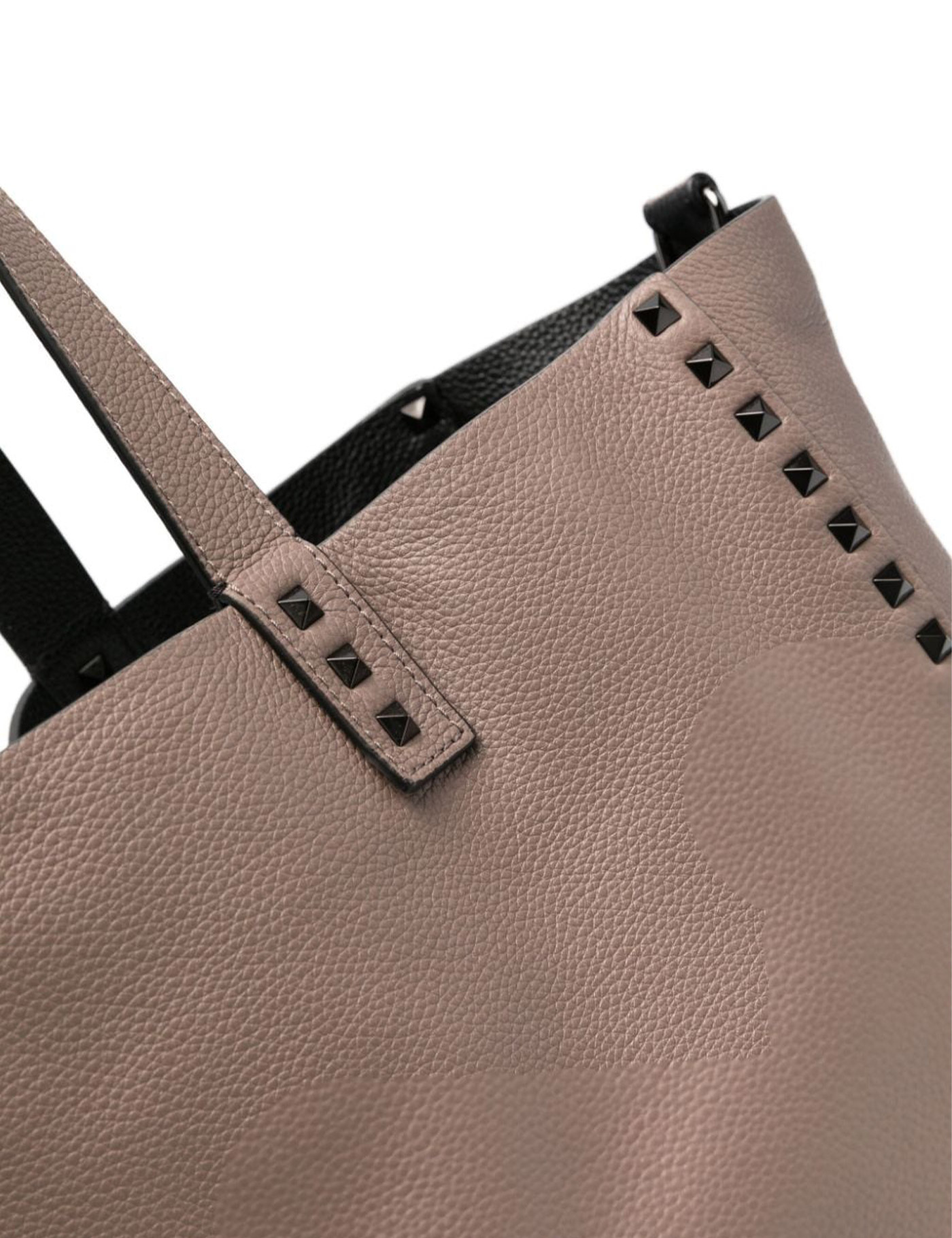 Calfskin Rockstud Shoulder Bag by Valentino Garavani, grained leather design, two flat top handles, iconic Rockstud studs appliqué on borders, removable flat shoulder strap, single interior compartment.