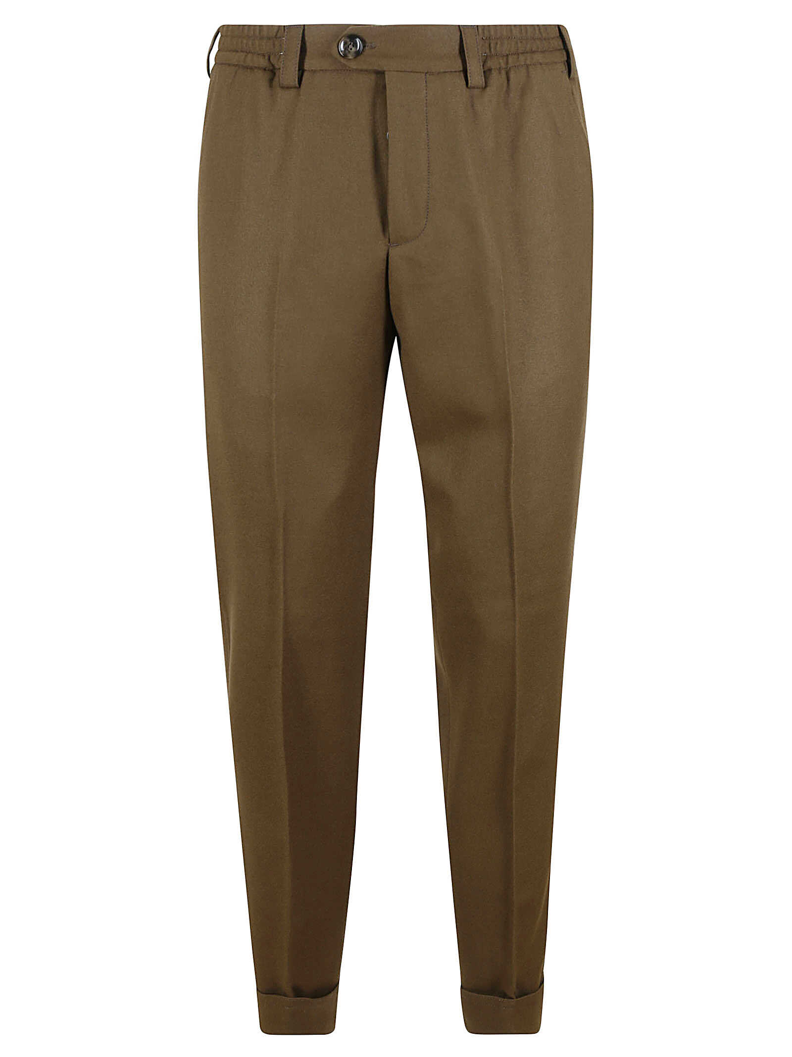 PT Torino Rebel wool trousers, soft fit, elastic waistband, button closure, belt loops and two back pockets with flap and button.