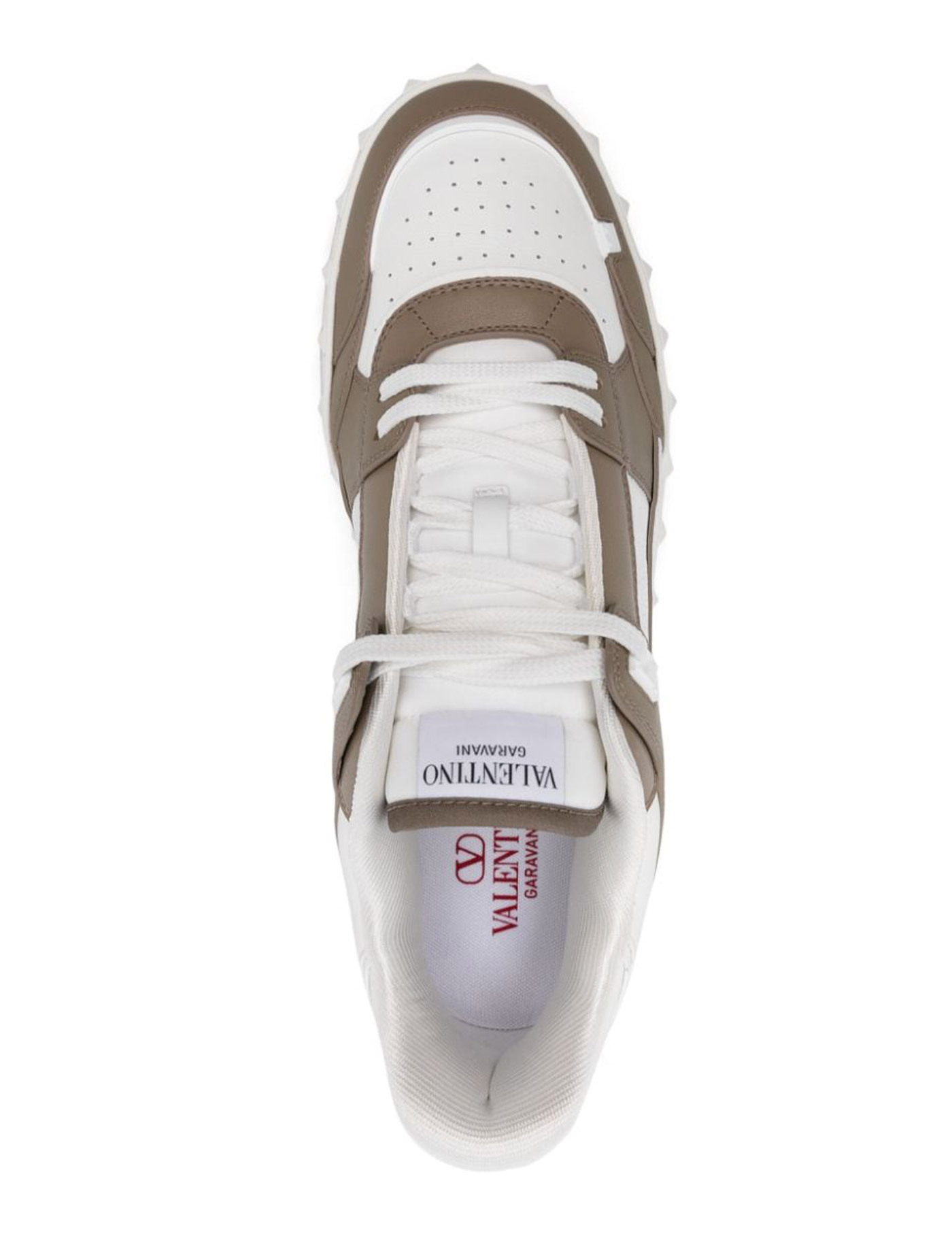 Freedots low-top sneakers by Valentino Garavani crafted in soft leather with contrasting smooth leather inserts and embossed logo on the outer side. Perforated toe and sides, visible stitching, fabric logo patch on tongue, fabric-lined interior with removable insole. Decorated with rubberized studs on welt and lettering logo detail on bottom of the rubber sole. Spare laces included.