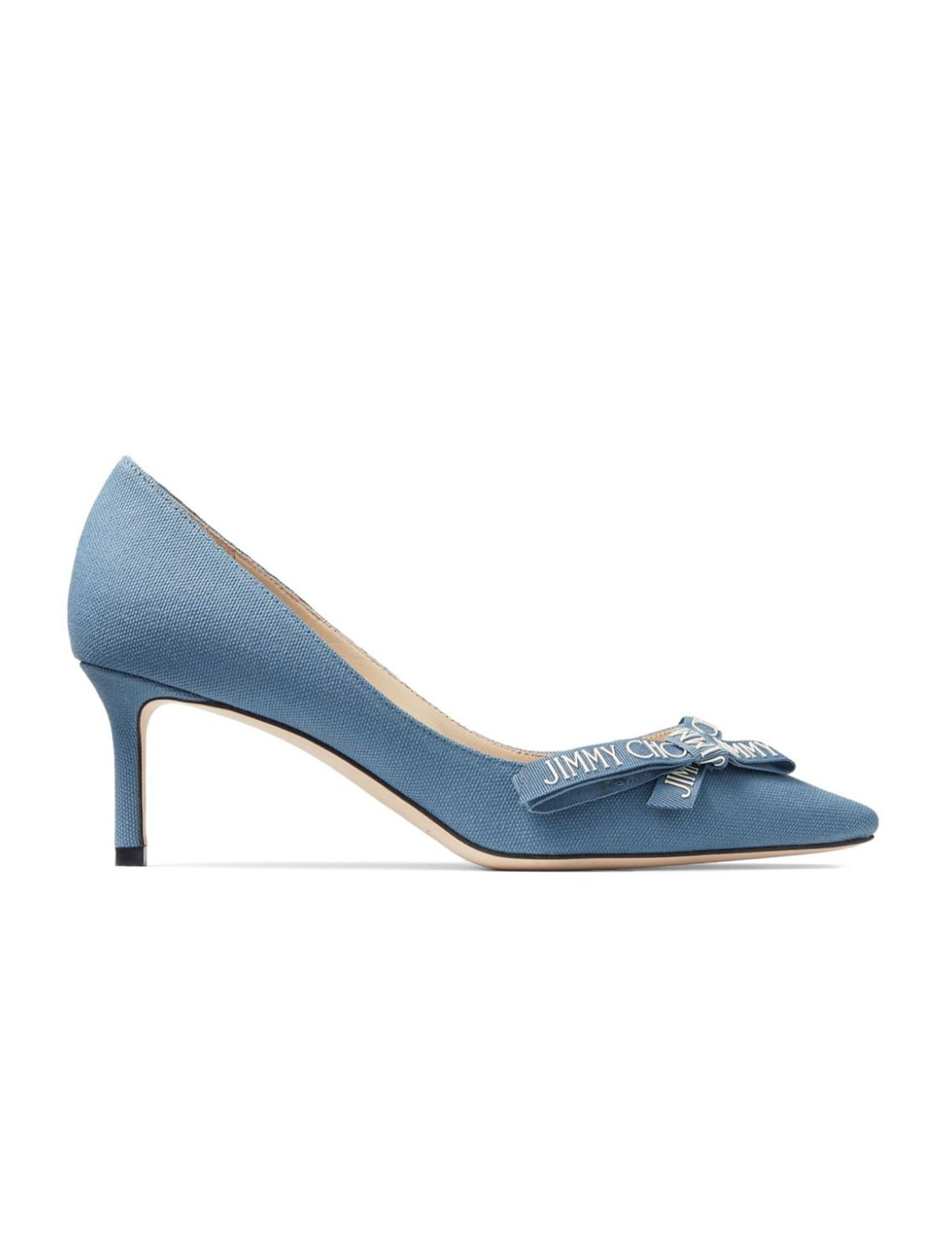 The Romy 60 Dé colleté s by Jimmy Choo are made of canvas and adorned with a branded grosgrain bow on the front. The interior is lined with leather, while the heel is covered and the sole is made of leather.