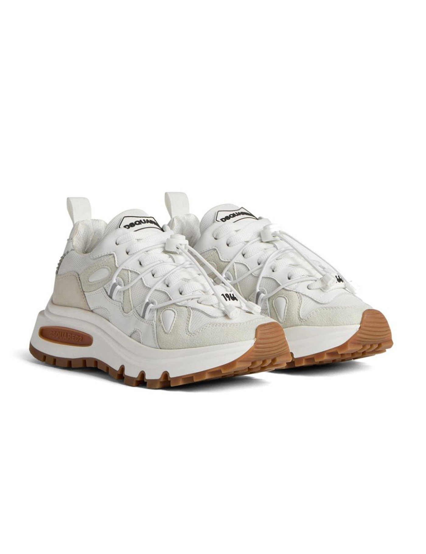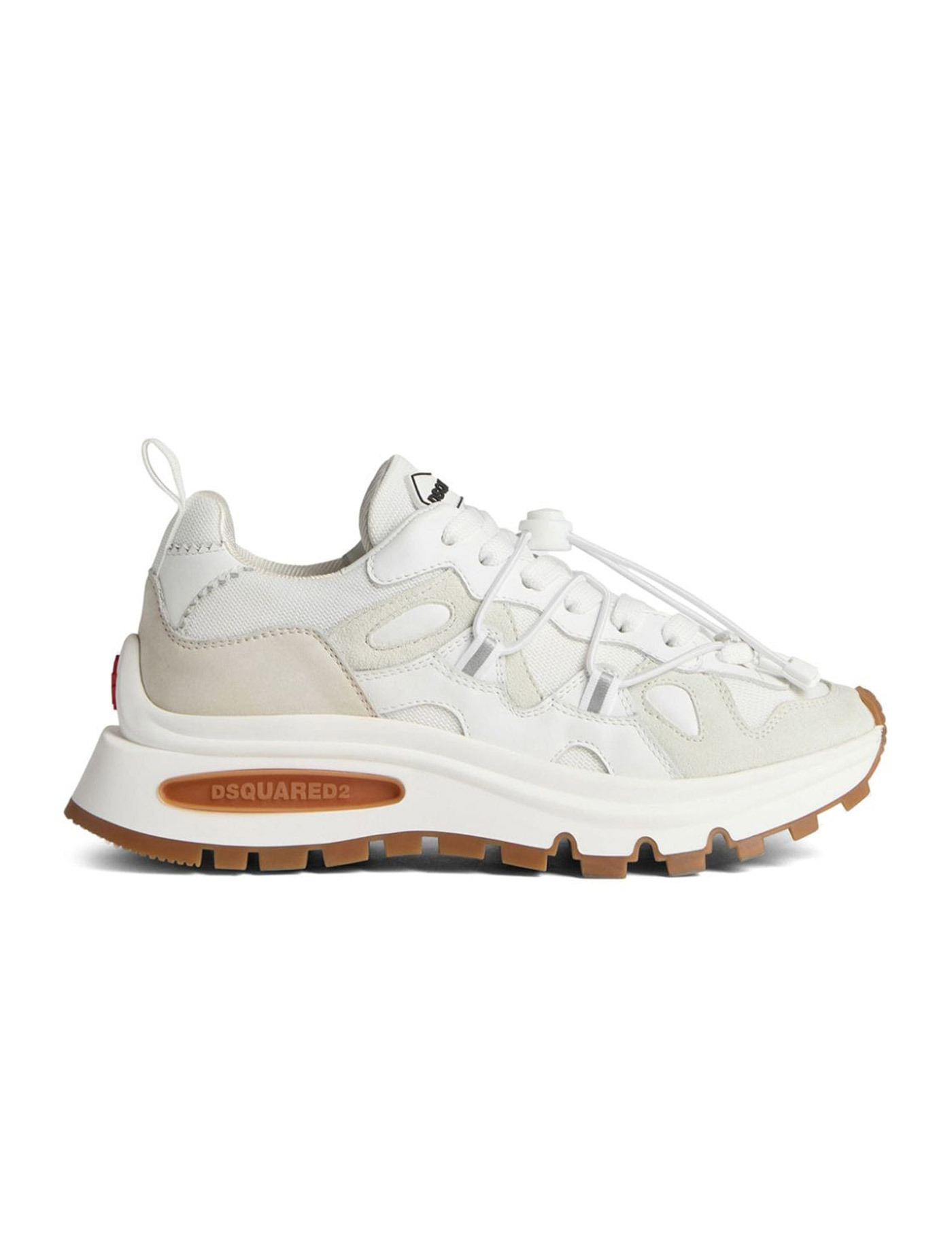 Runds2 sneaker by Dsquared2 made of leather, suede and mesh in shades of white. Rubberized logo on the tongue, mesh lining and leather insole. Loose-weave cotton laces and trekking-style drawstring. Maxi rubber sole, height 5 cm.