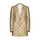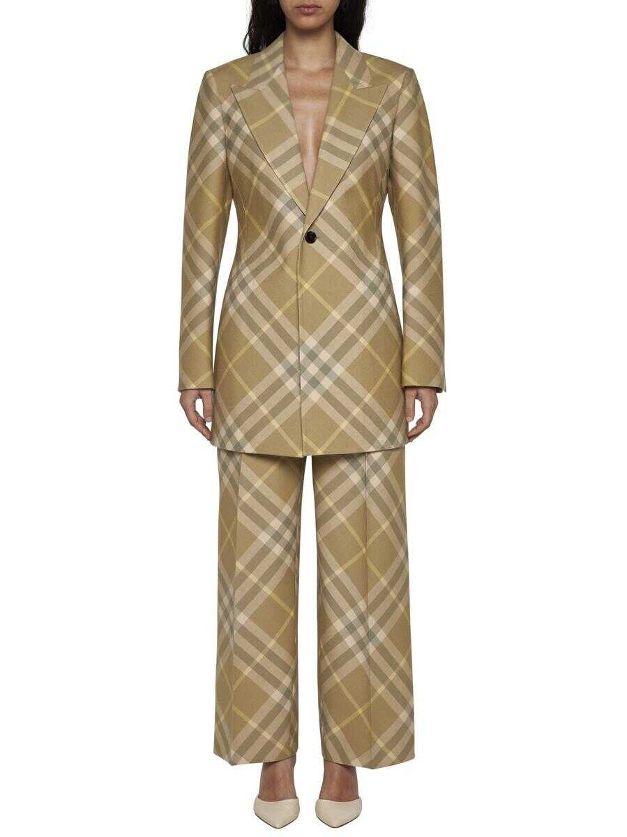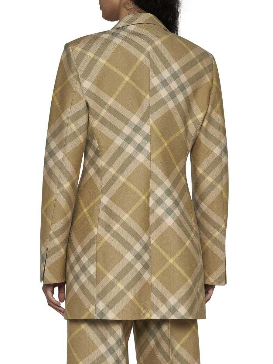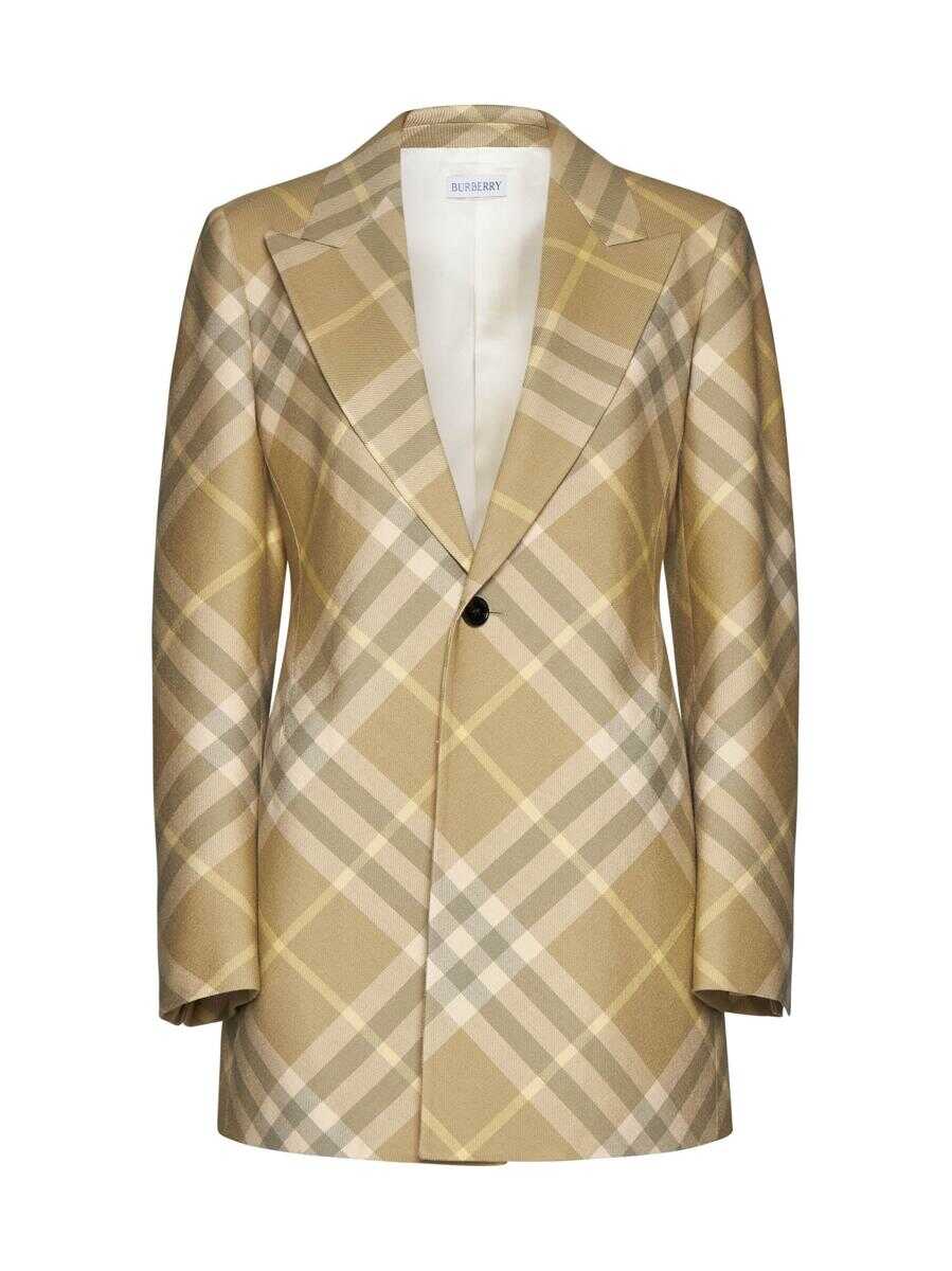 Burberry’s long single-breasted blazer in beige check motif wool featuring peak lapels, one button and vent at center back.