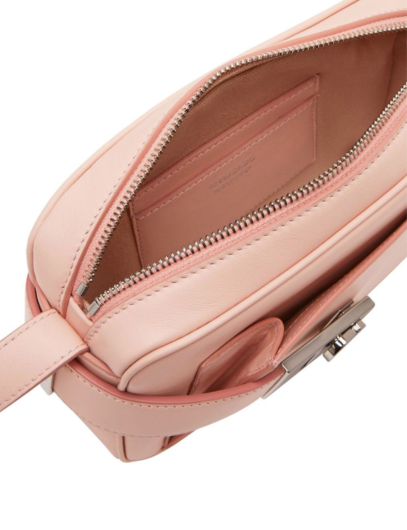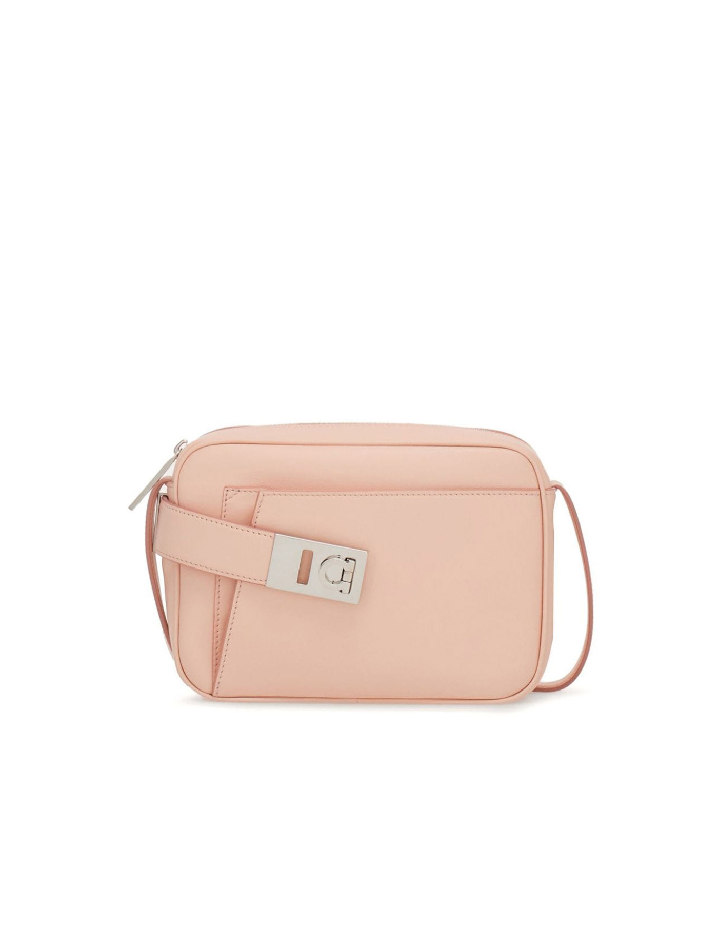 Blush pink calfskin tonal stitching logo-engraved silver-tone hardware gancini flip-lock fastening top zip fastening adjustable shoulder strap main compartment internal logo stamp internal card slots