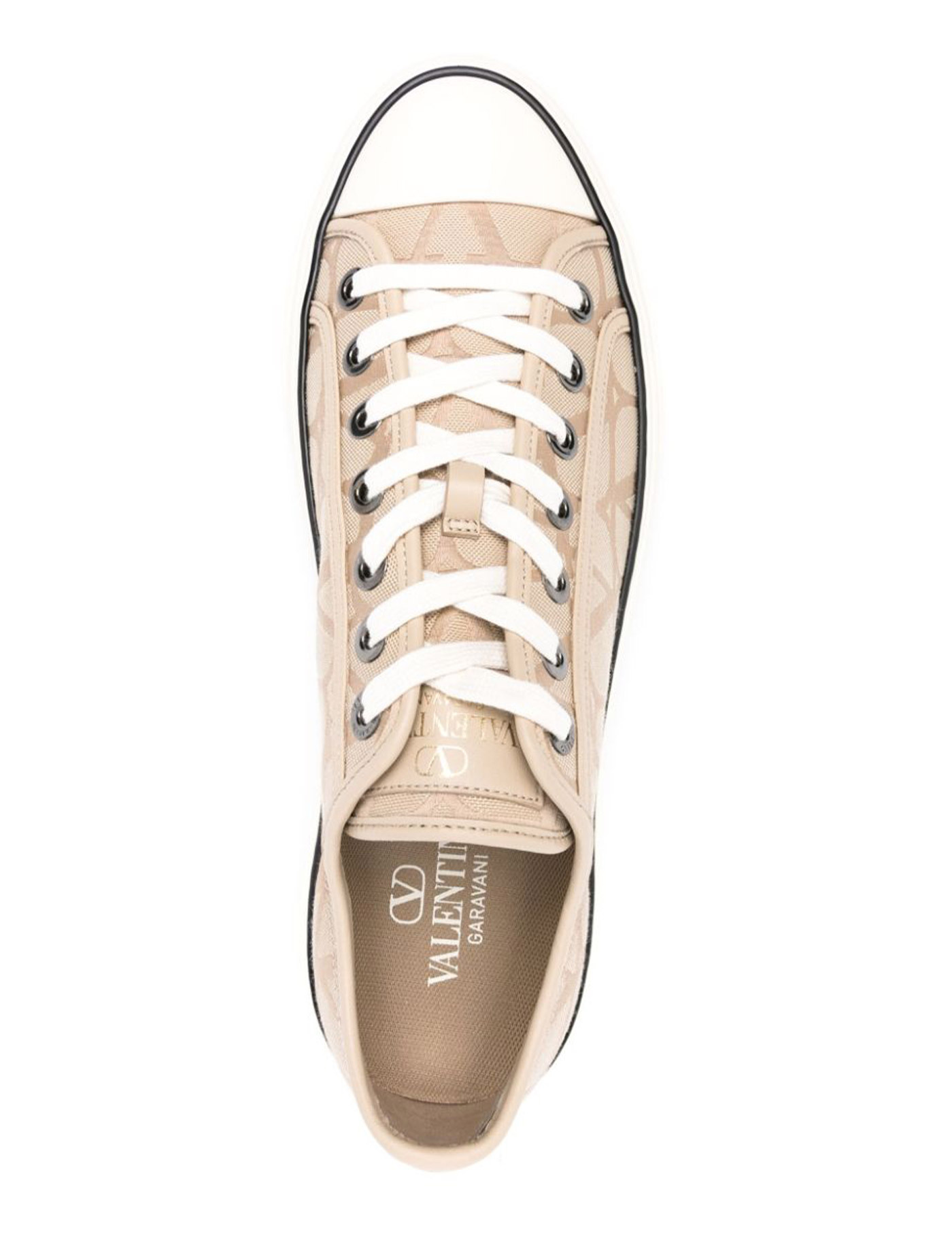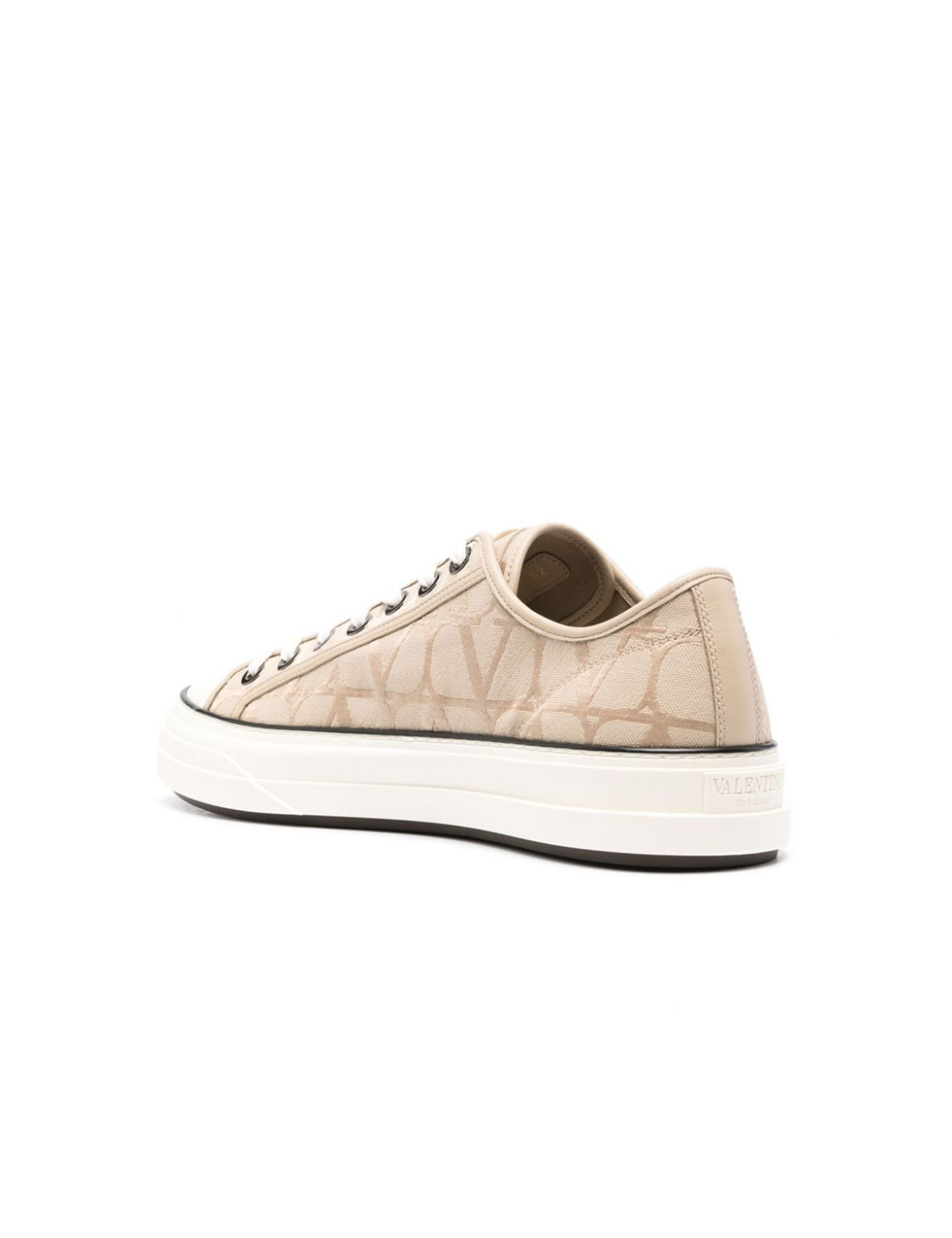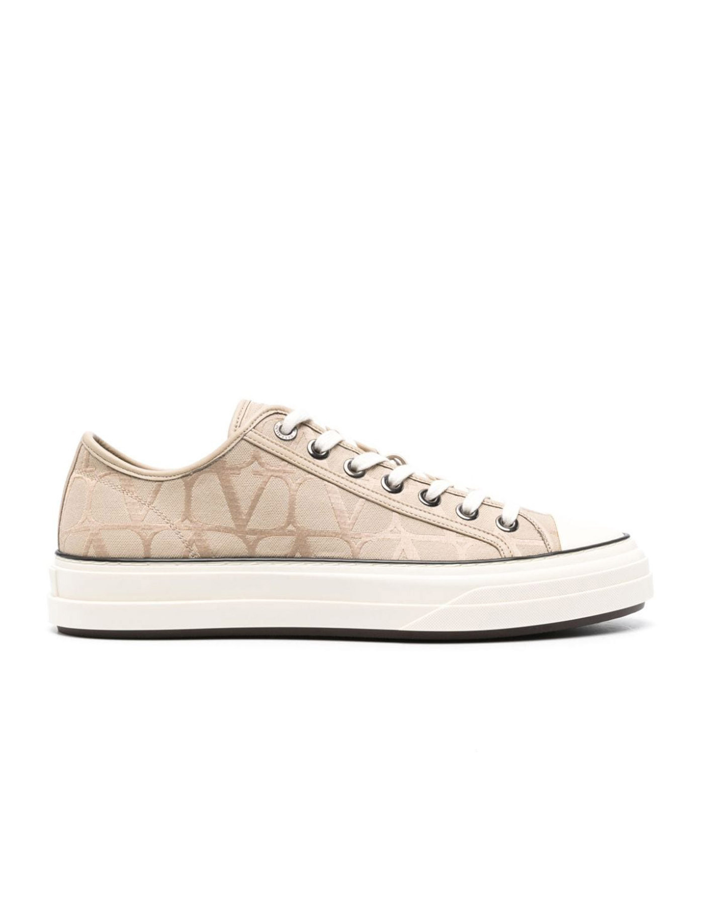 Valentino Garavani Totaloop Low-Top sneakers in beige jacquard Toile Iconographe fabric with leather details. They feature lace-up closure, Valentino Garavani logo on tongue and rubber sole.