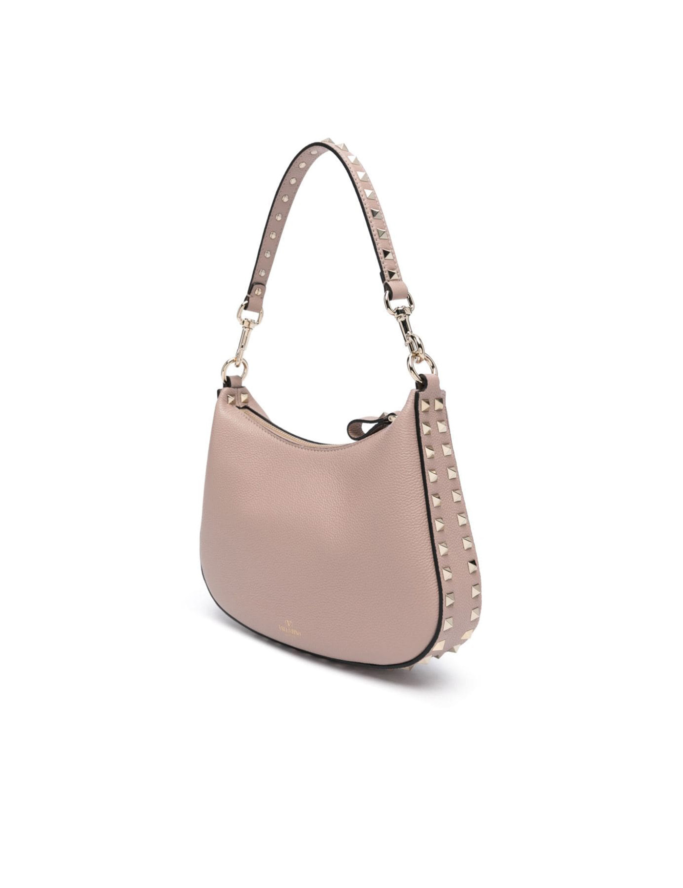Valentino Garavani "Rockstud" hobo bag crafted in grained leather and embellished with iconic platinum-finish studs. Zippered closure, leather interior with one flat pocket and detachable handle and shoulder strap.