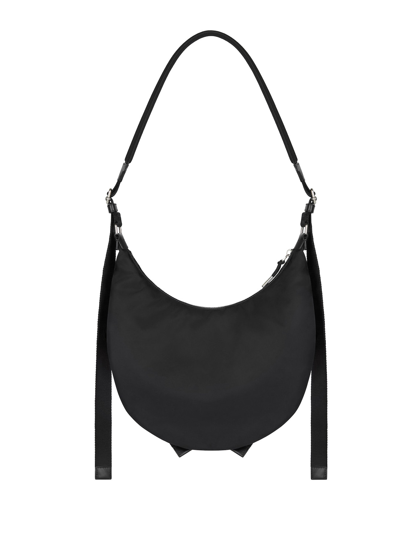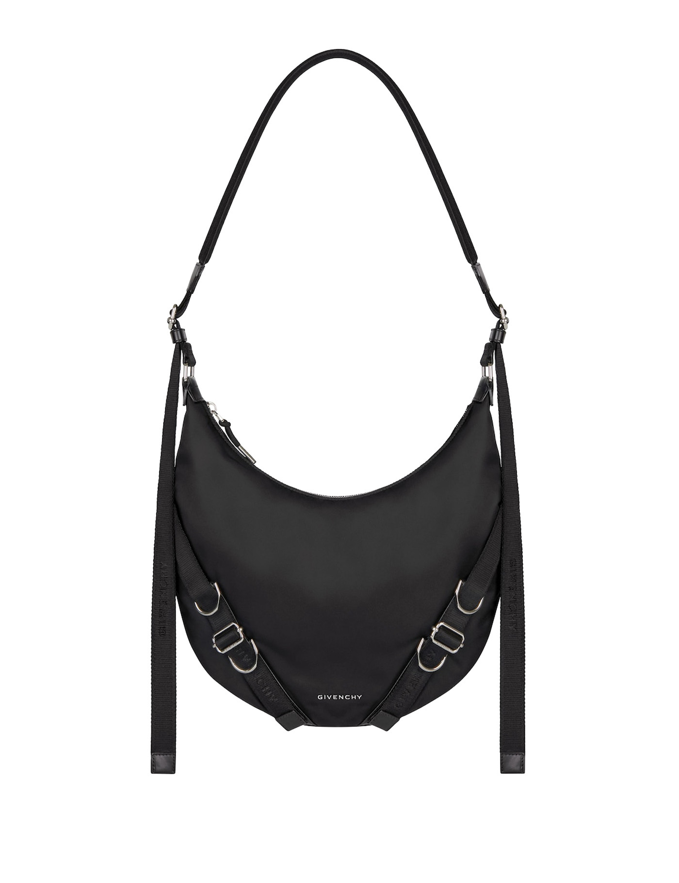 Nylon Voyou Shoulder Bag by Givenchy, flat shoulder strap giftable by contrasting metal buckles, top zipper closure, leather strap detail applied to front panel, soft design, iconic contrasting brand monogram on front, interior slit pocket, single interior compartment.