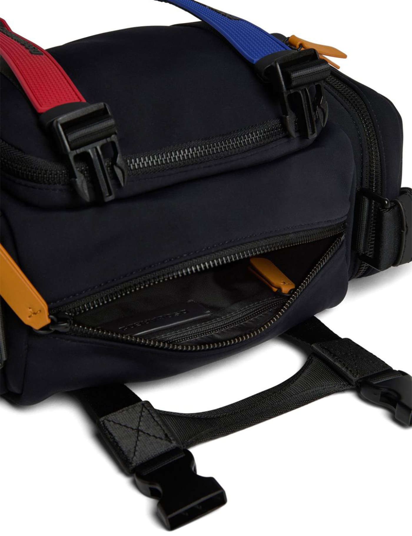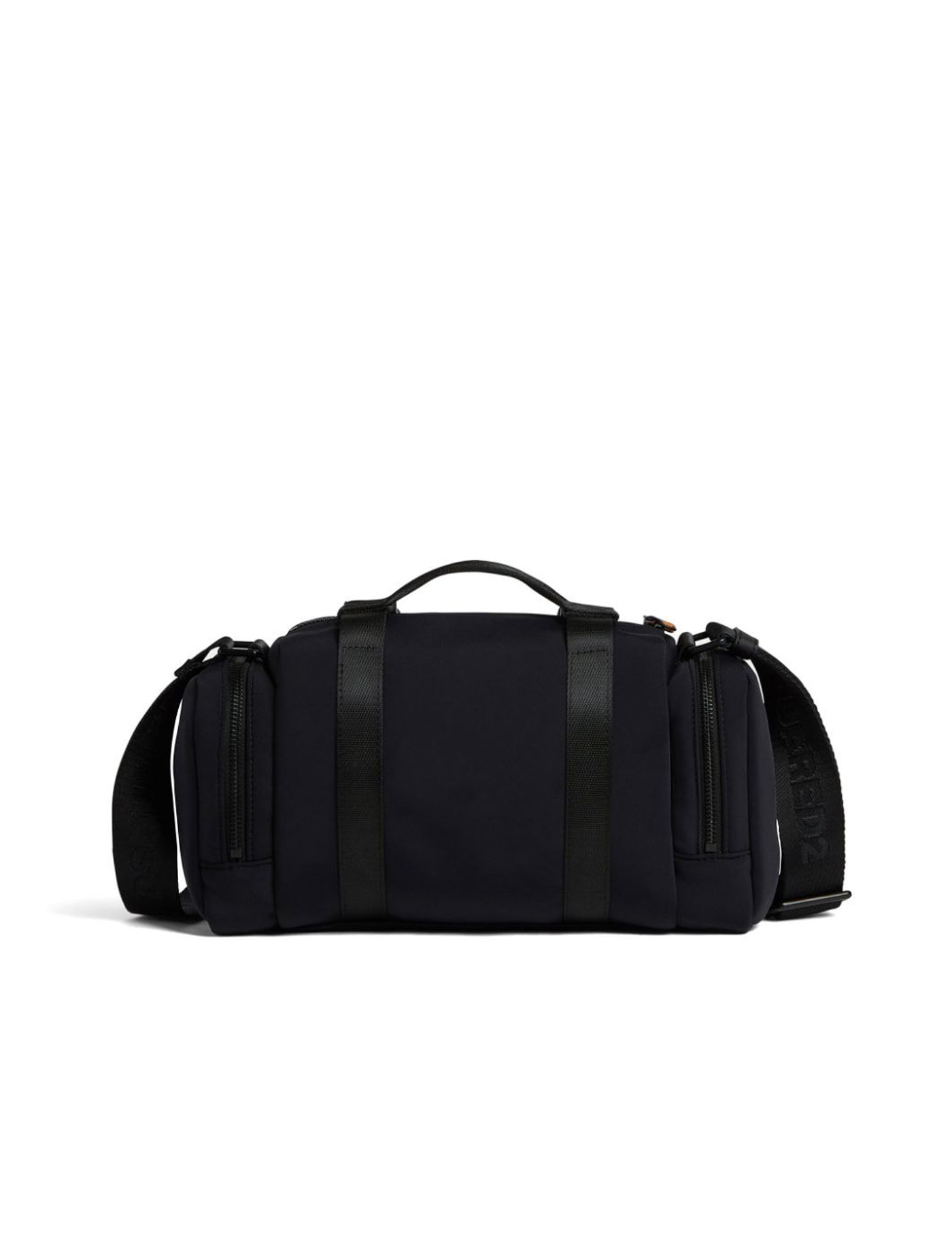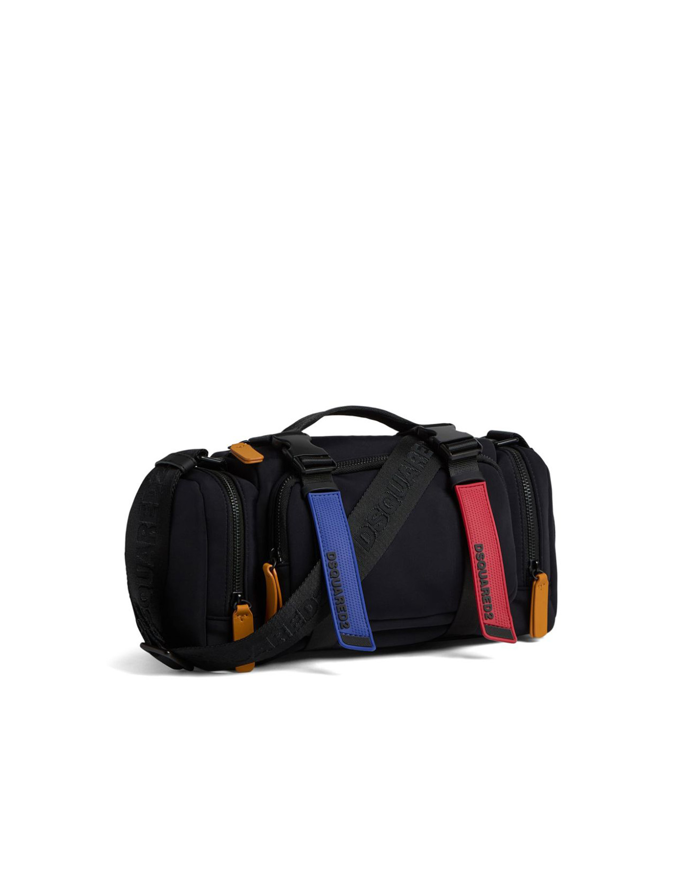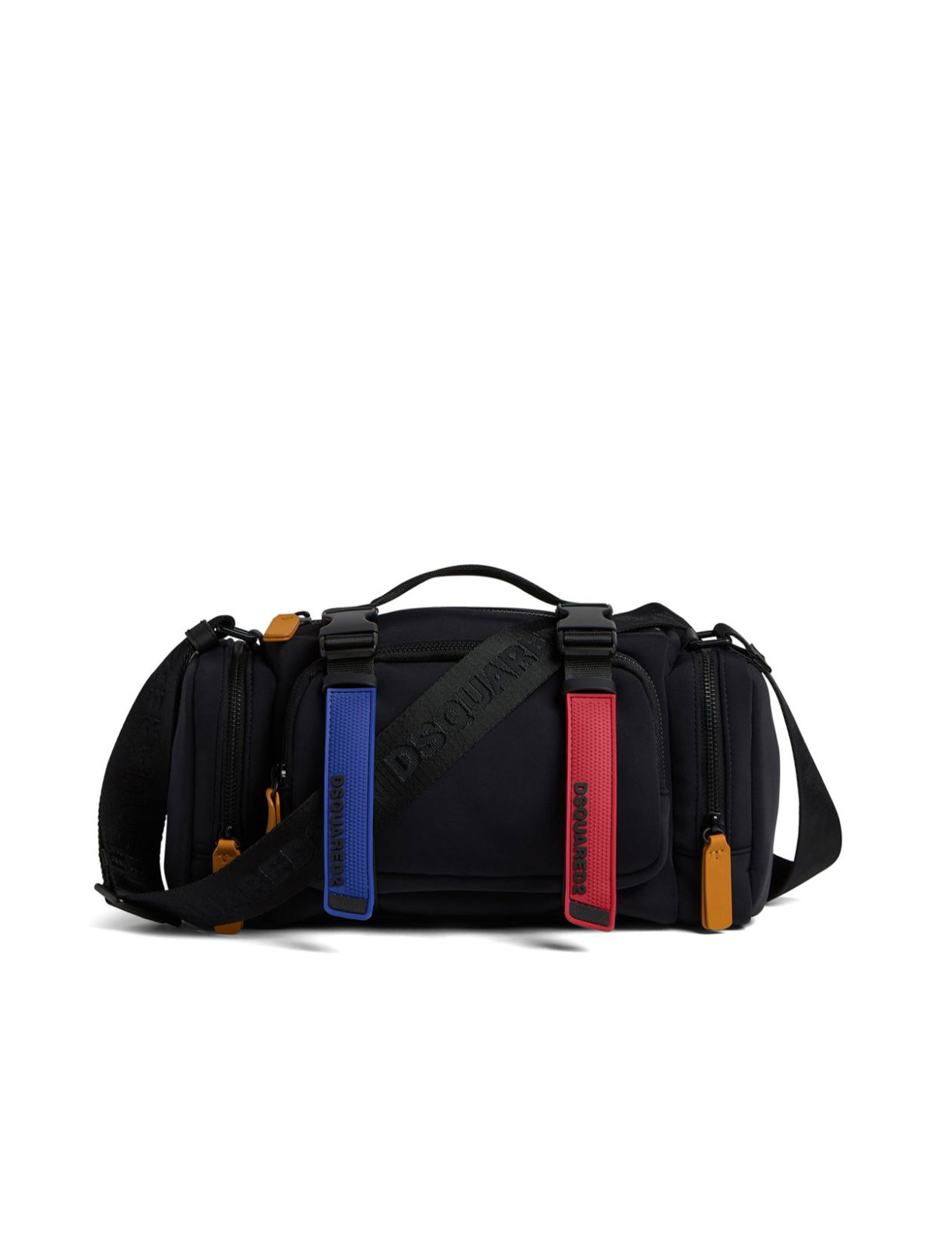 rubberised-logo strap duffle bag from DSQUARED2 featuring rubberised logo detail, rubber strap, tonal hardware, all-around zip fastening, quick-release buckle fastening, adjustable logo-jacquard shoulder strap, single flat top handle, front zip-fastening pocket, two side zip-fastening pockets, internal zip-fastening pocket, internal logo patch, black, multicolour, main compartment and full lining.