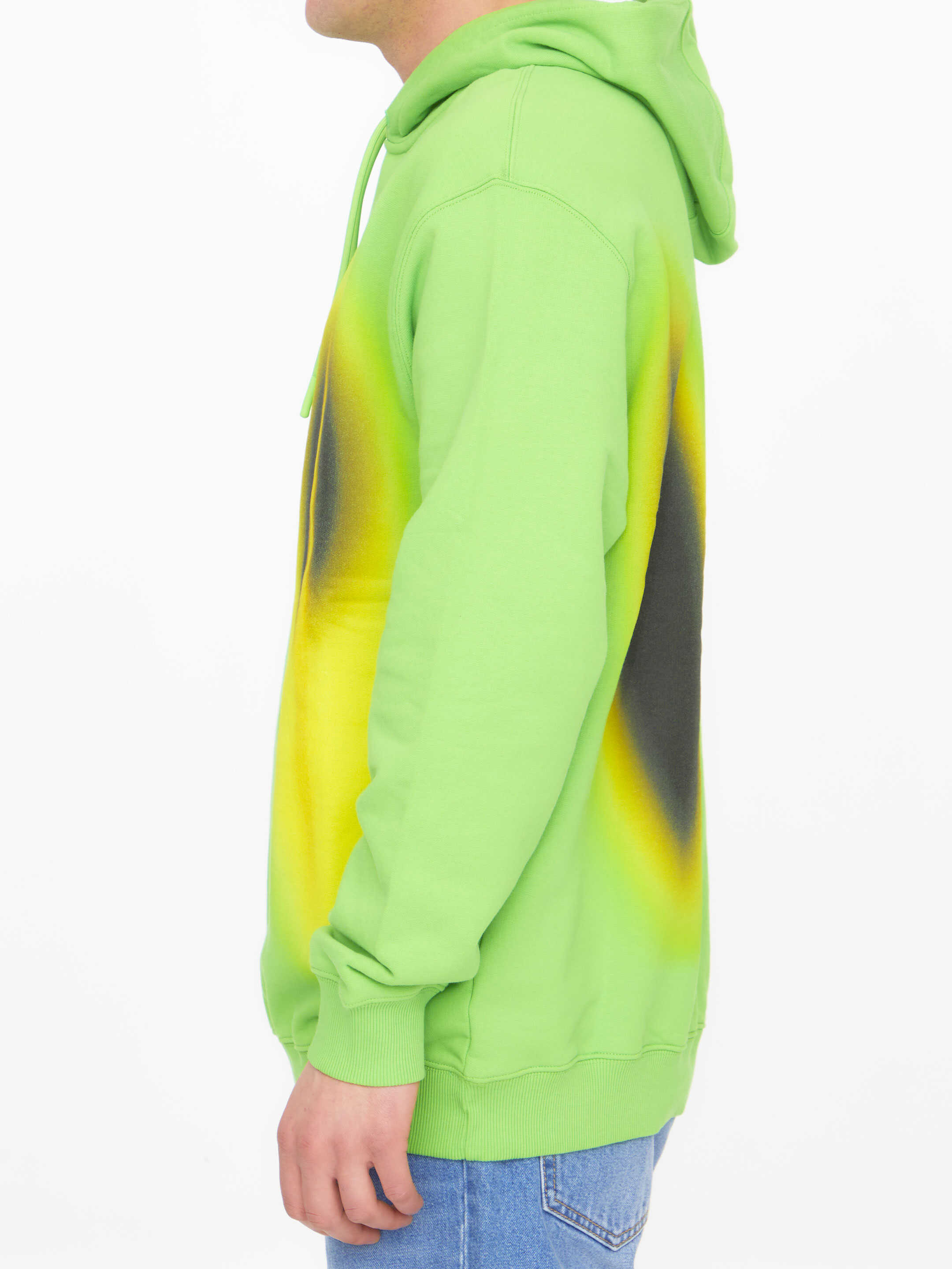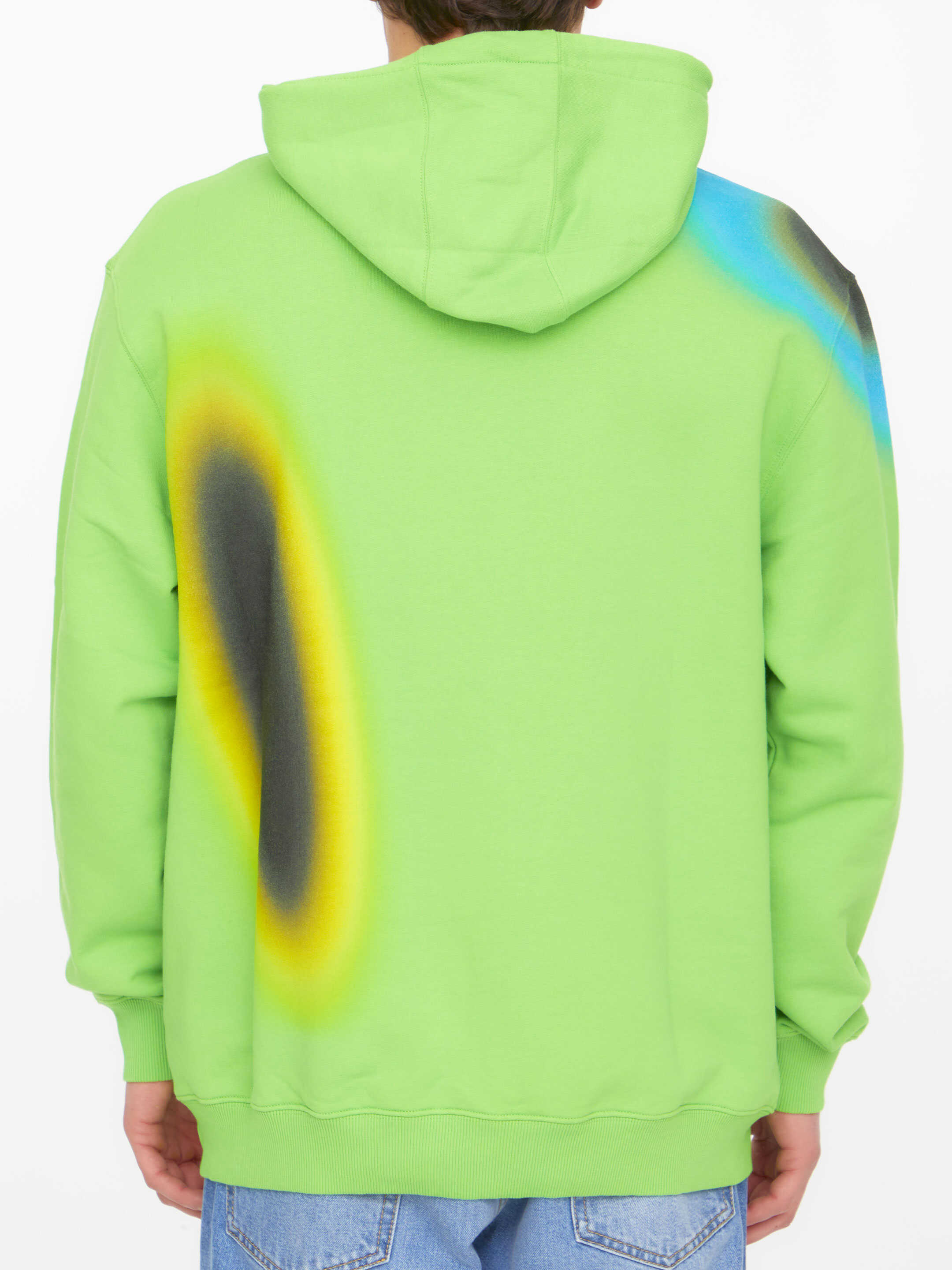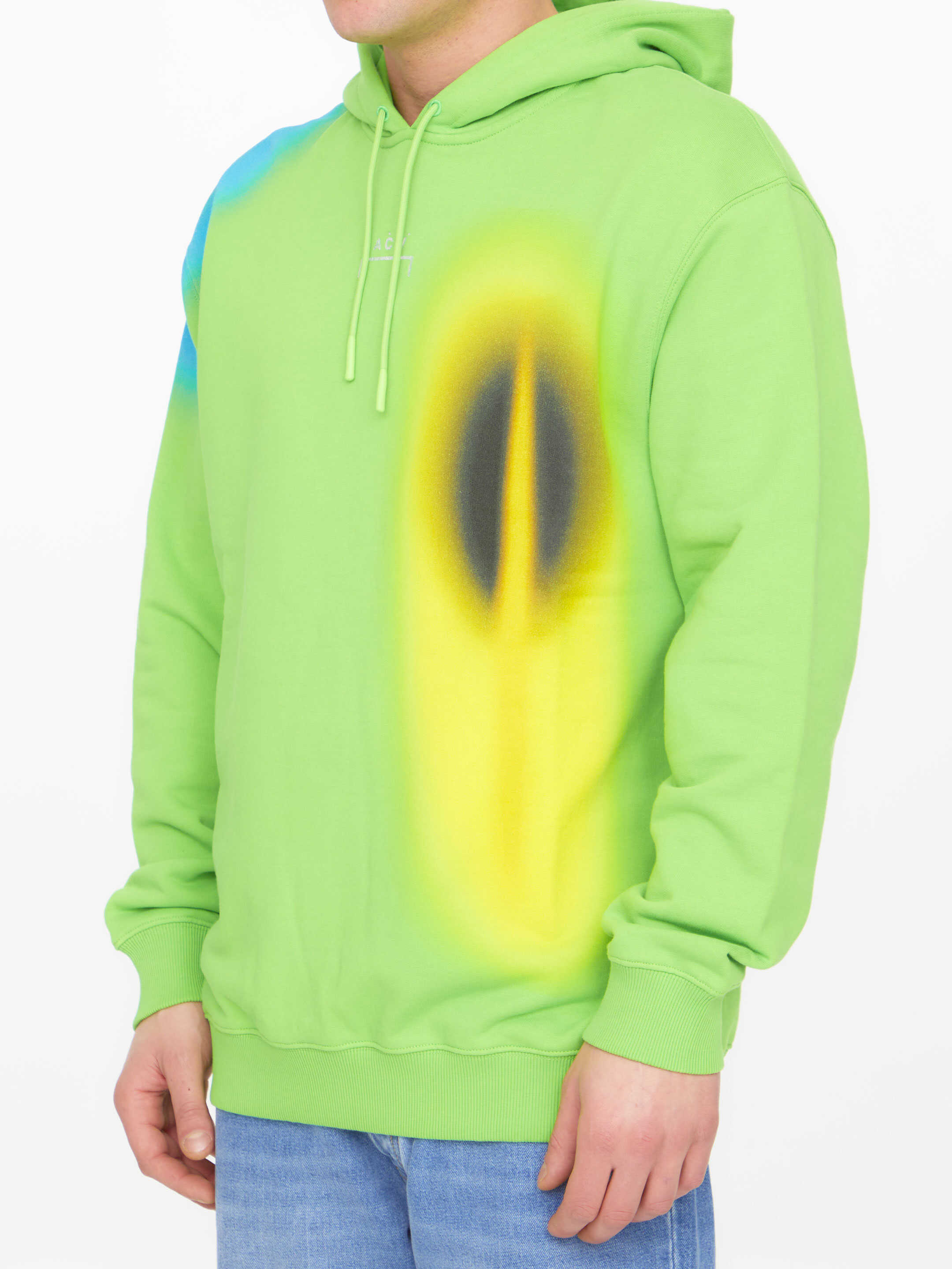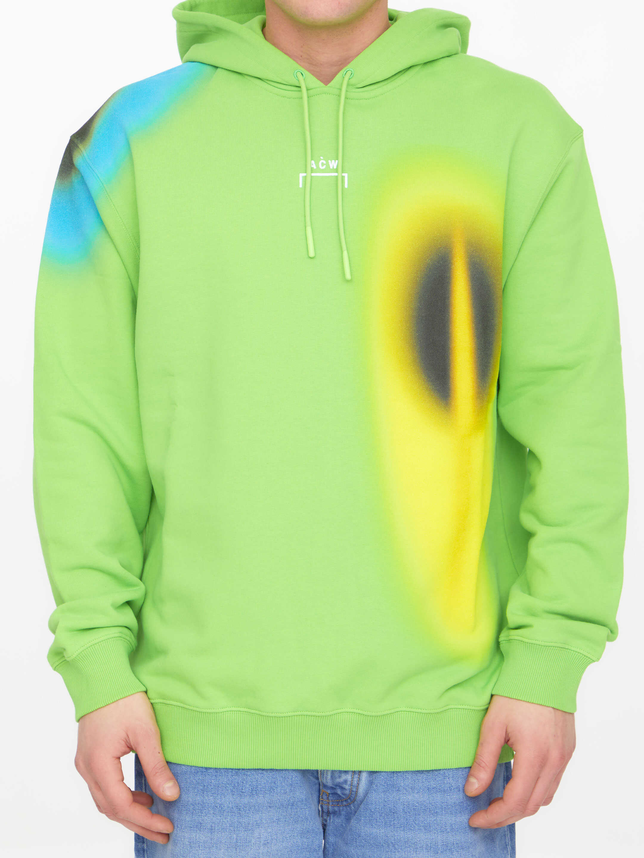 Hypergraphic hoodie in green cotton with multicolor print. It features ACW logo printed on the front, drawstring hood and ribbed trims on cuffs and hem.