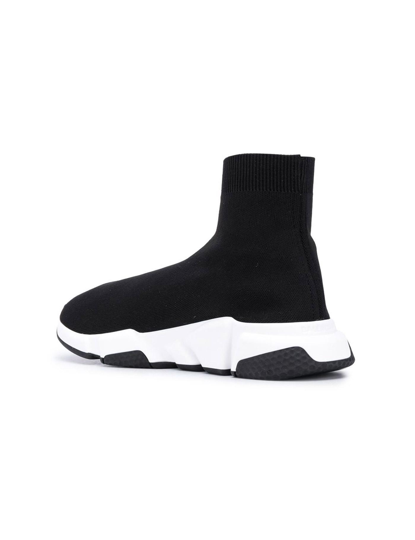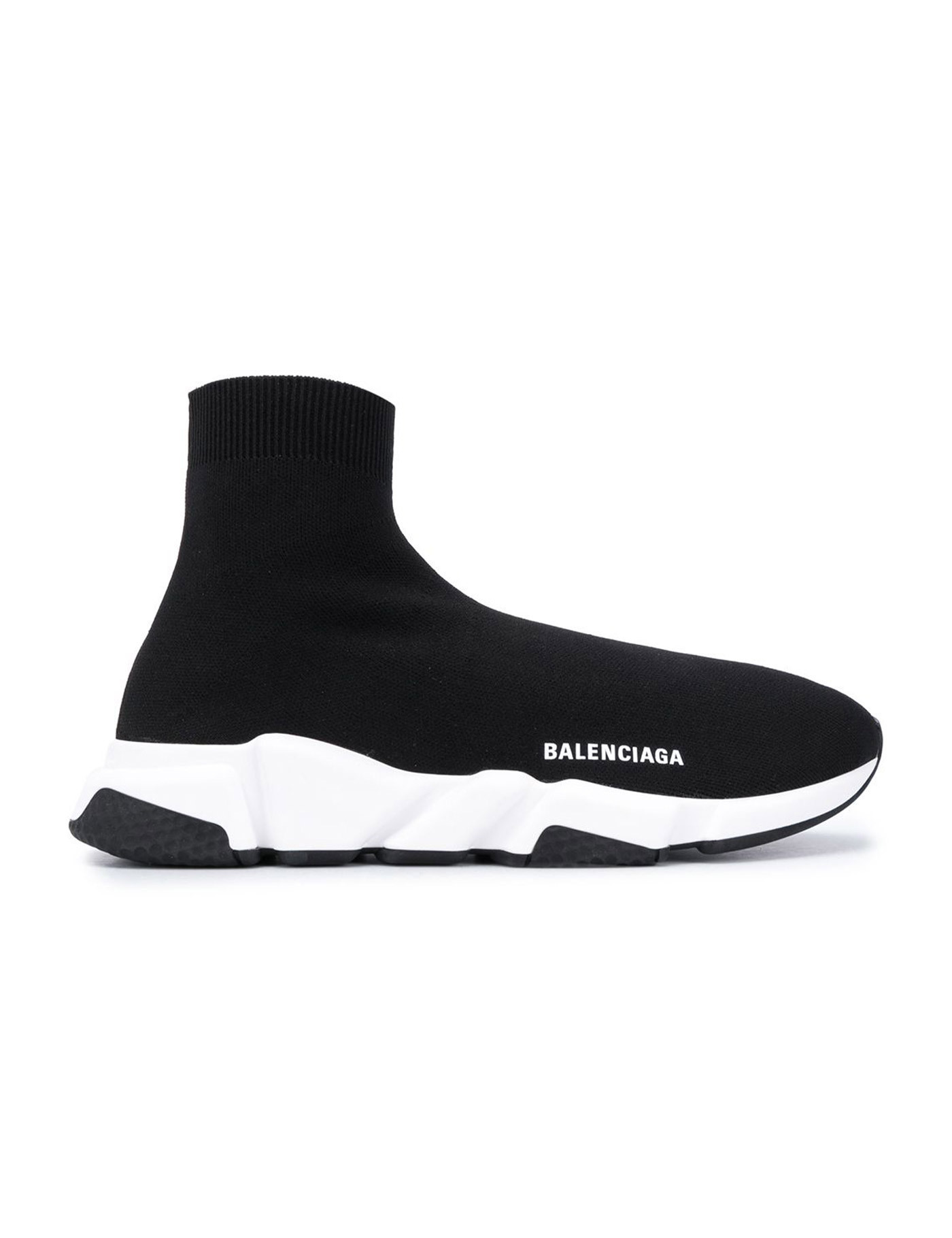 Black and white canvas Speed sneakers from Balenciaga featuring knitted construction, logo print to the side, elasticated ankles, slip-on style and flat rubber sole.