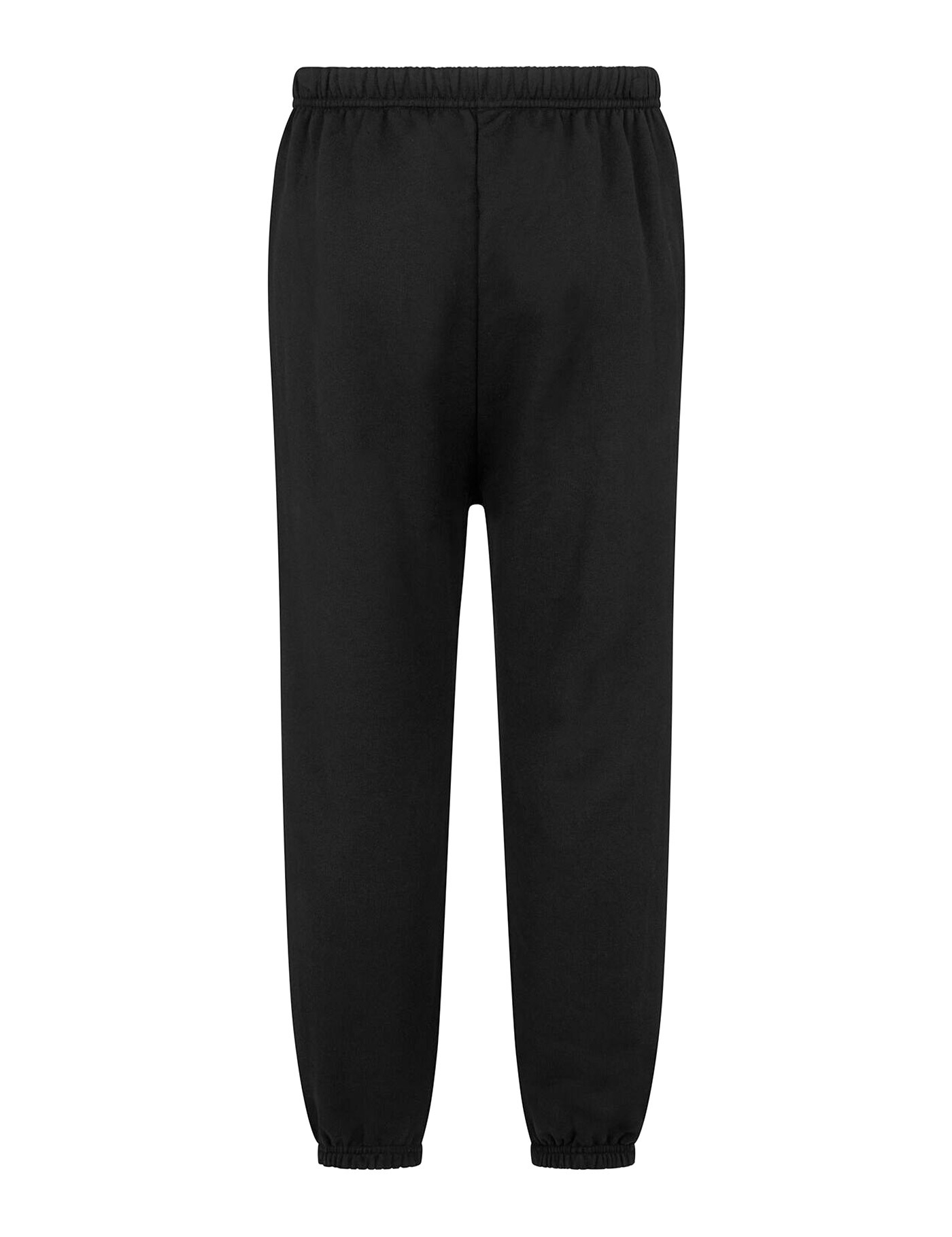 Black jogging pants. Elasticized waistband with drawstring. Flush pockets on the sides.