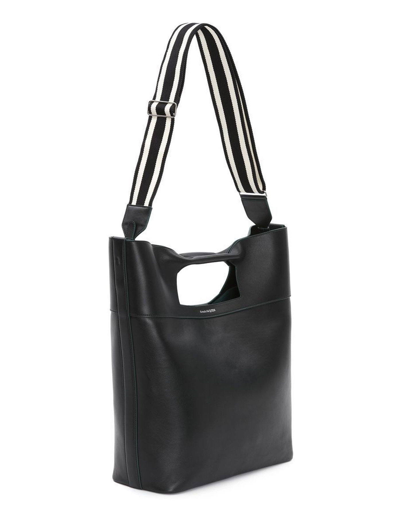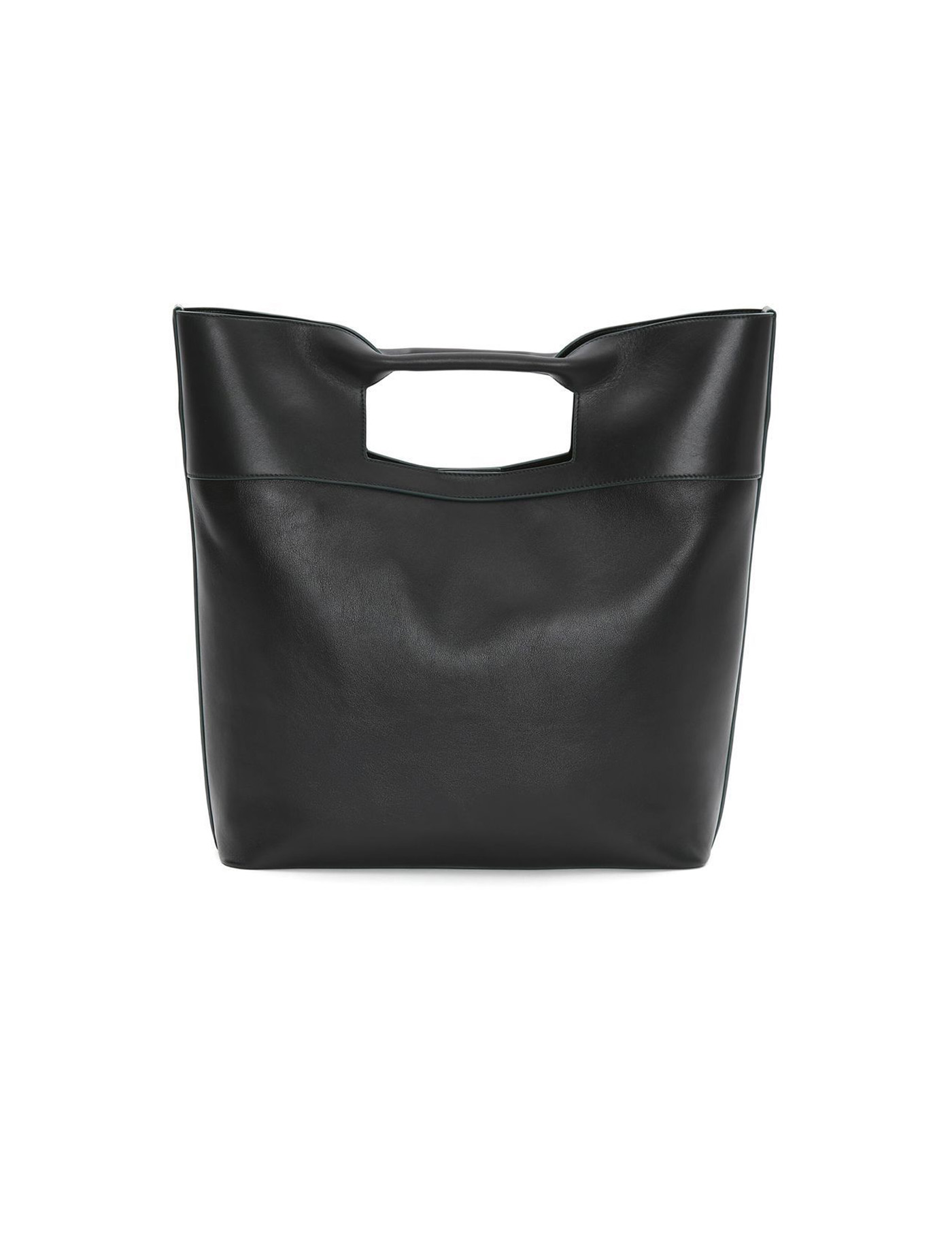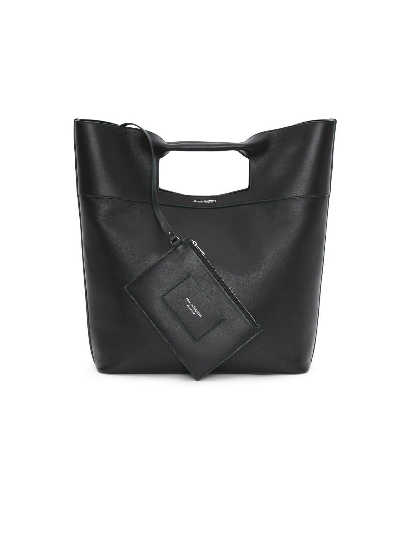 Alexander McQueen leather tote bag with a structured, rigid shape. Silver-printed lettering logo, double handles, magnetic closure and contrasting suede interior with a removable pouch. Adjustable and detachable fabric shoulder strap and silver-finished metalware.