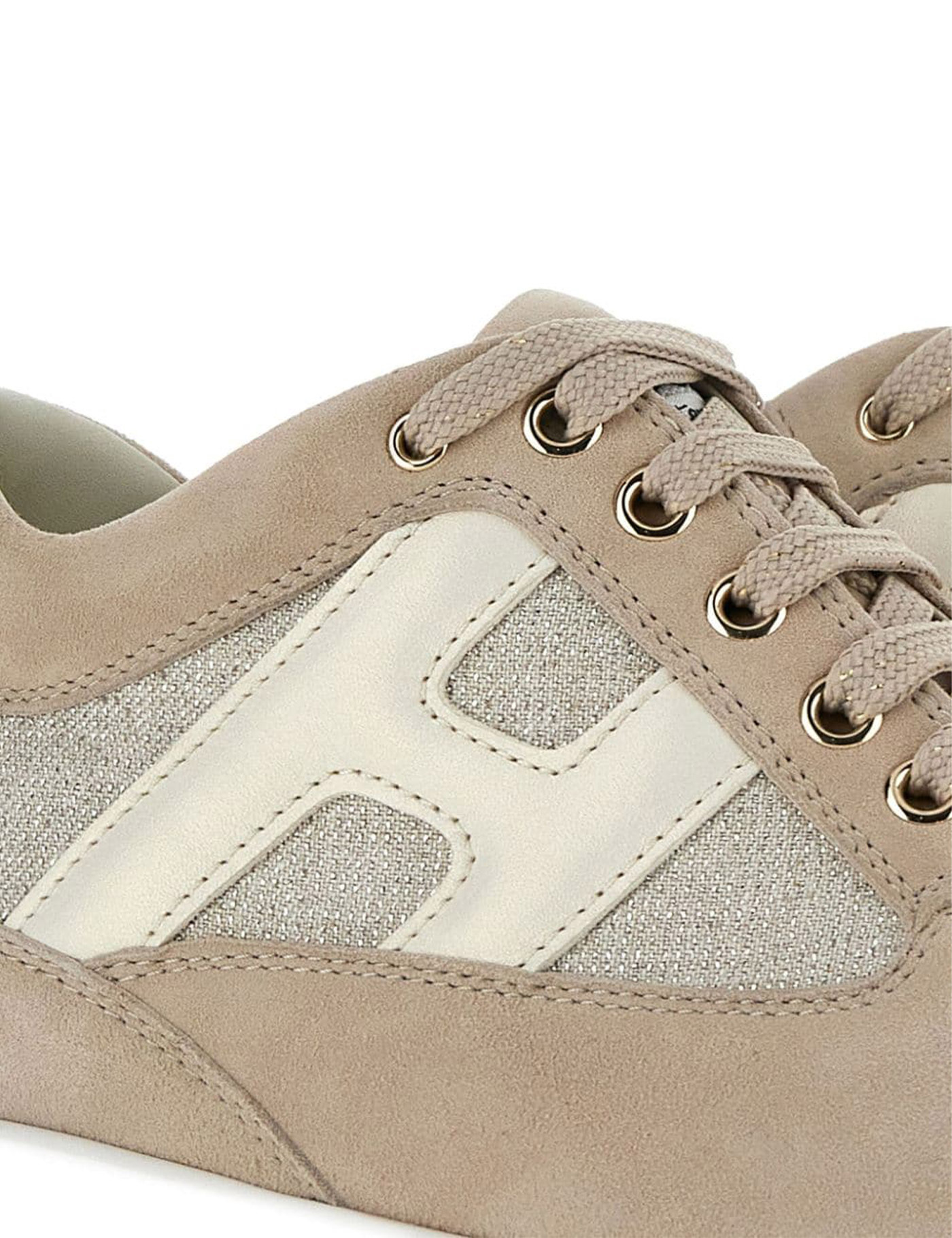 Suede upper Inserts in mixed lurex fabric Side H in slightly metallic leather Removable fussbett 1.2 cm Rubber sole Total height 5.7 cm