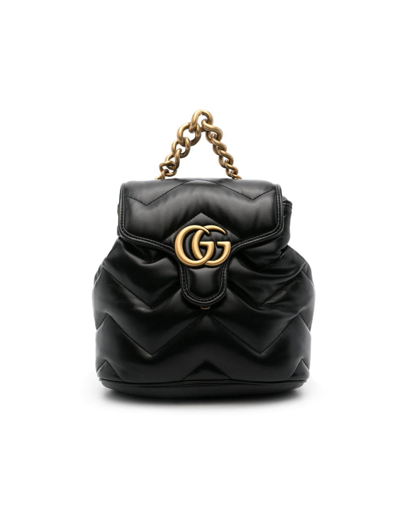 - Material: 100% lambskin - Color: black - Interior microfiber lining - Other details: GG logo applied on front - Leather shoulder straps - Magnetic button closure - Made in Italy - Dust bag - Item code: 777253AAC741000 - Dimensions: W 19 cm x H 20 cm x D 11 cm