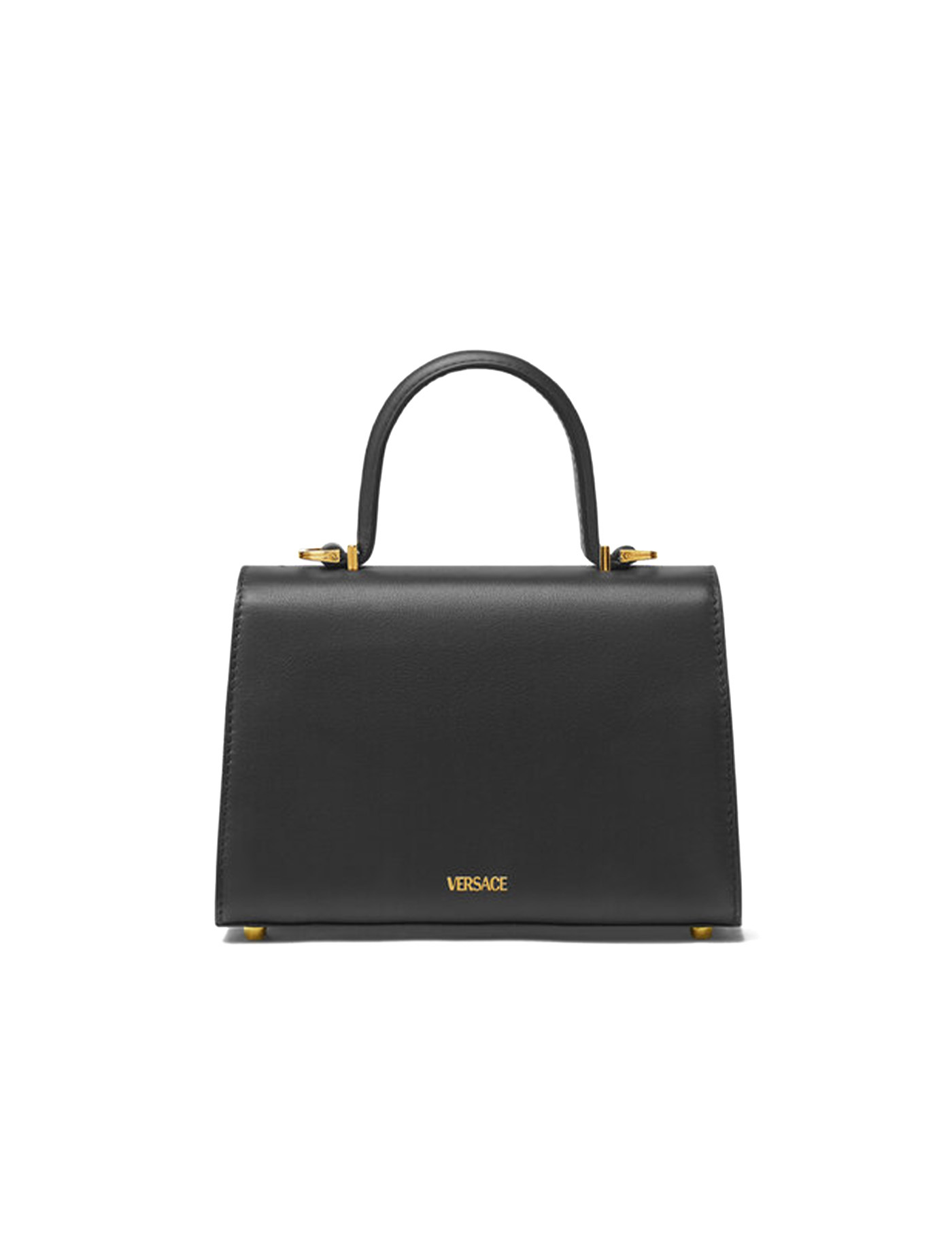 This small Versace handbag is made of smooth flat-grain leather and features a strap embellished with the iconic Medusa '95 customization. It has a magnetic flap closure, a nappa-lined interior with two open pockets, expandable sides with cinch straps, and metallic feet at the base. The design is versatile thanks to the single handle and additional adjustable shoulder strap. Metal accessories have a gold finish.
