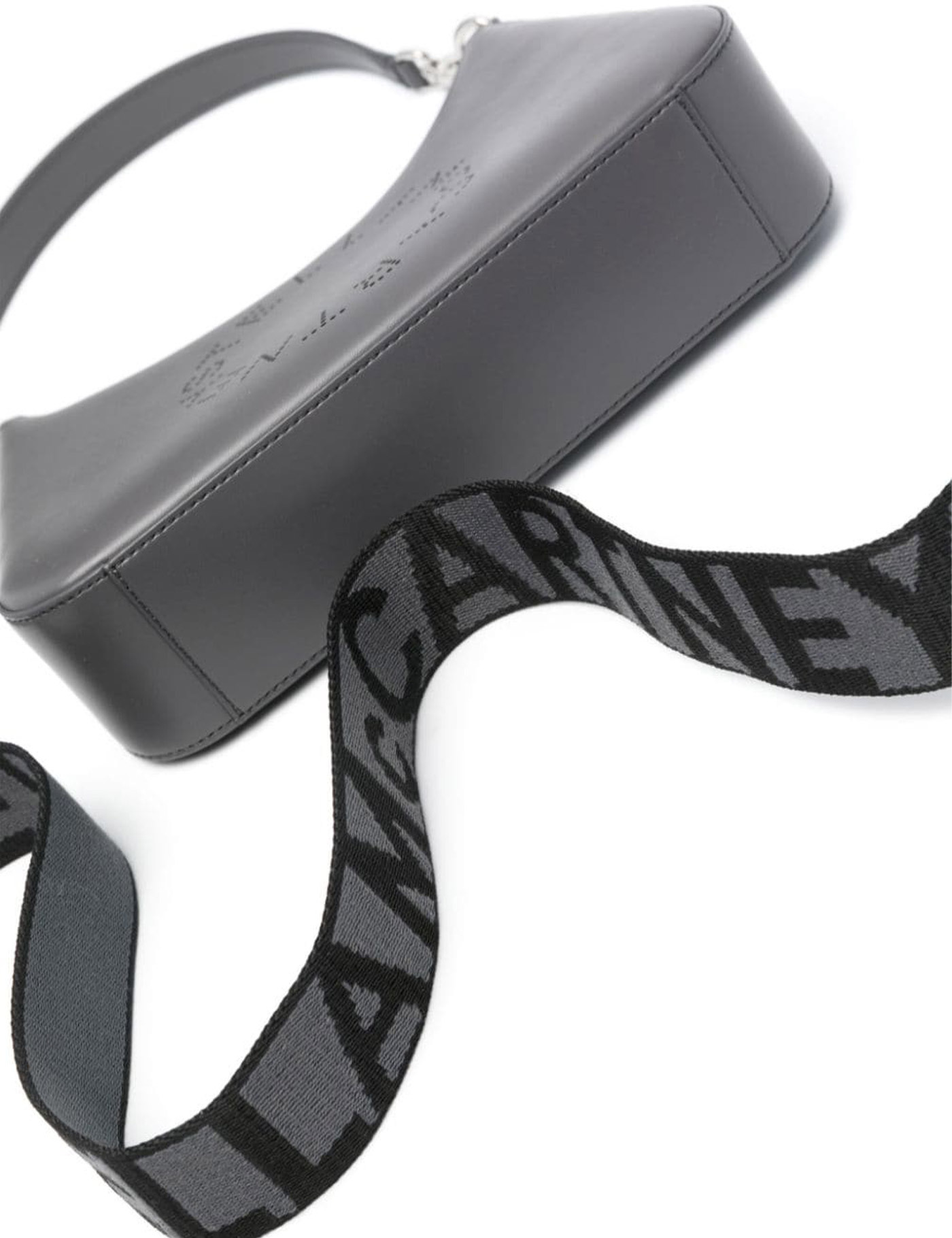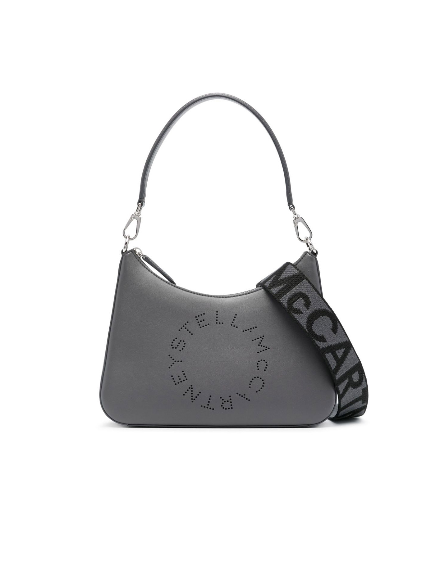 This Stella McCartney shoulder bag is made of Alter Mat with perforated logo lettering. It features a zip closure and a suede-like microfiber interior with an open pocket. The bag can be worn over the shoulder or crossbody thanks to the removable handle and adjustable, removable jacquard ribbon strap. The metallic accessories have a silver finish.