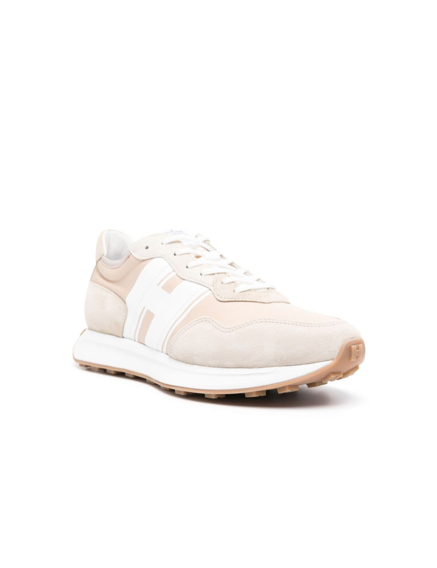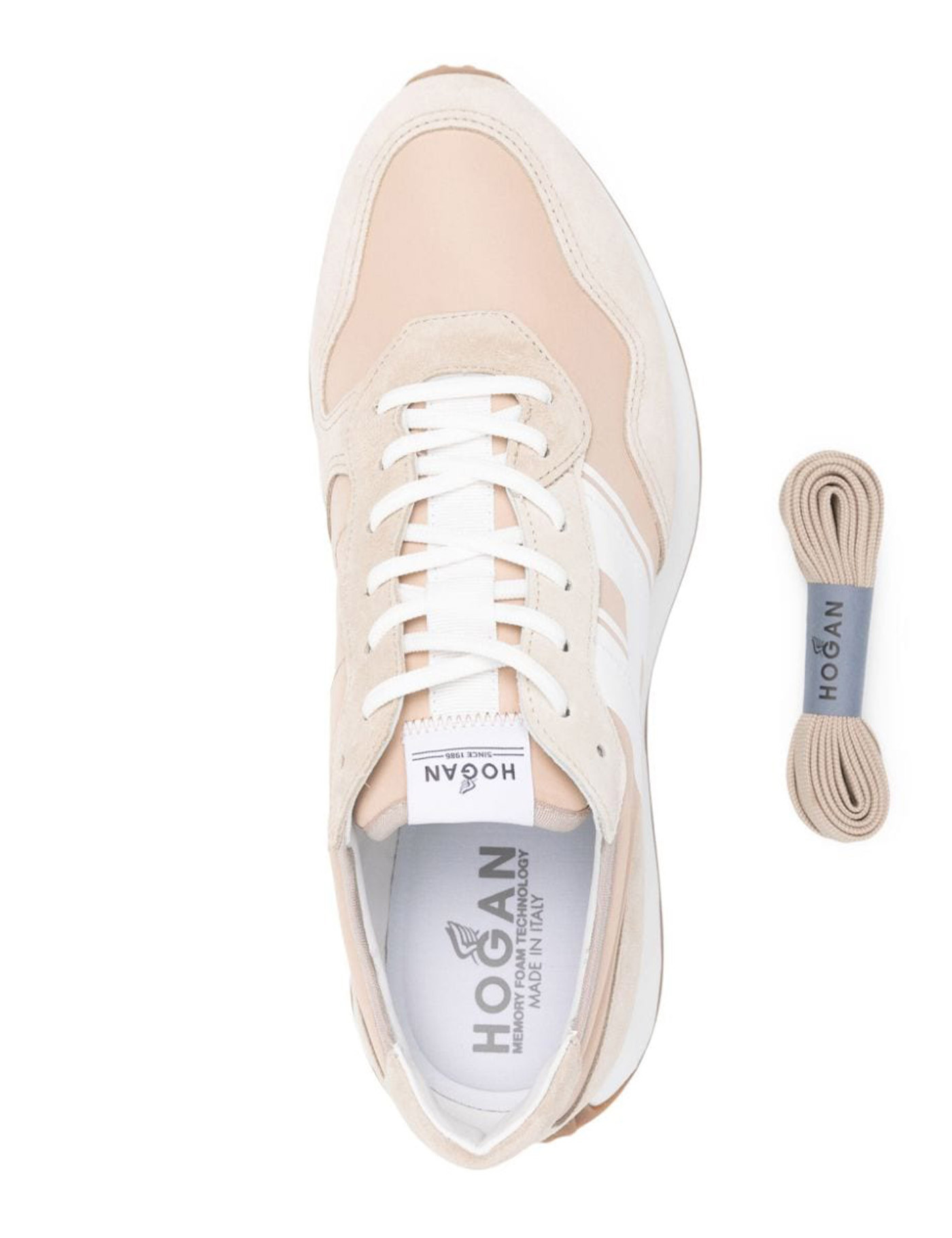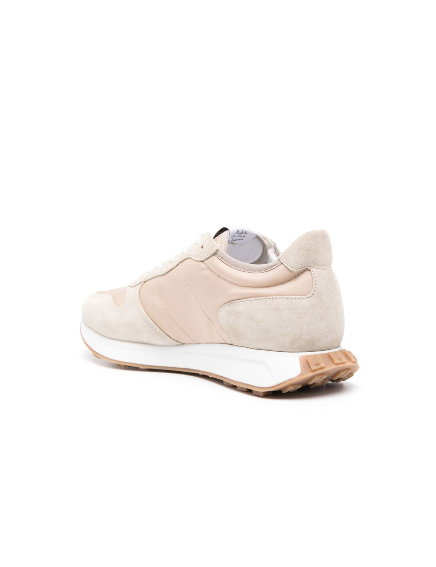 Beige, white calf suede technical fabric padded ankle round toe logo-print tongue logo print to the side memory foam insole rubber sole interchangeable laces front lace-up fastening this piece comes complete with a protective dust bag.
