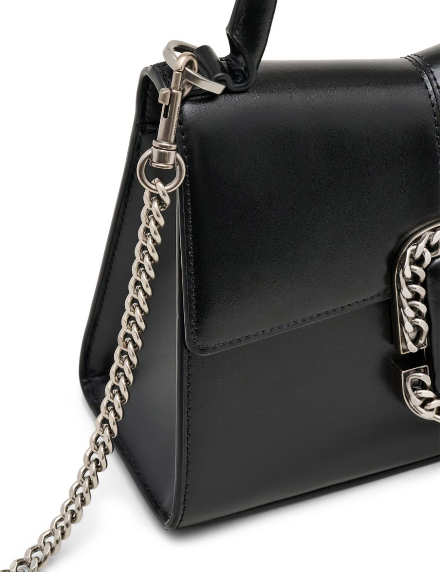 The St. Marc handbag by Marc Jacobs is made of smooth black leather, embellished with a logo with a chain effect on the front. Interior with compartments for cards, adjustable and removable shoulder strap, and magnetic closure. Logo plate on the back and details in golden metal. Measures 24x11x16 cm.