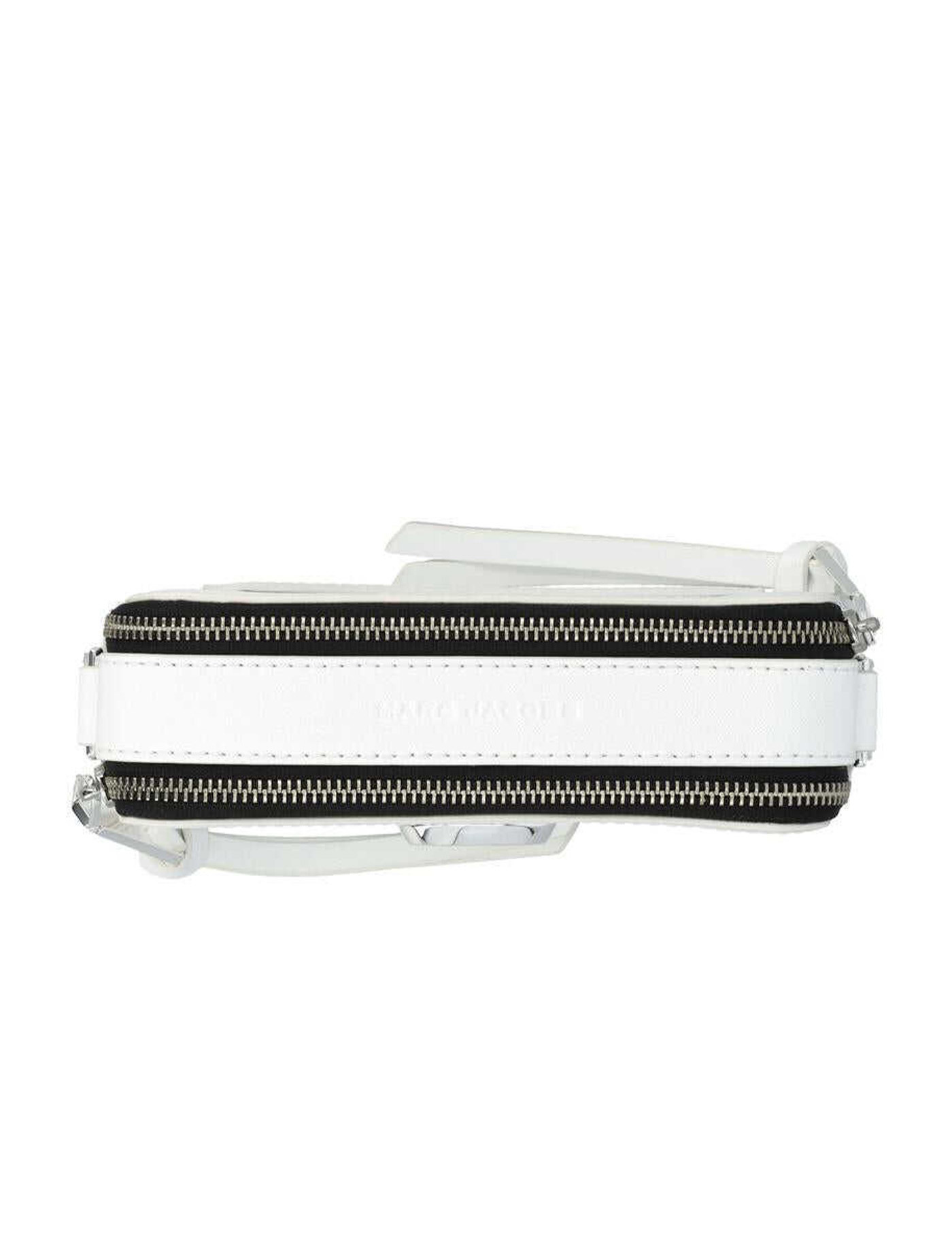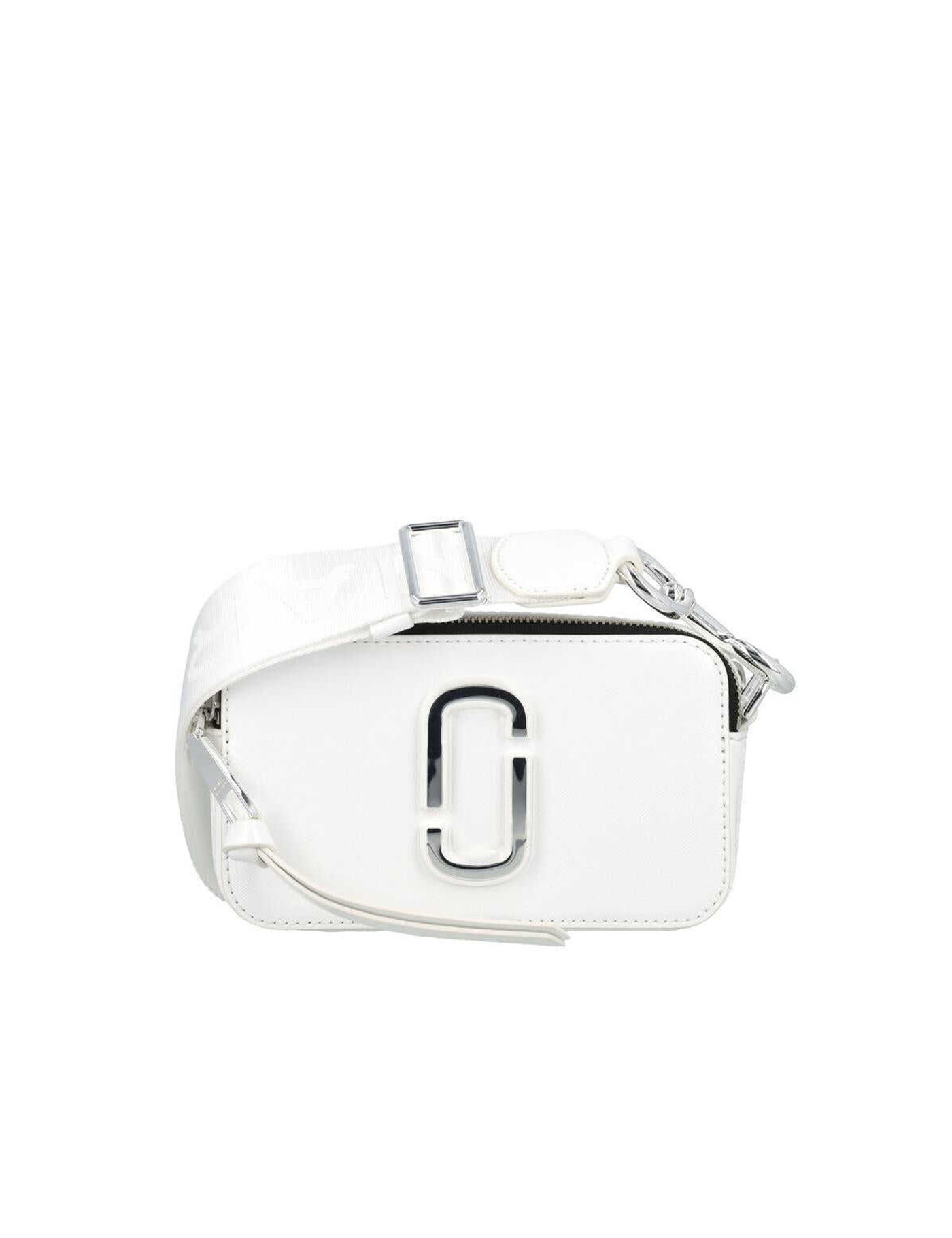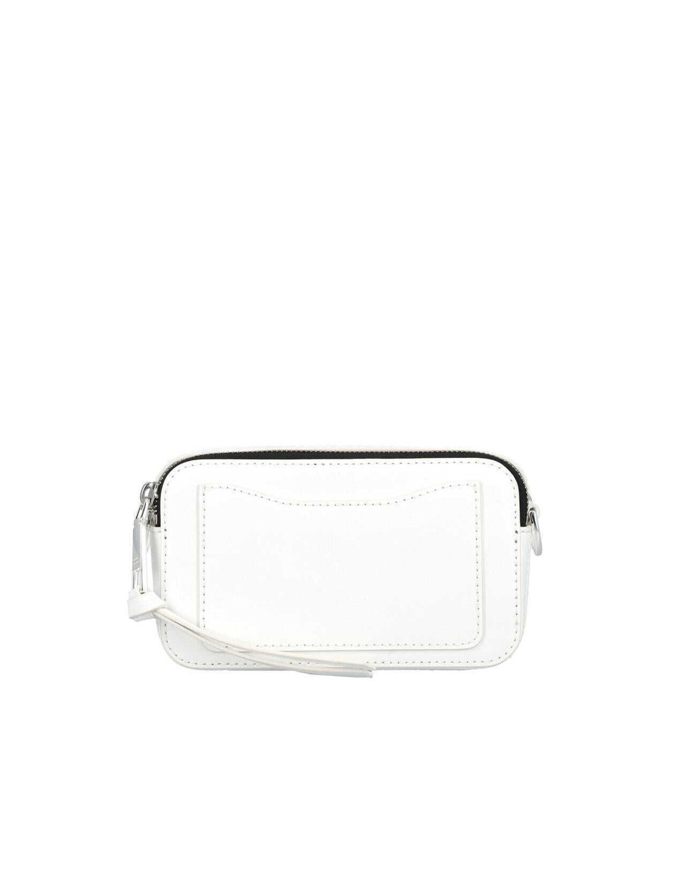 The Snapshot DTM crossbody bag by Marc Jacobs made of white Saffiano leather. Iconic logo on the front, silver metal details, and adjustable and removable logo fabric shoulder strap. It features two zip compartments, internal and external slip pockets. Measures 18x6x11 cm.