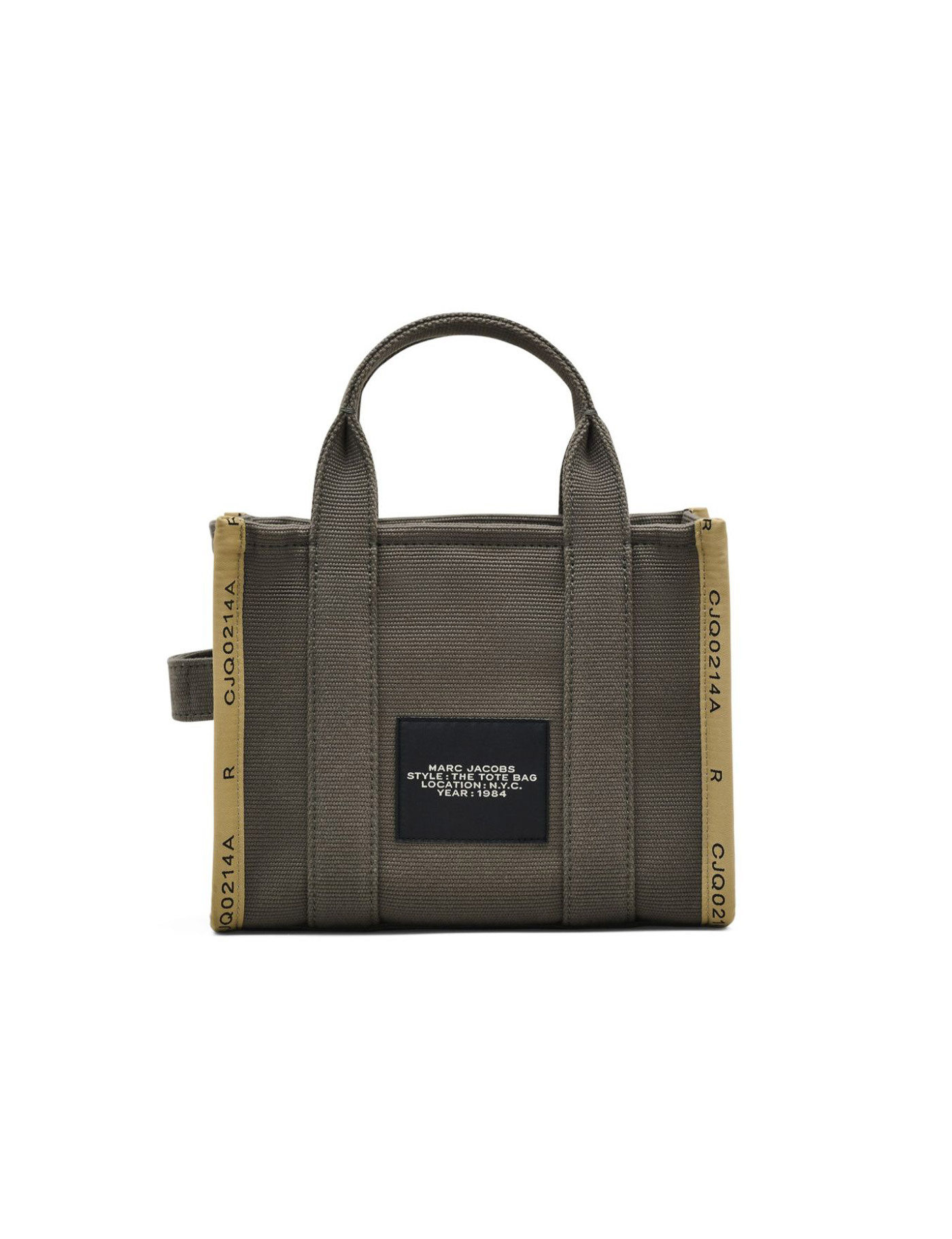 The Marc Jacobs Jacquard Small Tote bag is made of jacquard fabric in shades of green with the iconic logo on the front and contrasting satin effect edges. It has a zip closure and an adjustable and removable shoulder strap. Measures 26x13x21 cm.