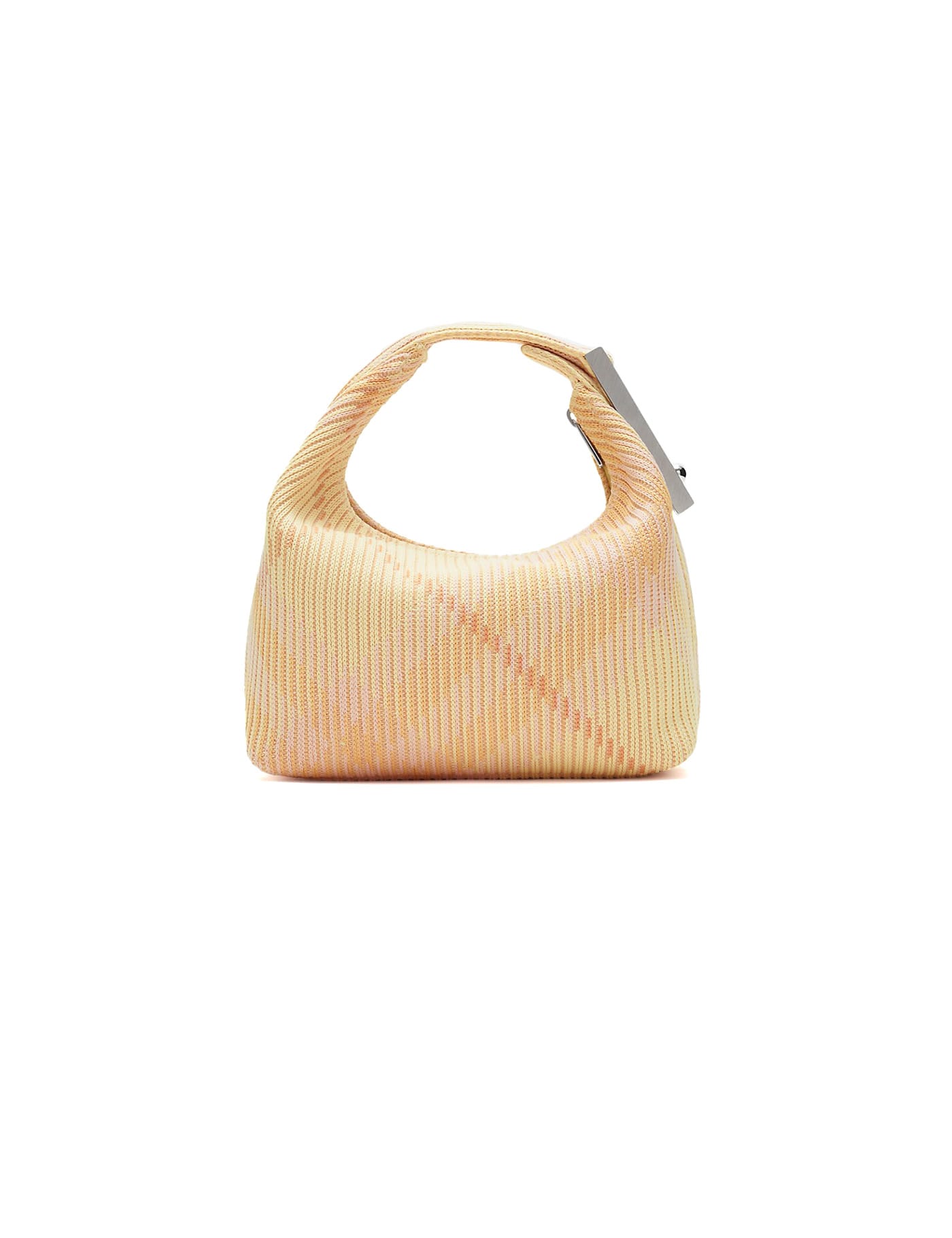 Burberry's Peg textured fabric mini bag featuring a check motif in shades of sherbet pink, top handle with clip + engraved logo, zip fastening and silver-tone metal hardware.