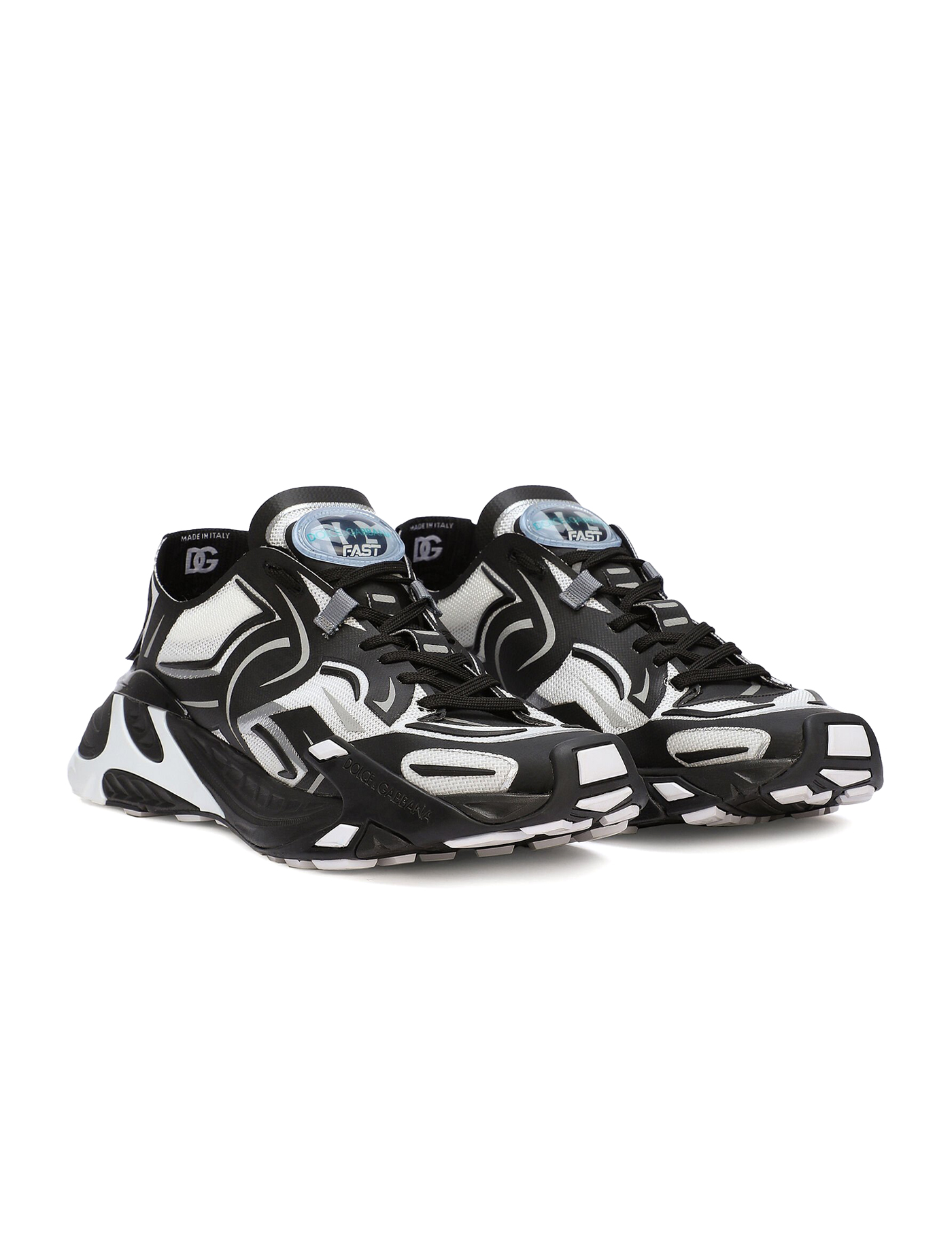 Calfskin Sneakers by Dolce&Gabbana, lace-up front fastening, two-tone crisscross panel design, textured sole, contrasting logo fabric patch at back, logo-embossed insole.