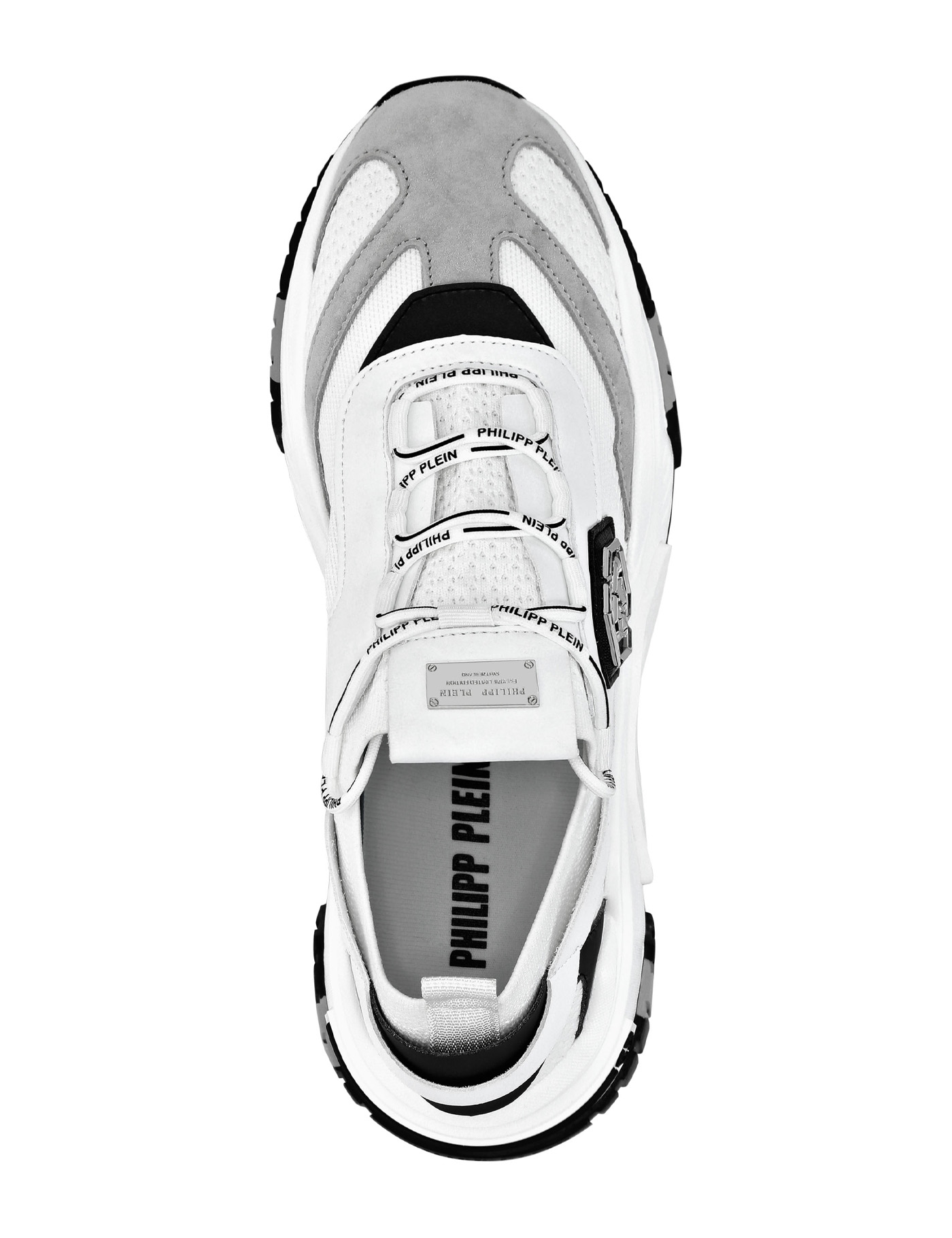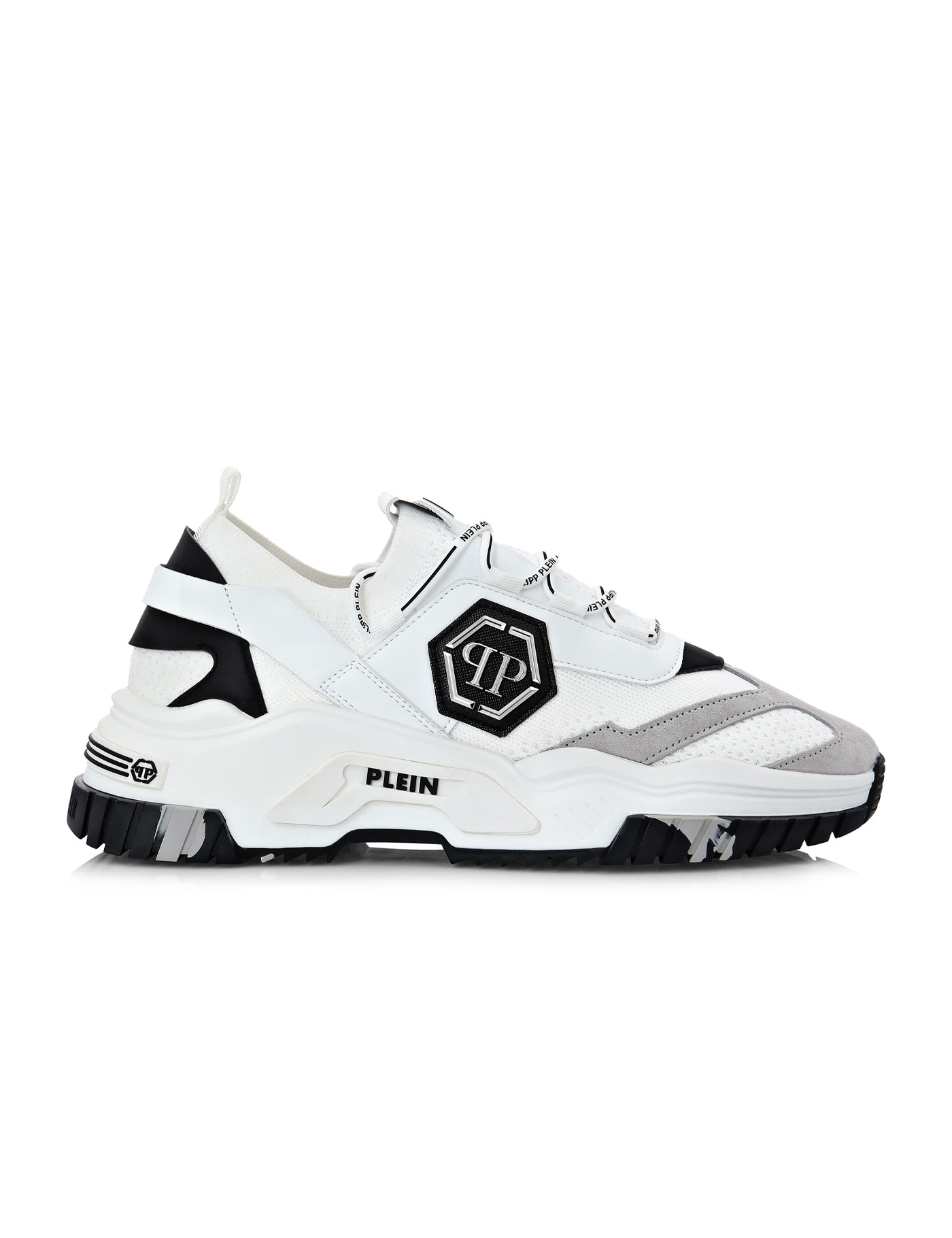 Calfskin Trainer Predator Sneakers by Philipp Plein, paneled design, elongated toe on front, front closure with contrasting logo laces, patch with iconic three-dimensional brand logo applied on side panels, suede details, logo insole and high sole.
