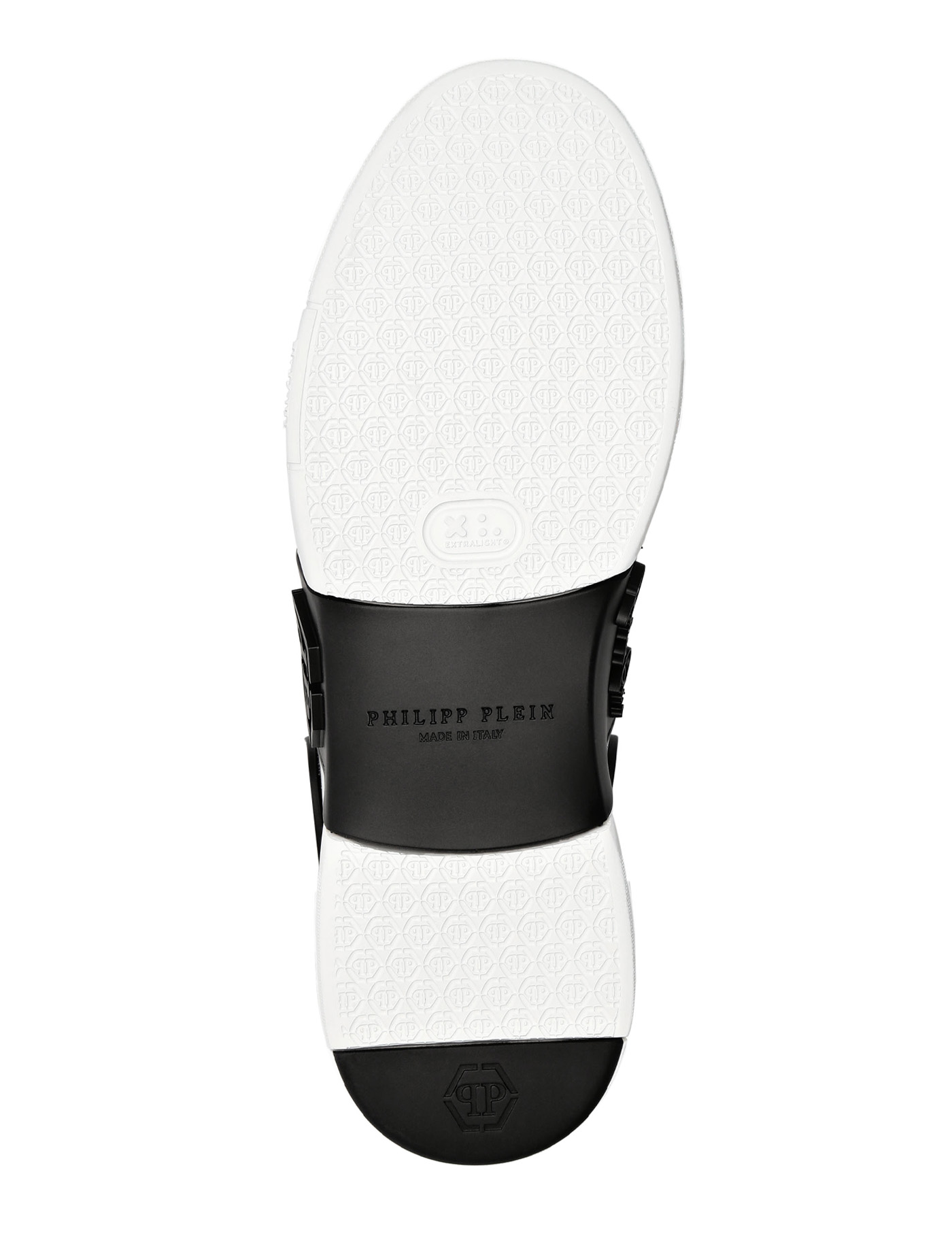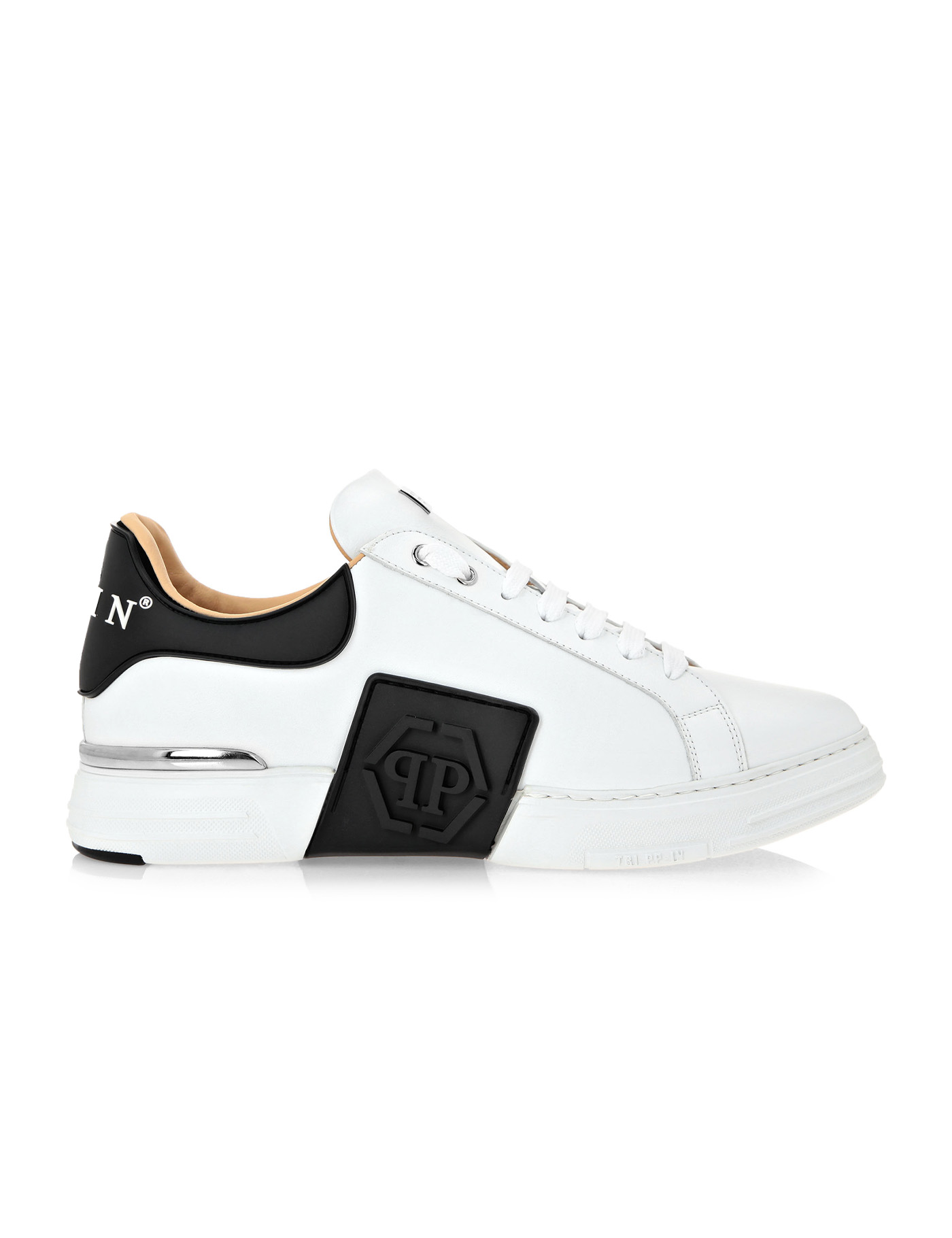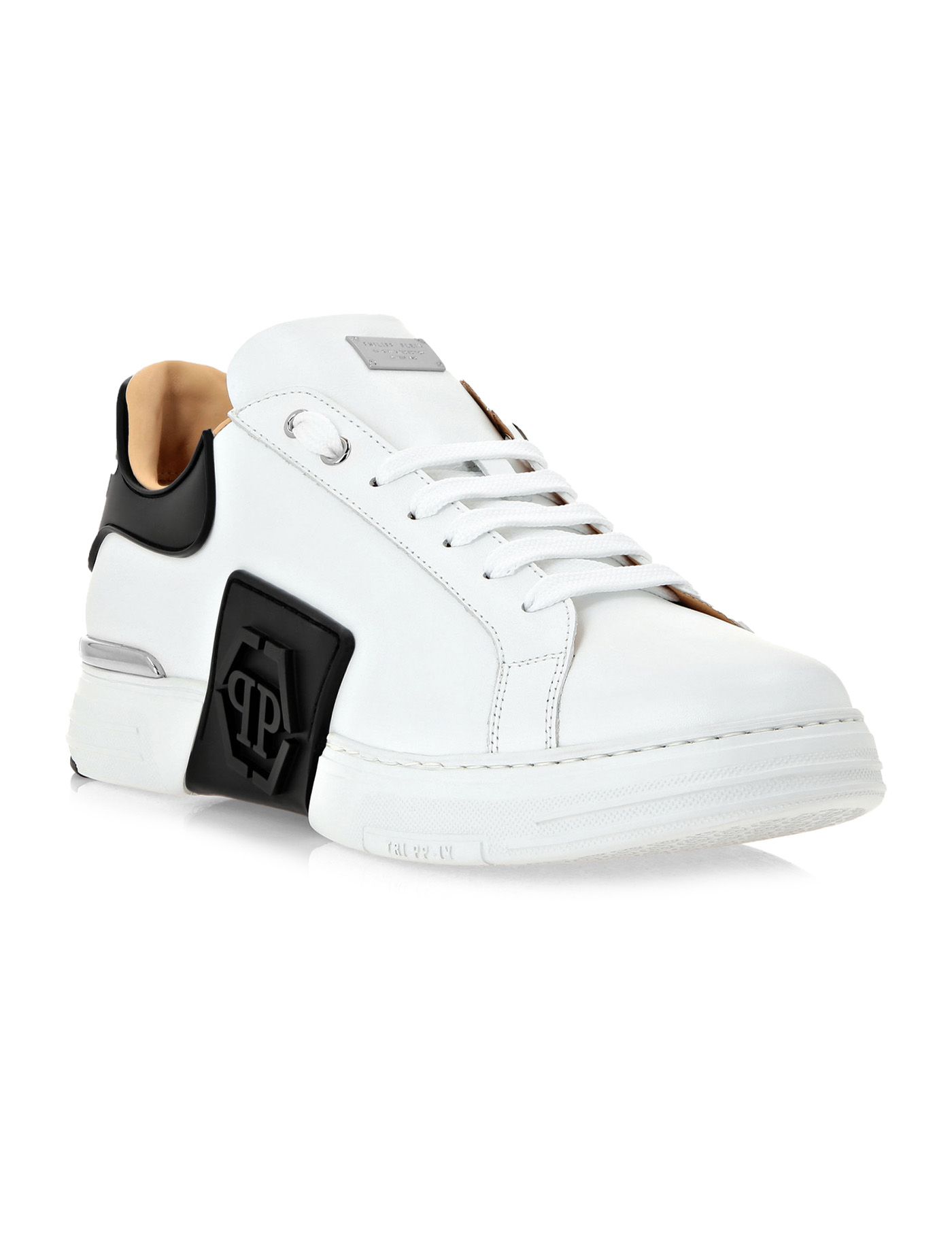 Calfskin Hexagon Sneakers by Philipp Plein, lace-up front fastening, structured sole, round toe, side panels with brand signature and embossed tone-on-tone brand logo, brand signature plaque applied to front metal tongue. brand signature on heel in contrasting embossed pattern.