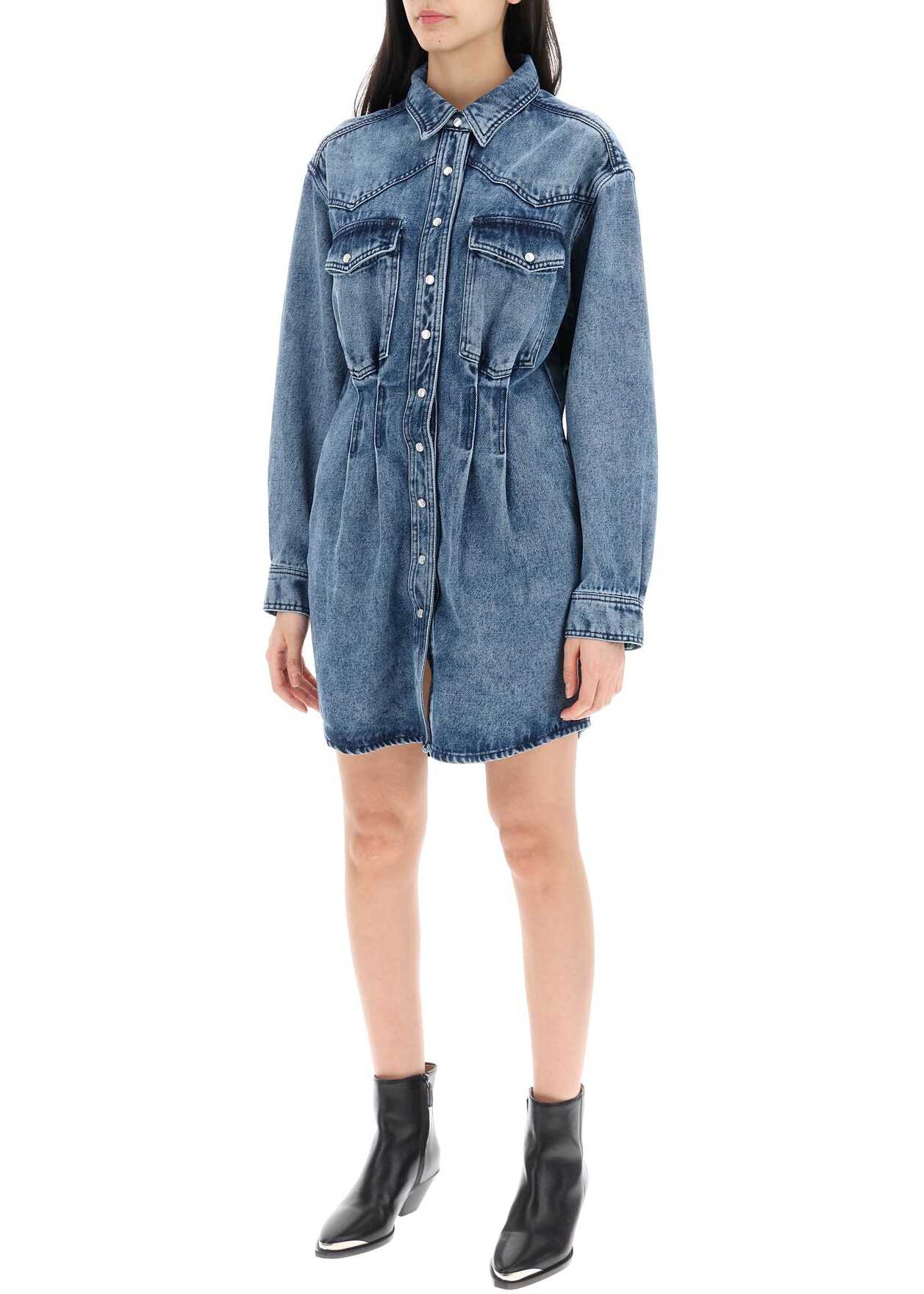 The Liliko mini dress by Isabel Marant is made of lightened cotton blend denim. The chemisier style features a curved hem, classic collar, front button closure, long sleeves with double button cuffs, flap pockets on the hips and chest. The regular silhouette is defined by pleated details at the waist. Unlined. The model is 177 cm tall and wears size FR 36.