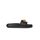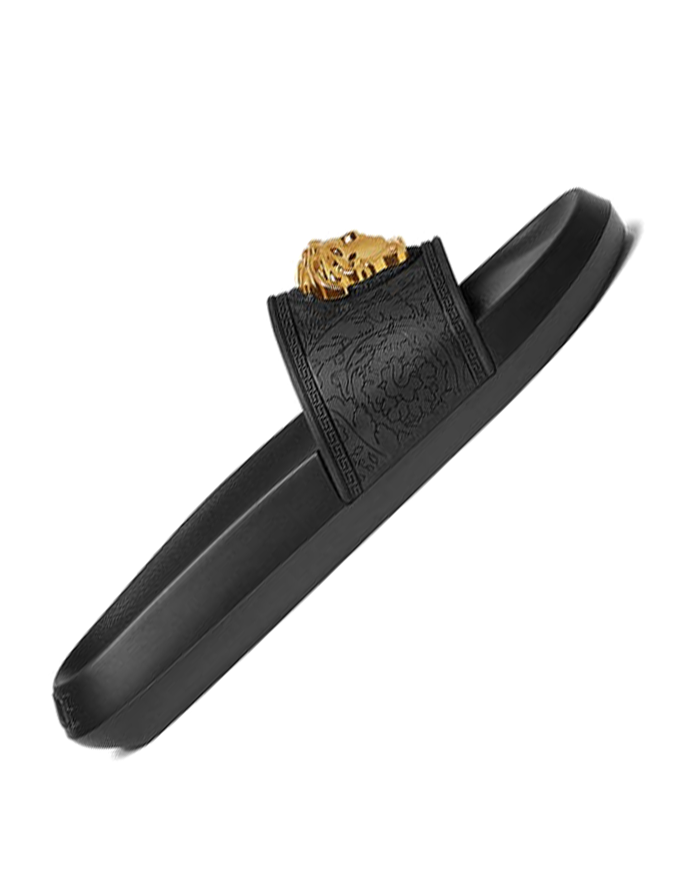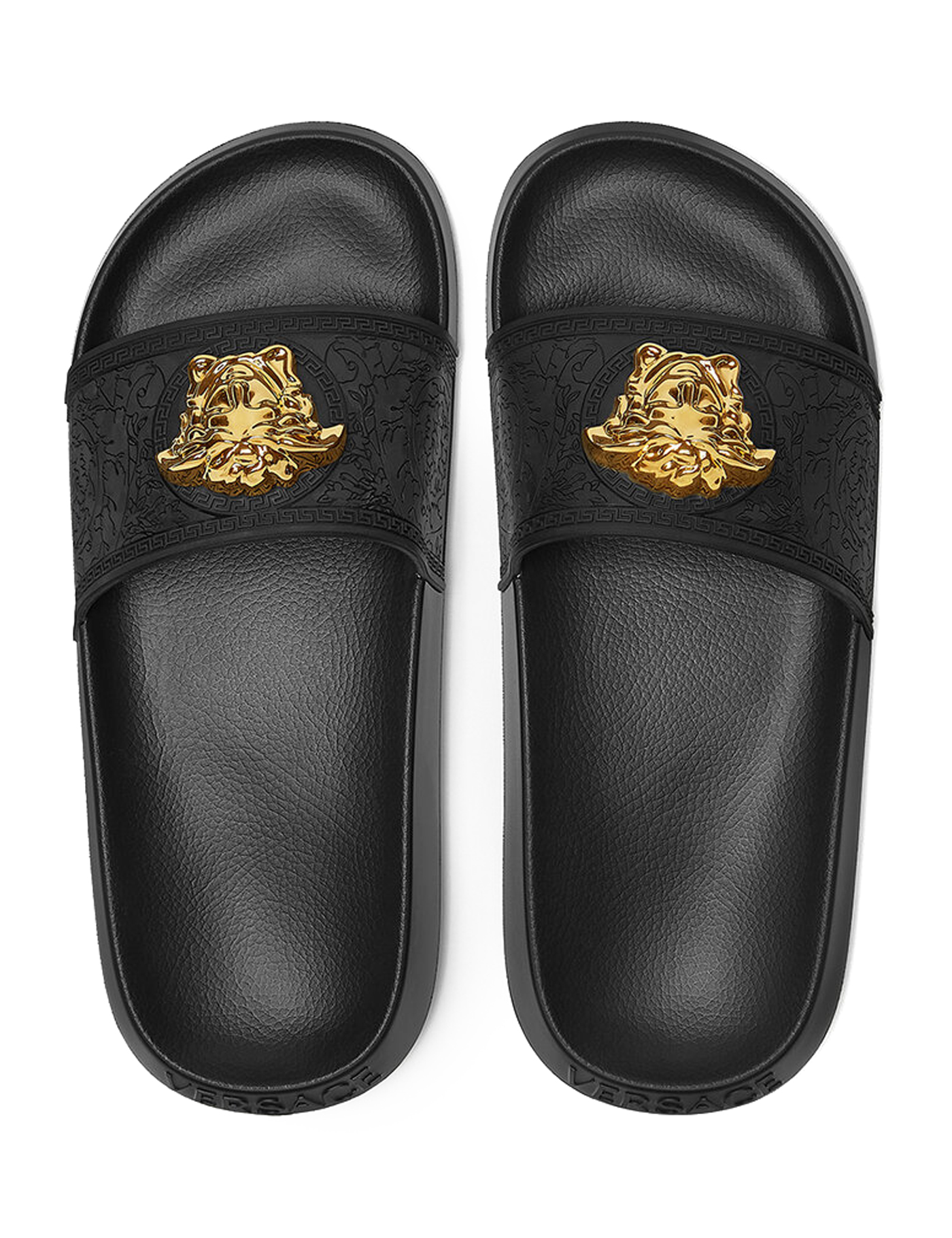 Sandals by Versace, flat sole, round toe, gold-plated iconic Medusa head plaque embossed on front strap.