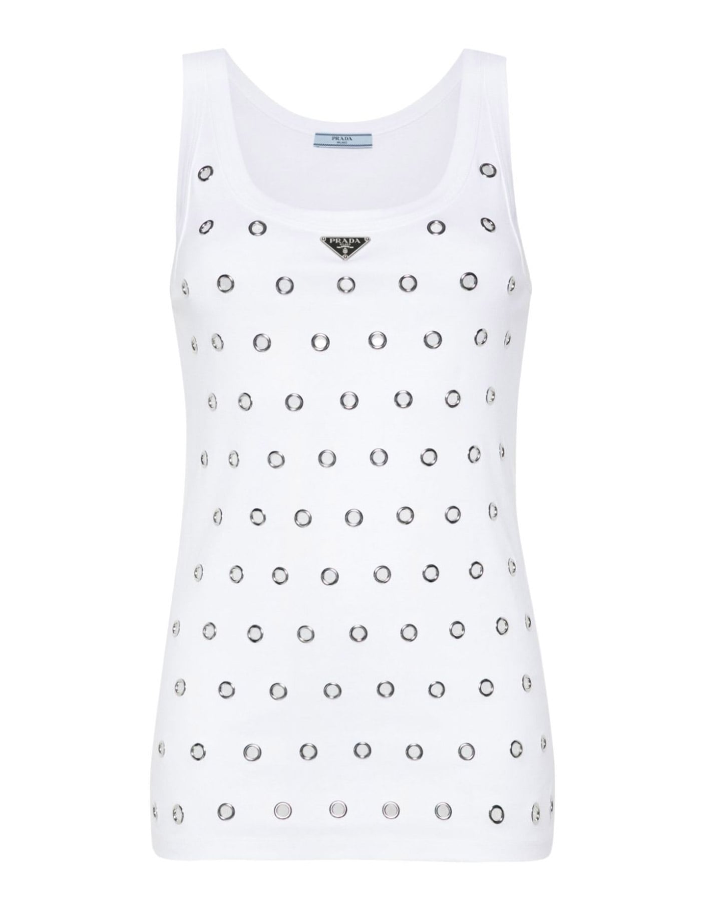 Cotton Cut-Out Top by Prada, sleeveless design, iconic enameled triangular brand signature plaque applied at front neckline, all-over applied metallic round cut-out effect detail.