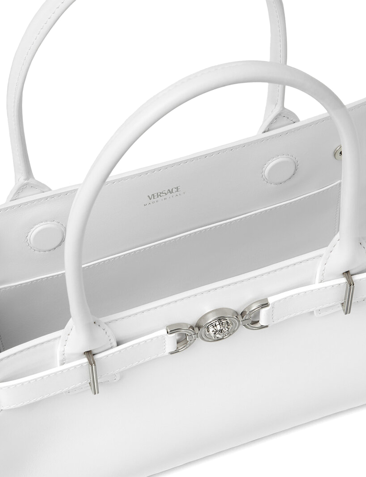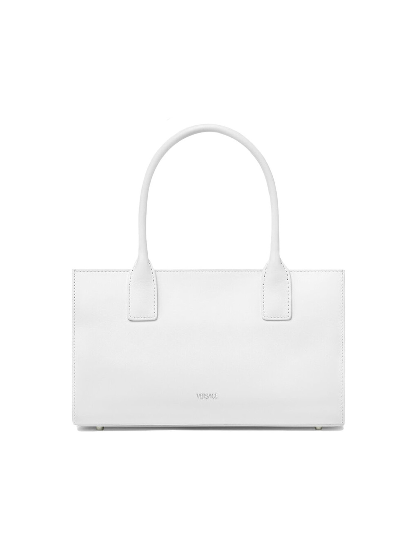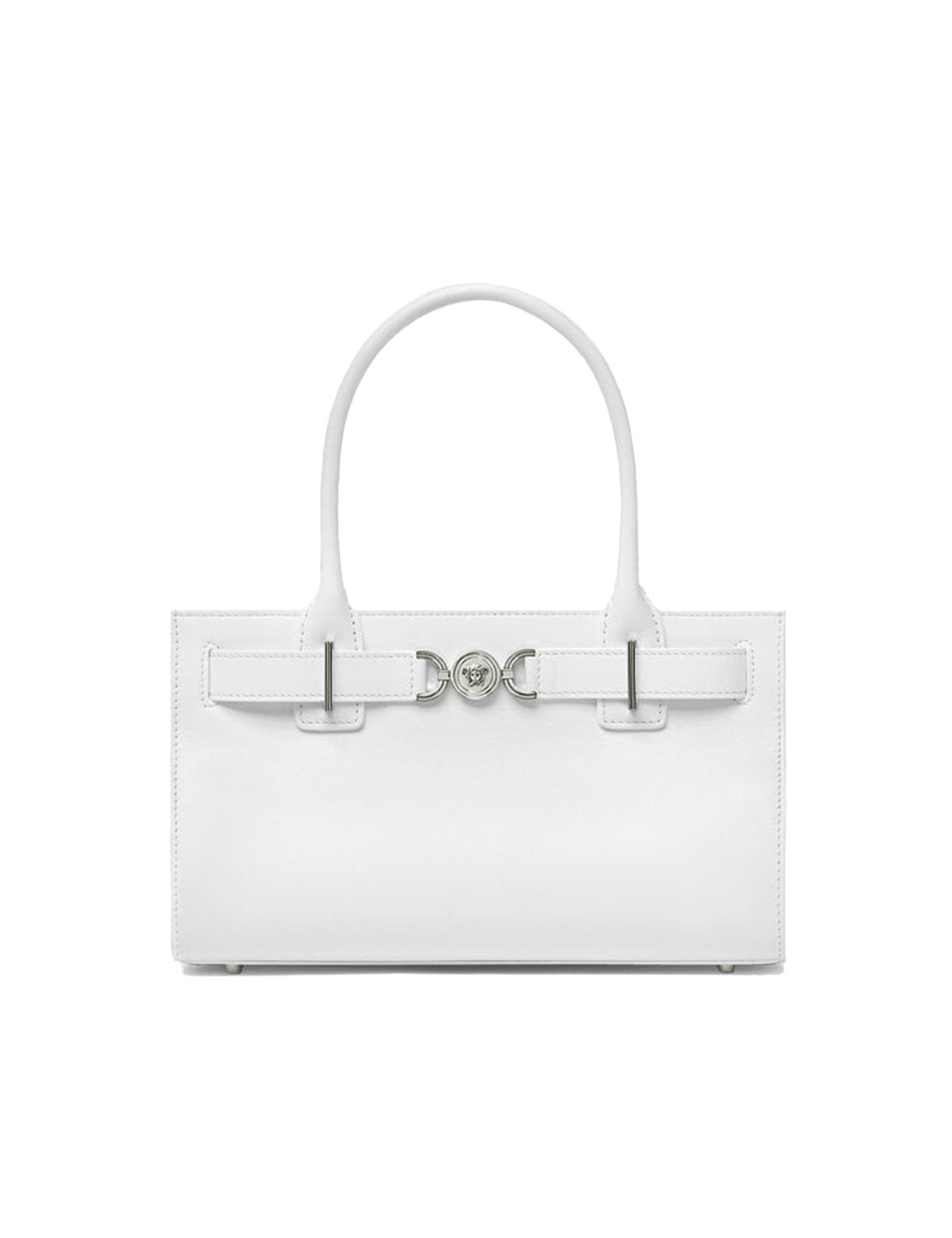 VERSACE LEATHER MEDUSA '95 HANDBAG, CLOSURE AT TOP BY TWIST-TOP ZIPPER WITH DOUBLE SLIDER, TWO TUBULAR TOP HANDLES, SINGLE INTERIOR COMPARTMENT, THREE-DIMENSIONAL MAXI PLAQUE DETAIL WITH ICONIC MEDUSA HEAD APPLIED TO FRONT, REMOVABLE AND ADJUSTABLE FLAT SHOULDER STRAP, METAL SUPPORT FEET APPLIED TO BASE OF BAG.