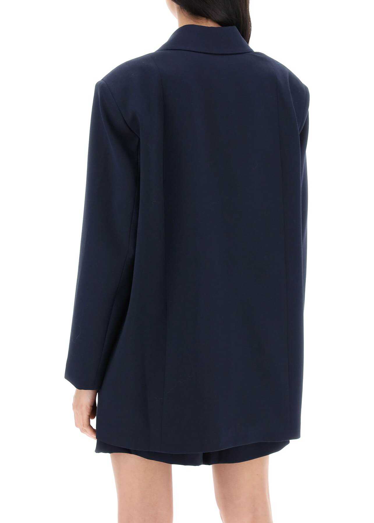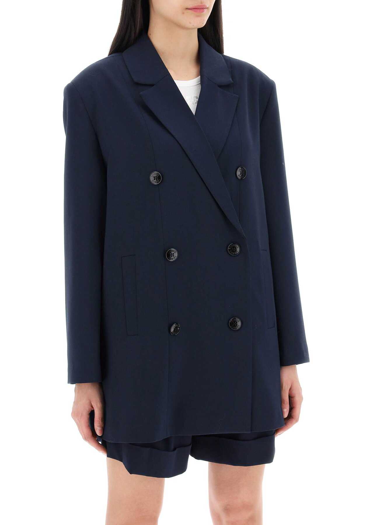 This GANNI double-breasted blazer has an oversized fit and is made from sustainable stretch viscose gabardine. It features a classic lapel, structured shoulders, branded button closure, and front flap pockets. The model is 177 cm tall and wears size S/M.