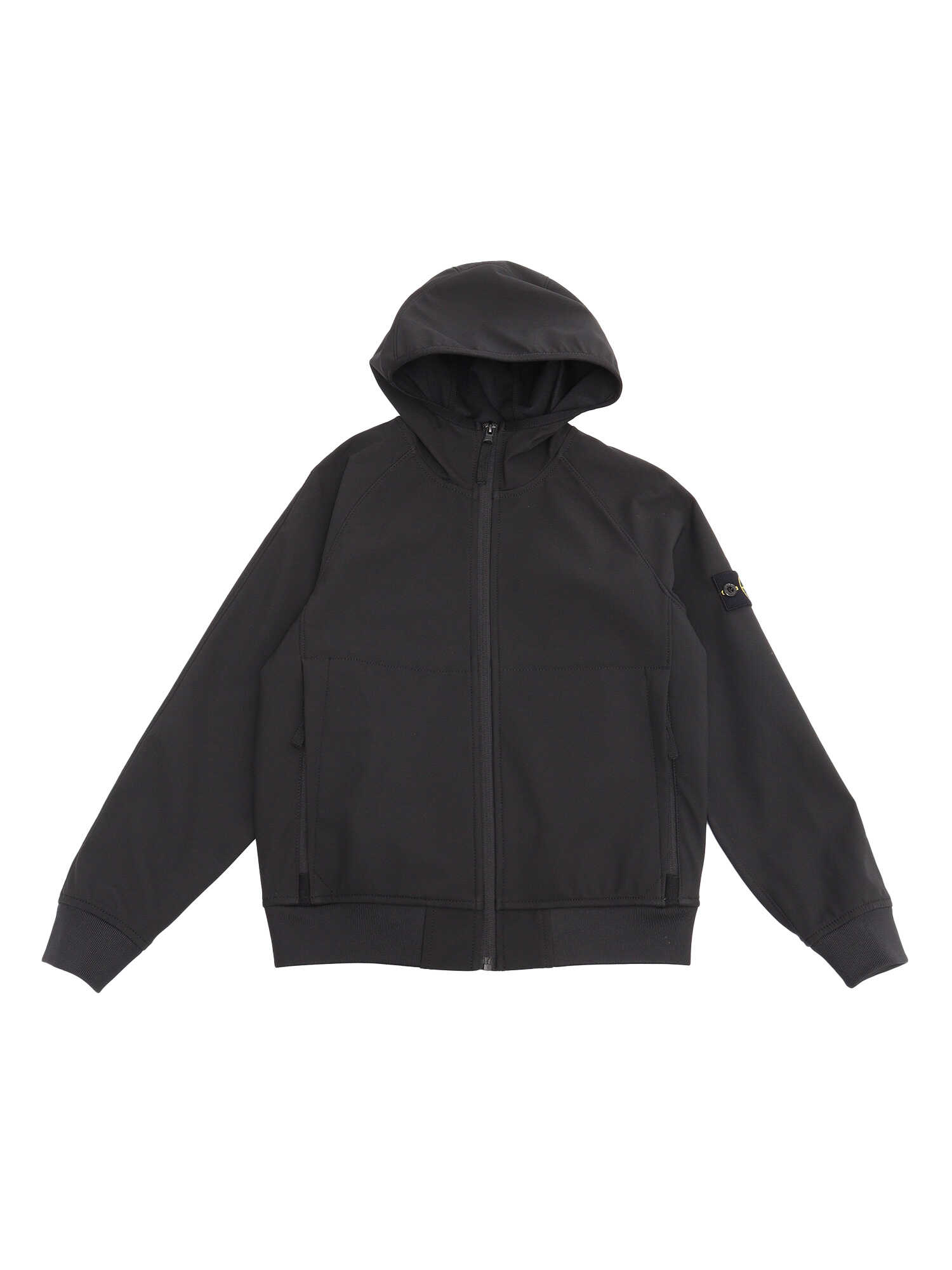 Stone Island black children's jacket with hood, zip closure, welt pockets with zip, logo plate on the sleeve.