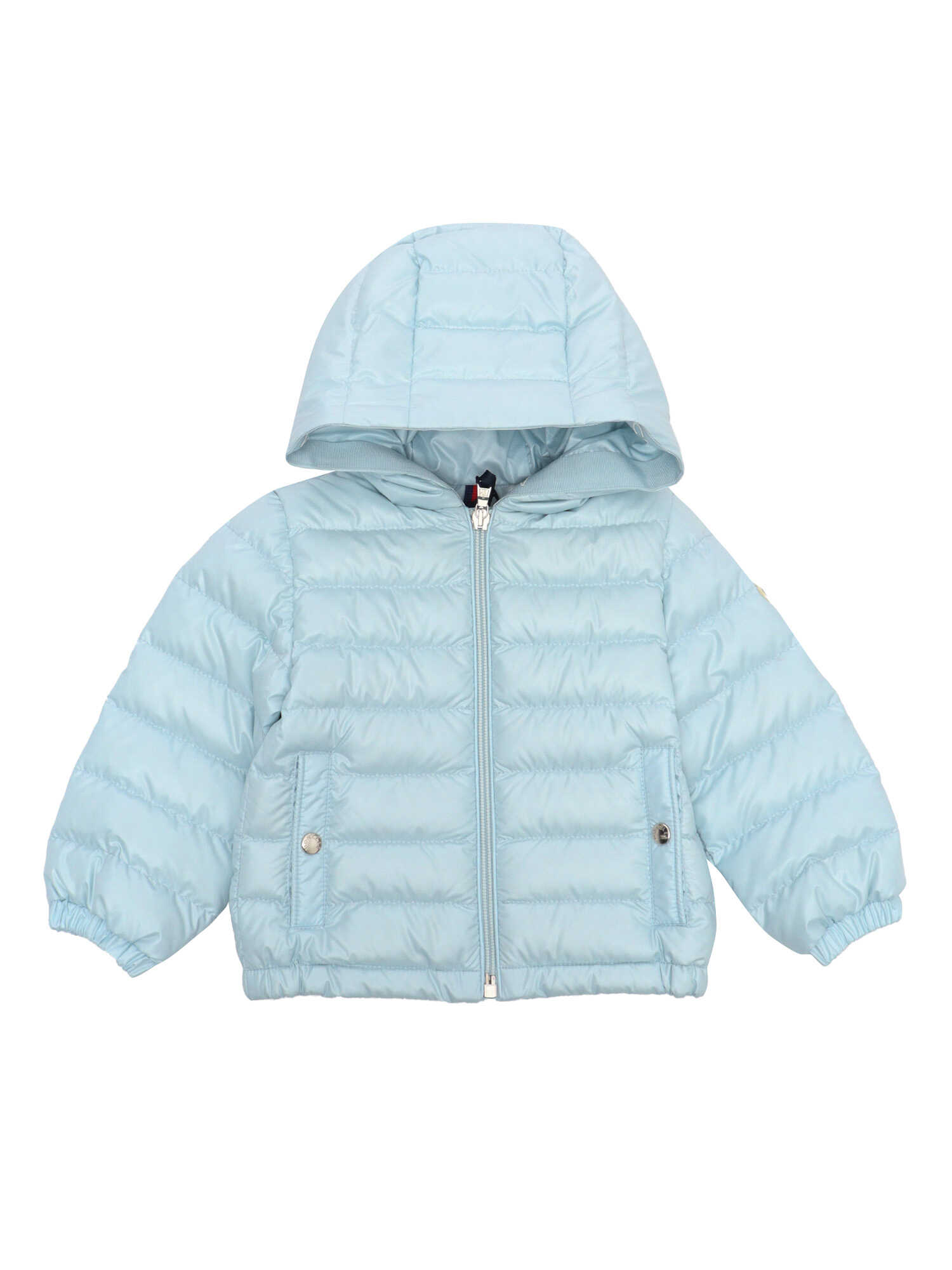 Light blue Sesen down jacket for children with hood, welt pockets with clip button, logo plate on the sleeve.