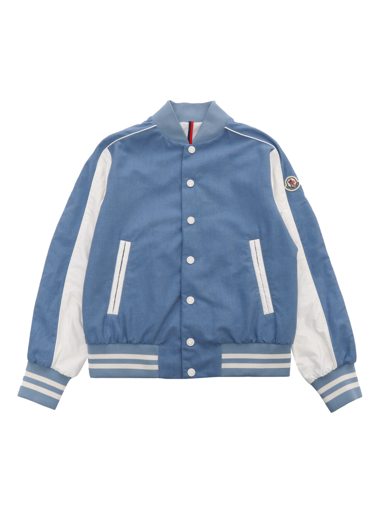 Moncler light blue Kobby bomber jacket for children with contrasting front buttoning, slanted pockets, elastic hem with web stripes, contrasting under sleeve, logo plate on the sleeve.