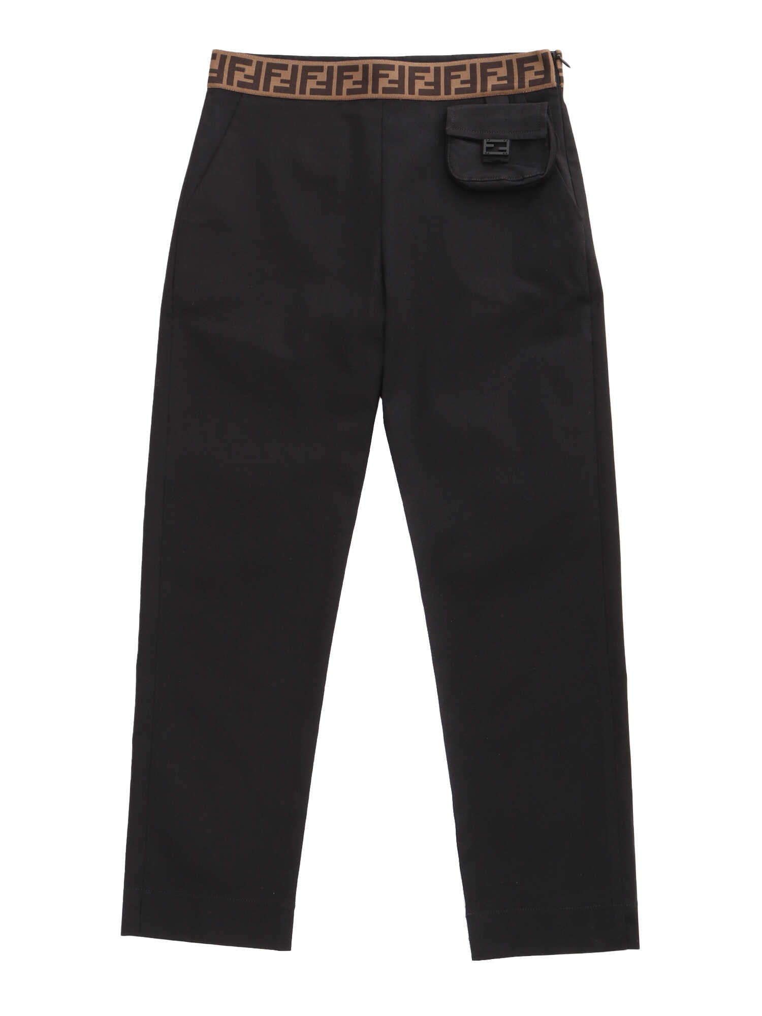 Black gabardine trousers with contrasting FF logo strap, tone-on-tone front mini baguette, straight leg.