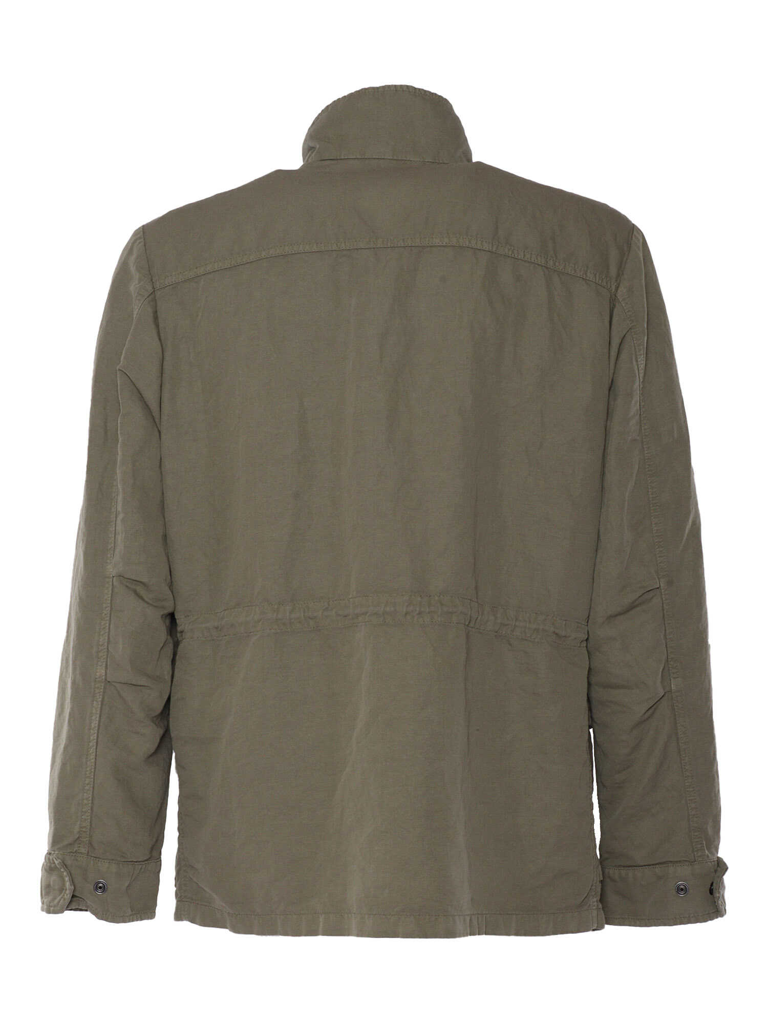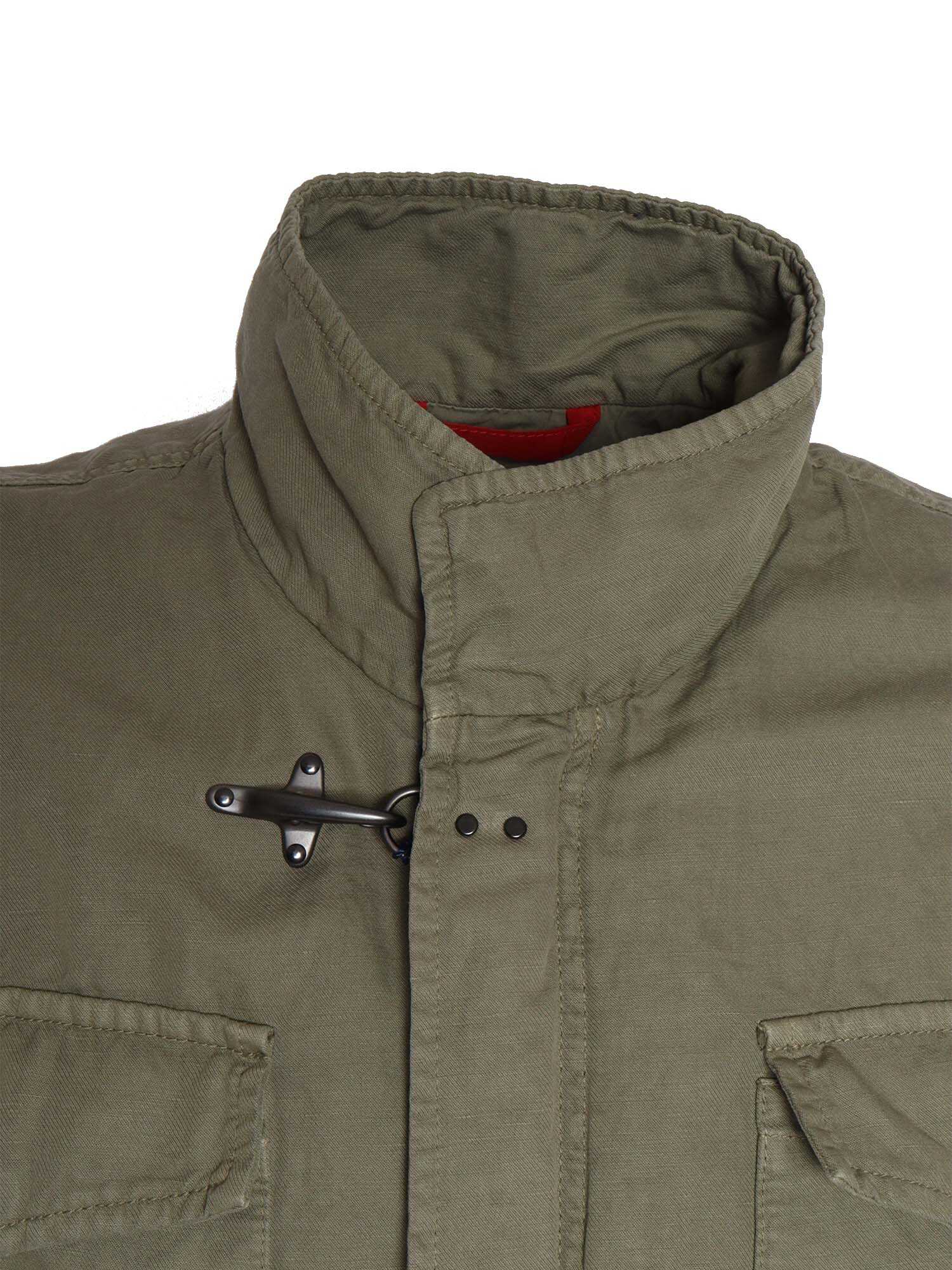Fay men's military green Field jacket with high collar, hook, patch pockets on the front, in cotton and linen blend.