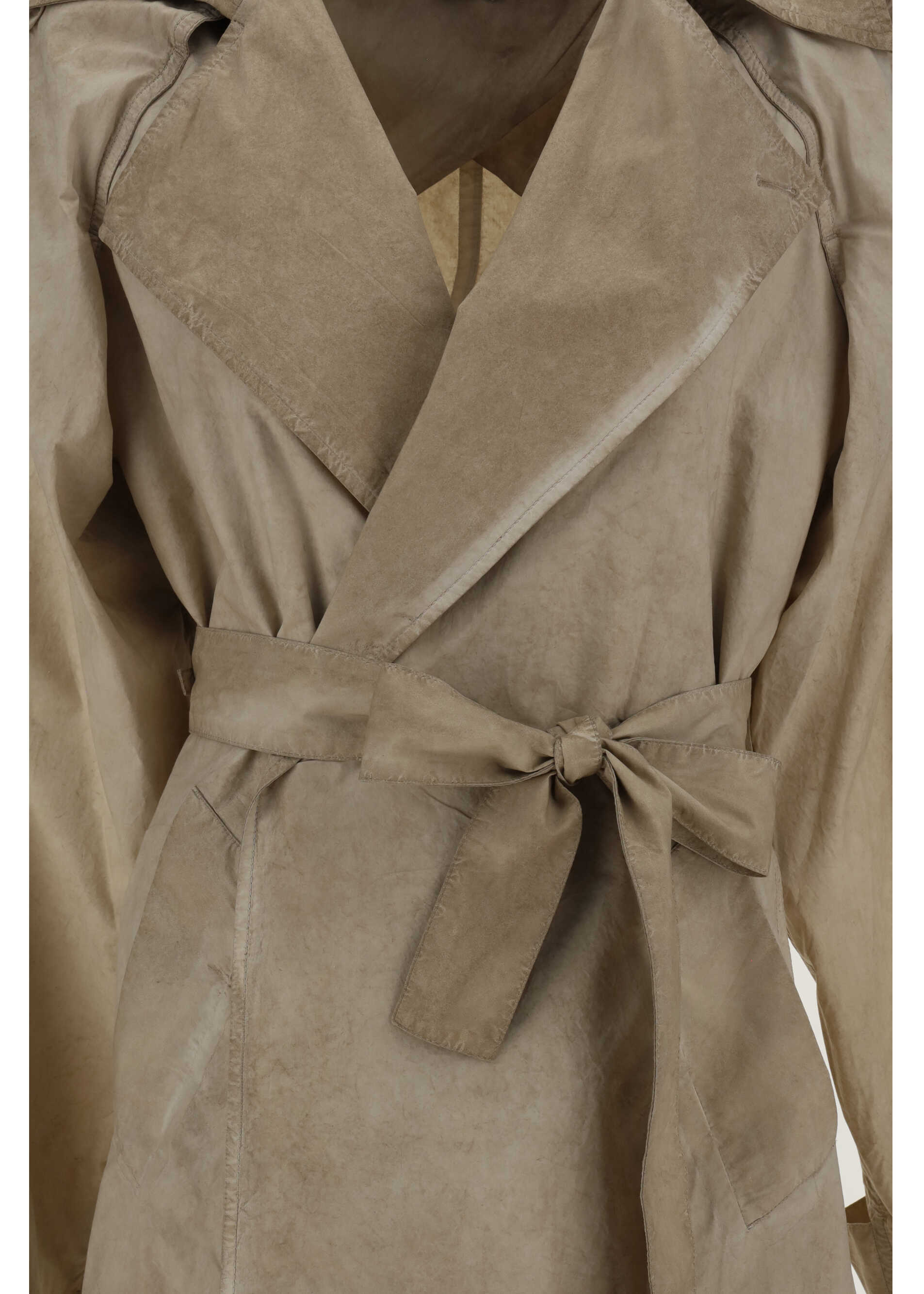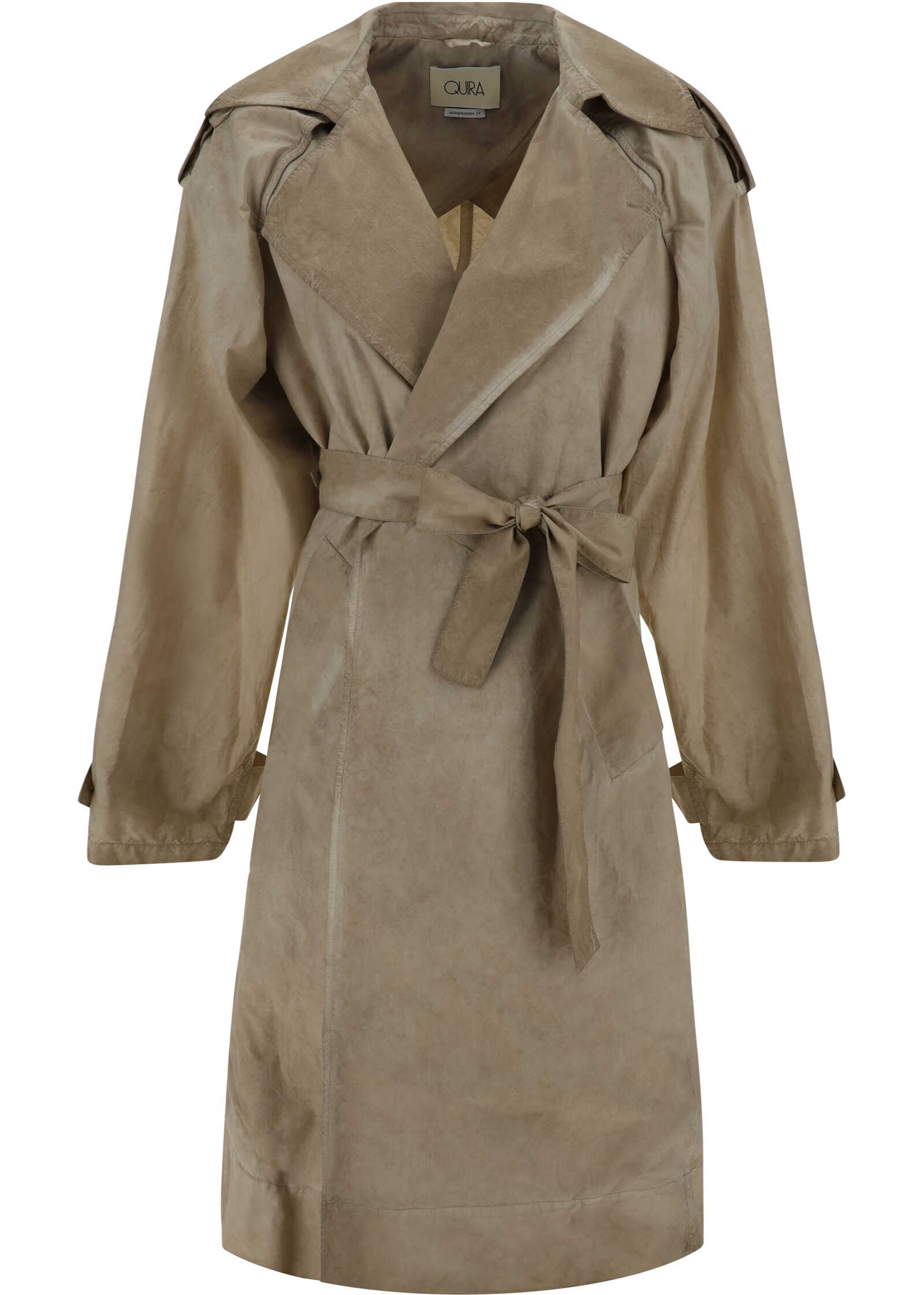 Oversized Trench Jacket by Quira, double-breasted closure by matching sash to tie waistband, wide geometric lapels, two side slit pockets, foot-length pattern.