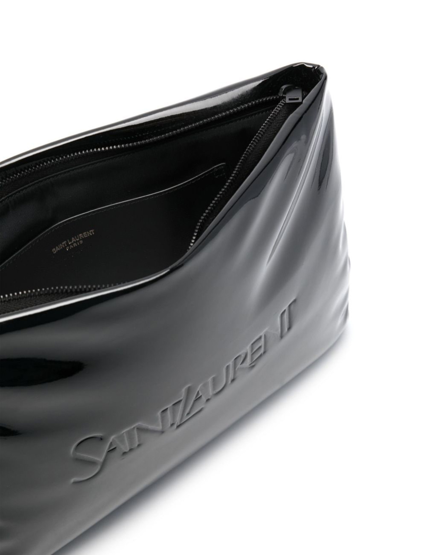 Black large Puffy pouch from Saint Laurent featuring matte black hardware, zip closure, canvas lining and two flat pockets.