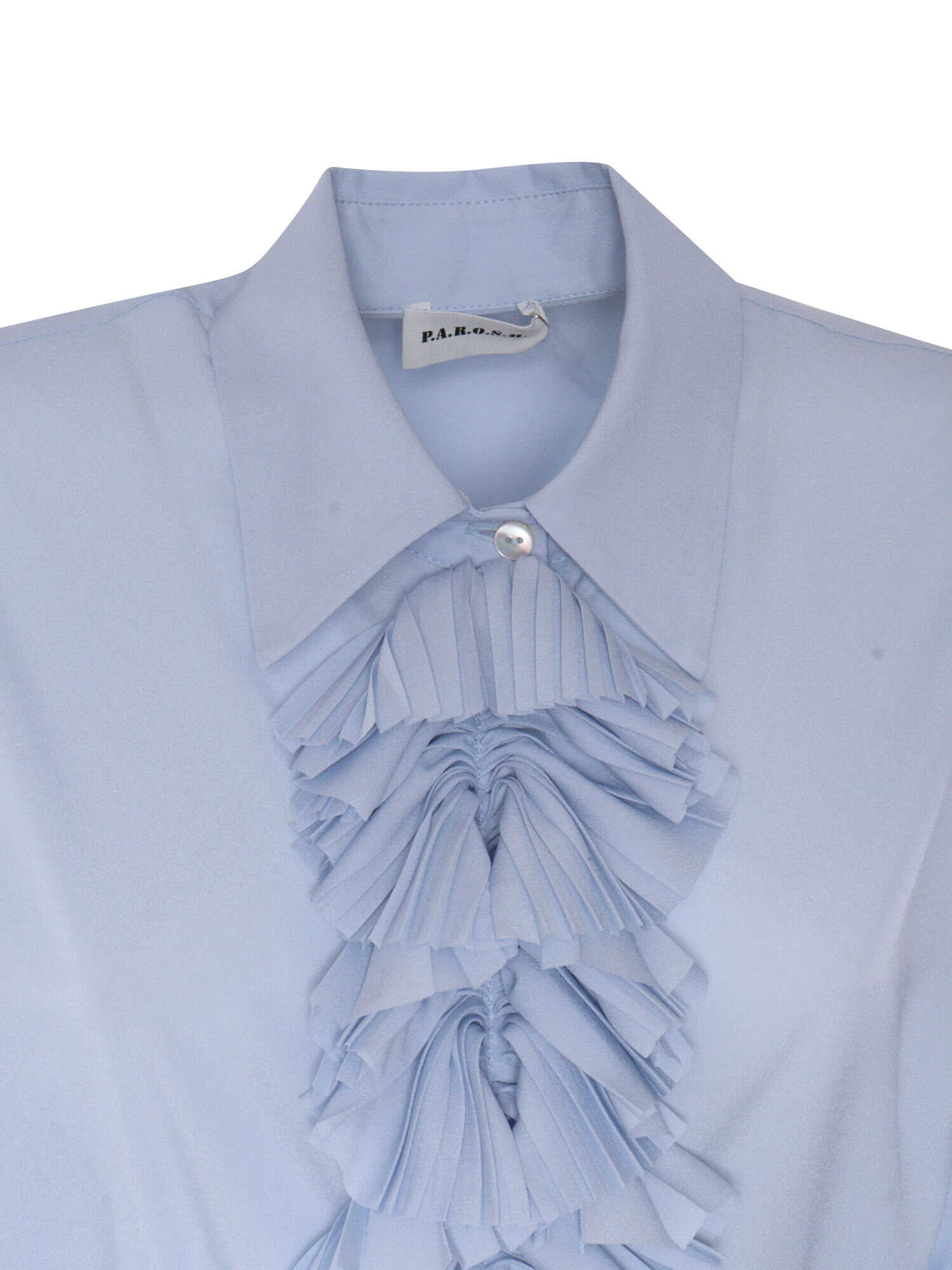 Light blue polyester shirt with ruffles on the front button, raglan sleeves, thin belt at the waist for a slim fit
