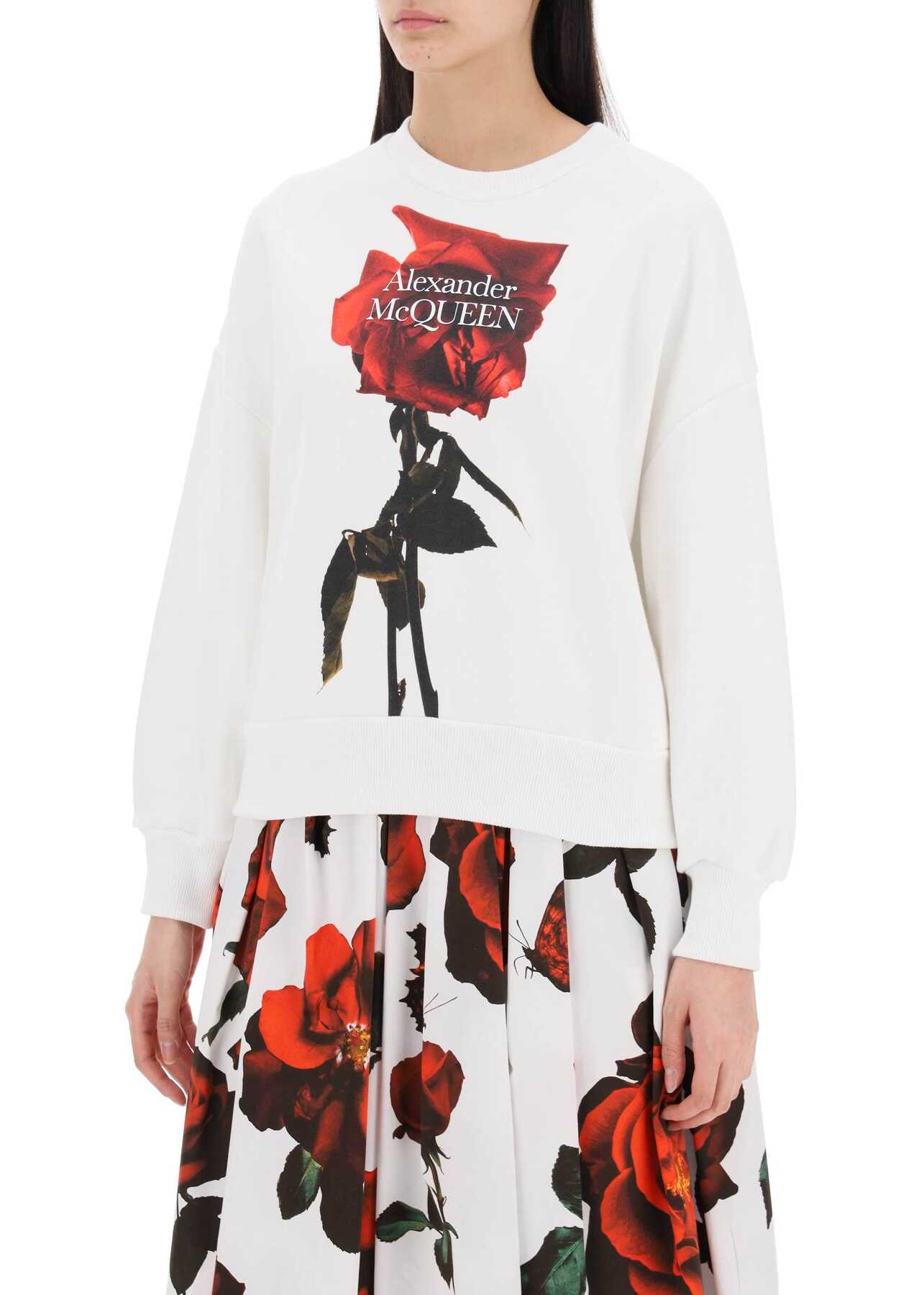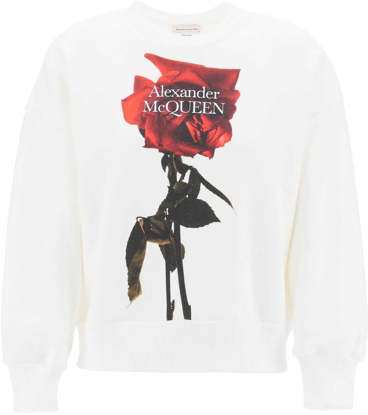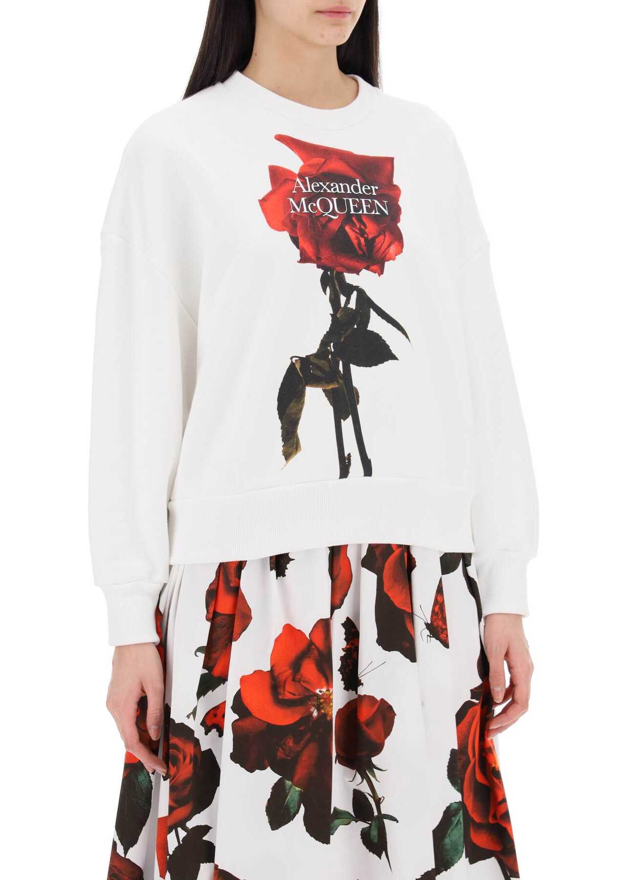 This Alexander McQueen sweatshirt is made of pure brushed cotton jersey. The design features a crew neck, ribbed cuffs and hem, and is personalized with a Shadow Rose print and logo on the front. It has a boxy fit with cocoon sleeves. The model is 177 cm tall and wears an IT size 38.