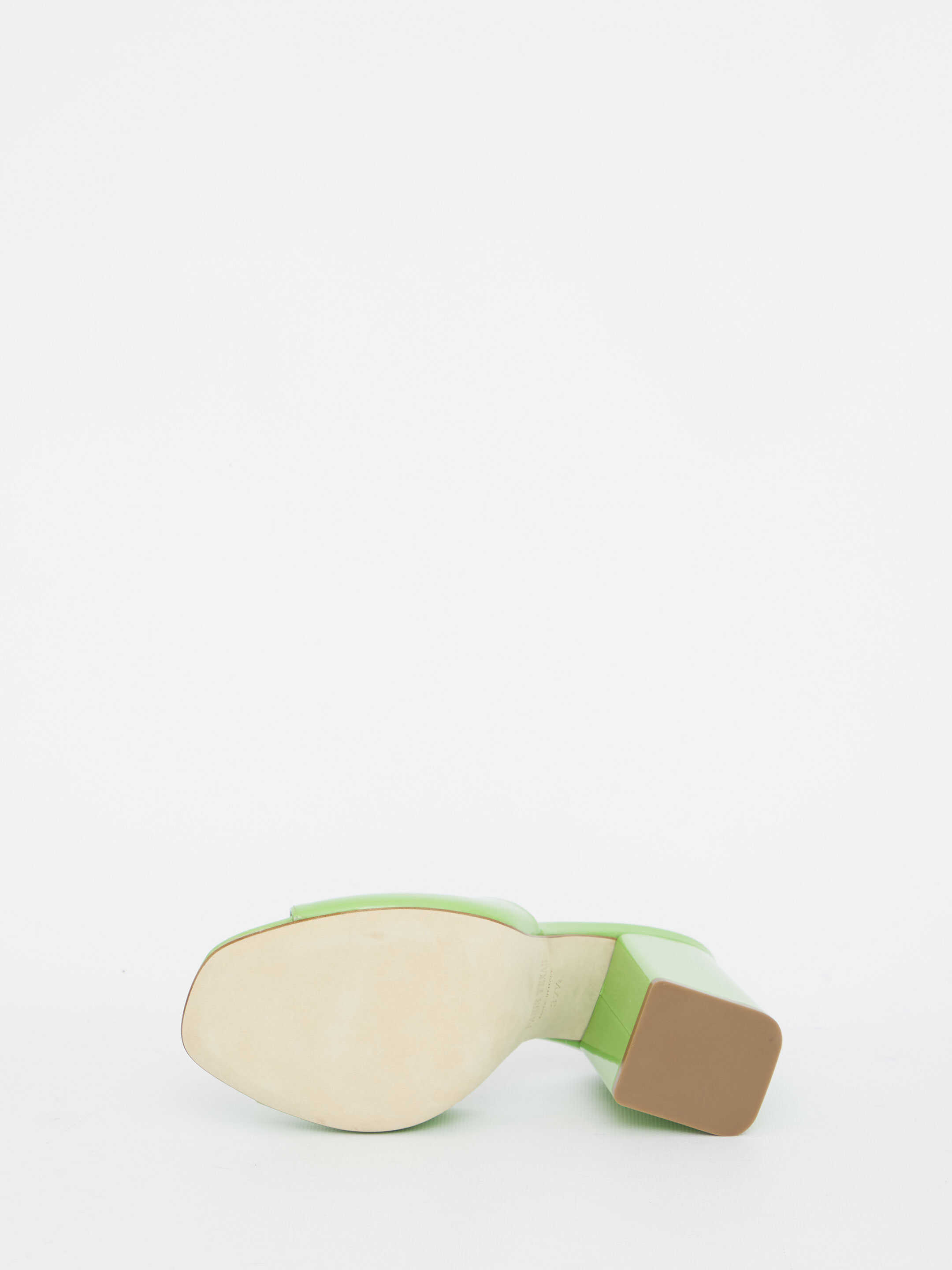 Anja sandals in green patent leather. They feature open toe, embossed Paris Texas logo on the insole, block heel and suede sole.