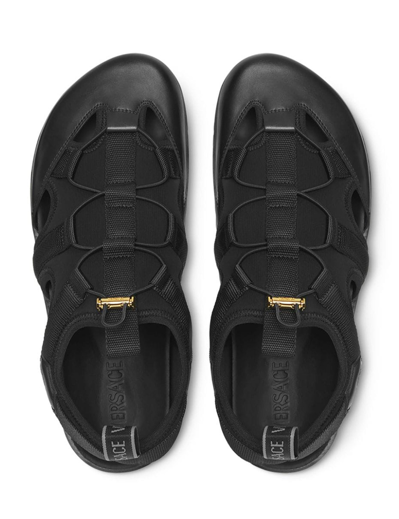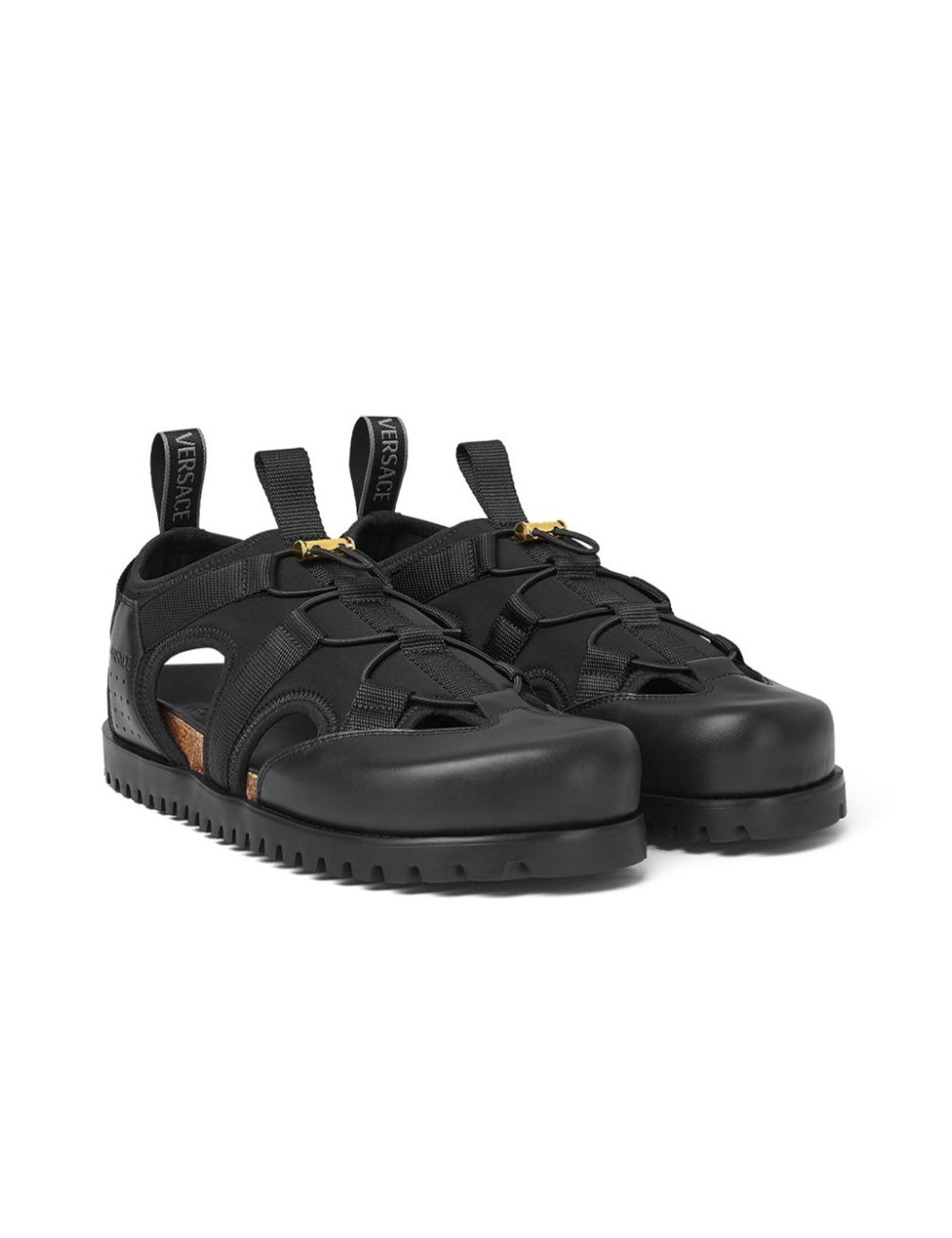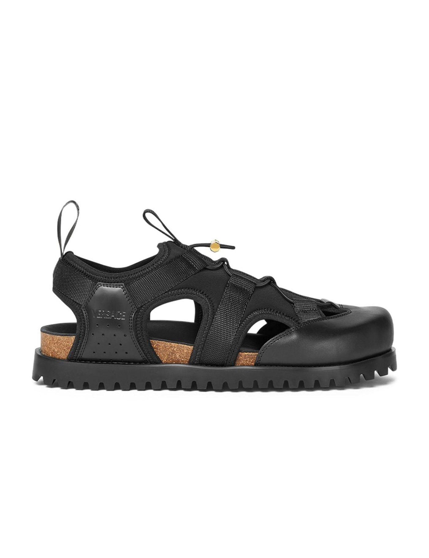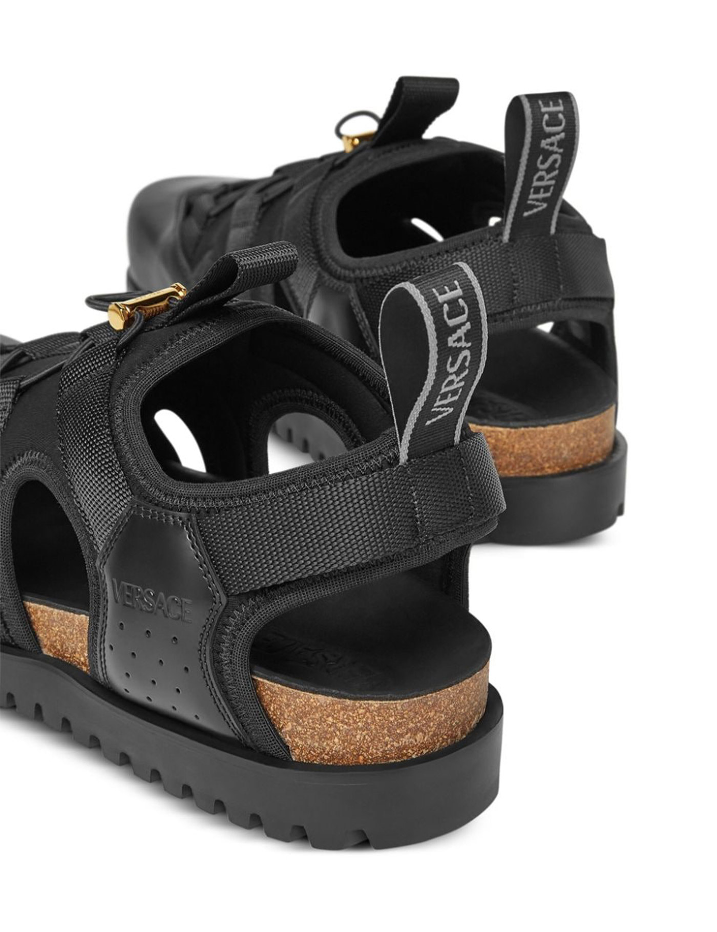Versace cage sandals inspired by trekking, made of nylon with smooth leather inserts and featuring an anatomical cork insole. They have a one-pull drawstring, logo printed on the side, pull tab on the tongue and heel, nylon and leather lining, and a serrated rubber sole with Medusa imprint on the bottom.