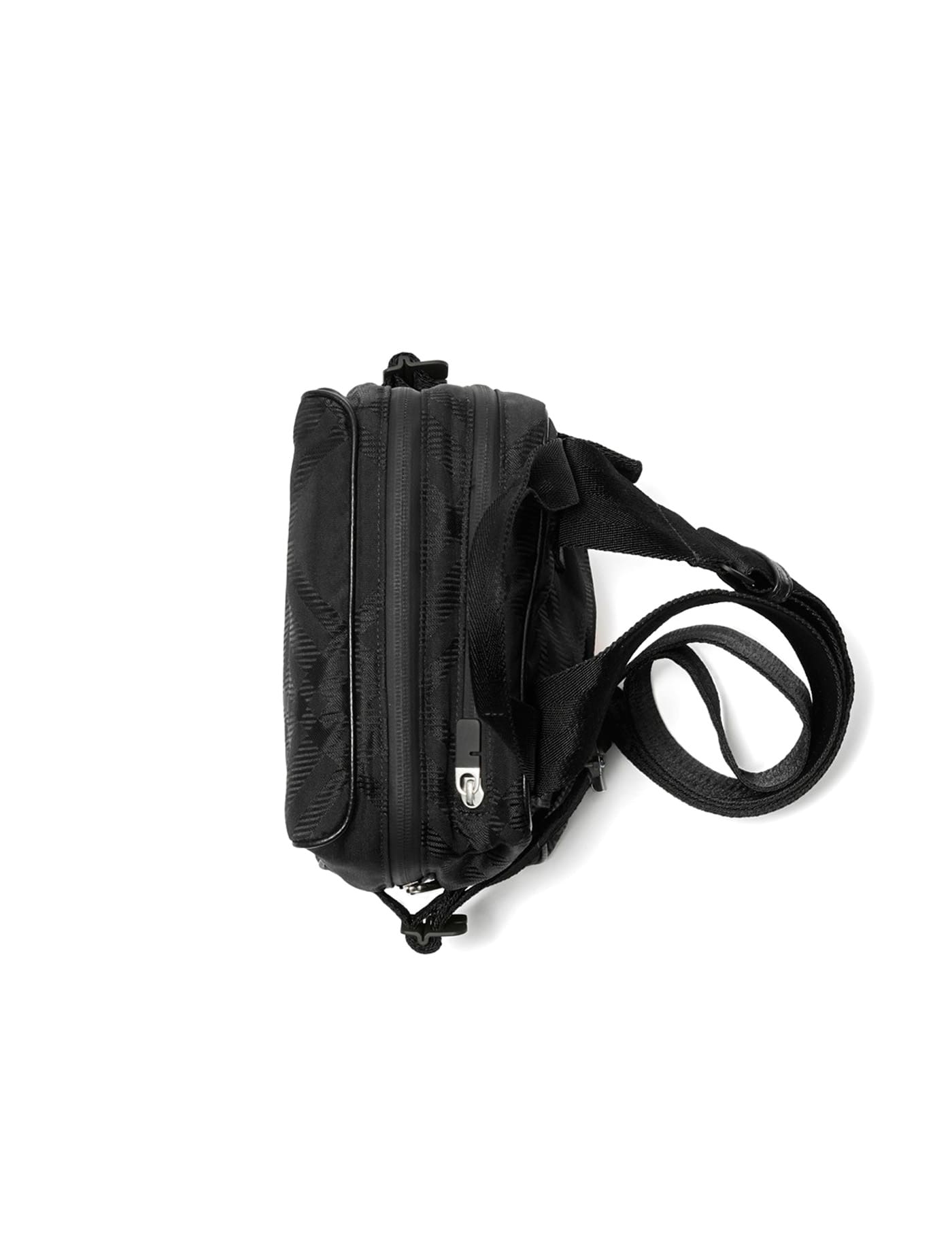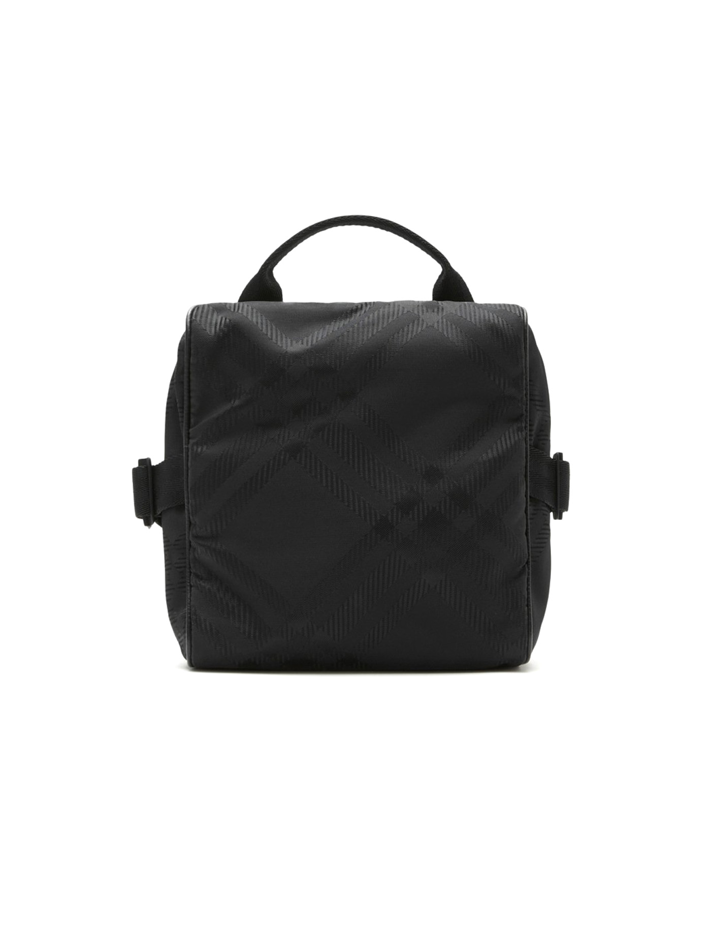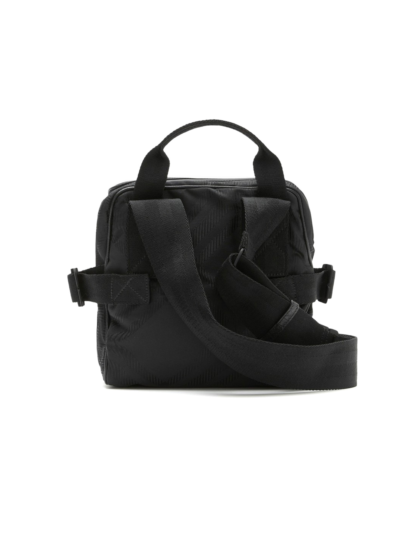 This Burberry crossbody bag is made of nylon with a jacquard Check pattern and features a boxy shape. It has two compartments with hidden zip closures, one of which has an internal pocket. The sides have adjustable straps and the shoulder strap can be adjusted with a ribbon. The metal hardware matches the tone of the bag.