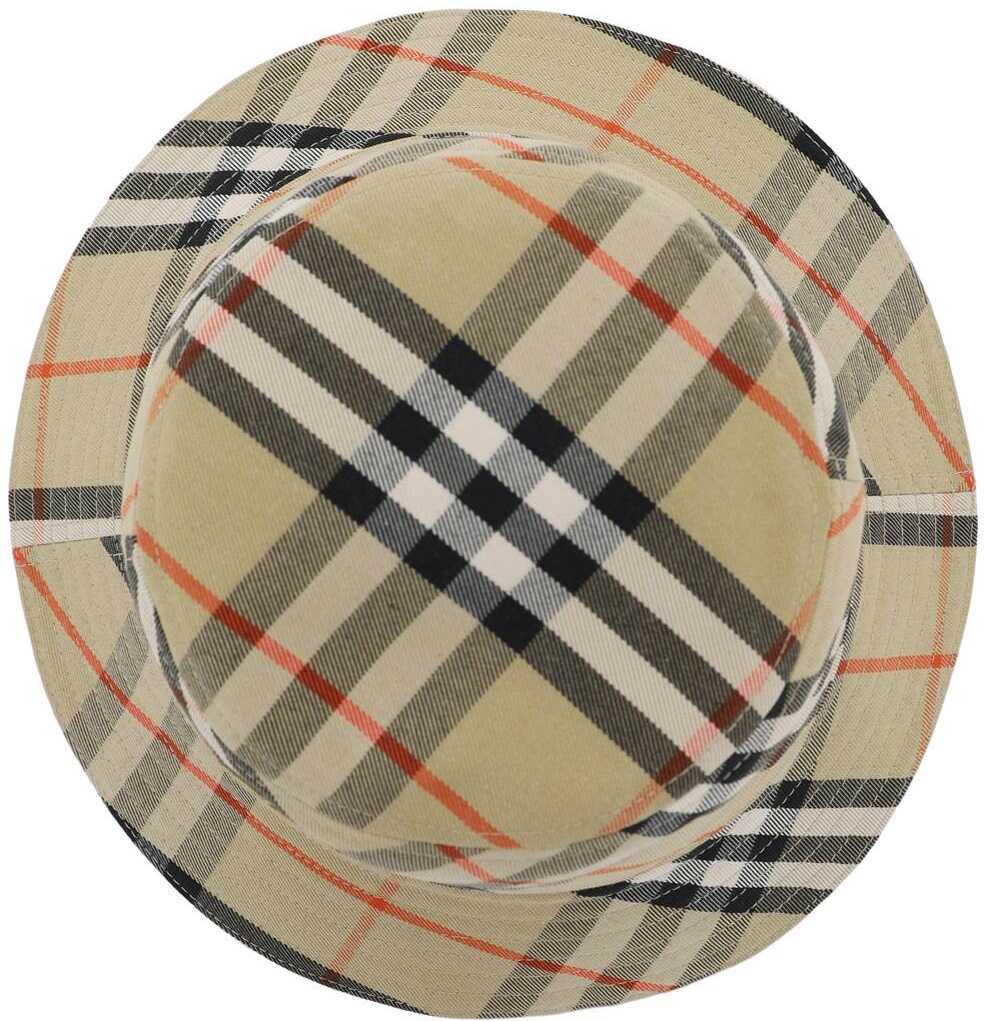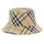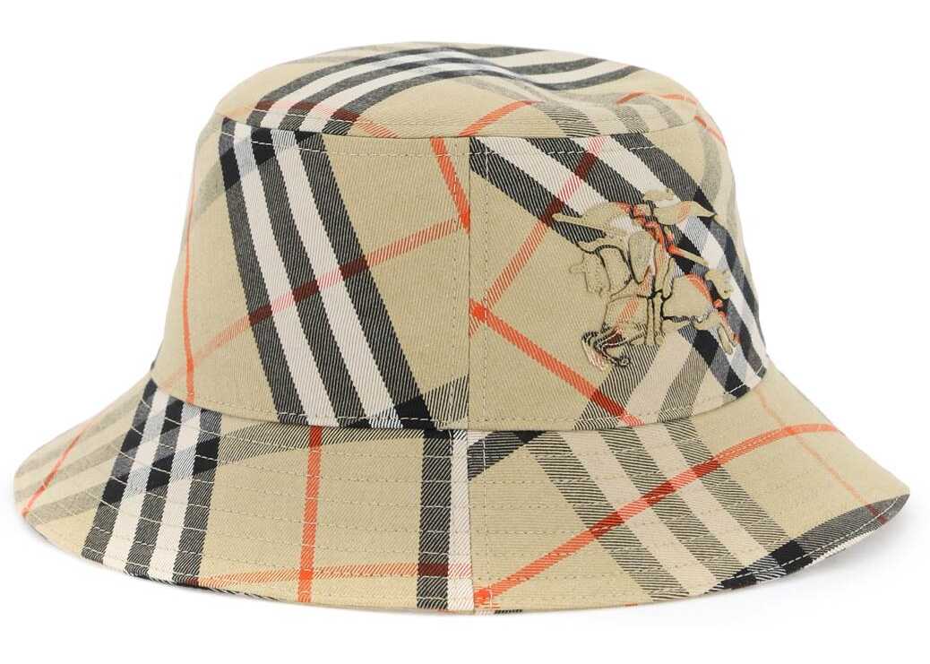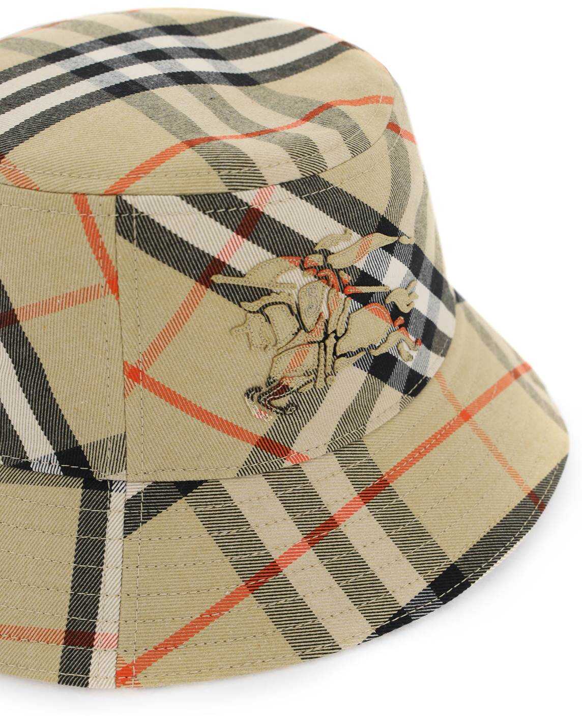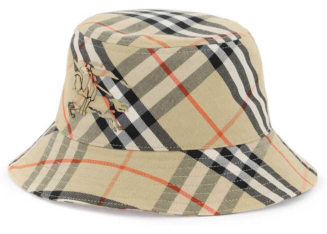 This bucket hat is made of a cotton blend drill fabric with an interwoven Burberry Check pattern and adorned with an Equestrian Knight Design patch in fabric. The brim is stitched and the hat is unlined. The item shown in the photo is size M.